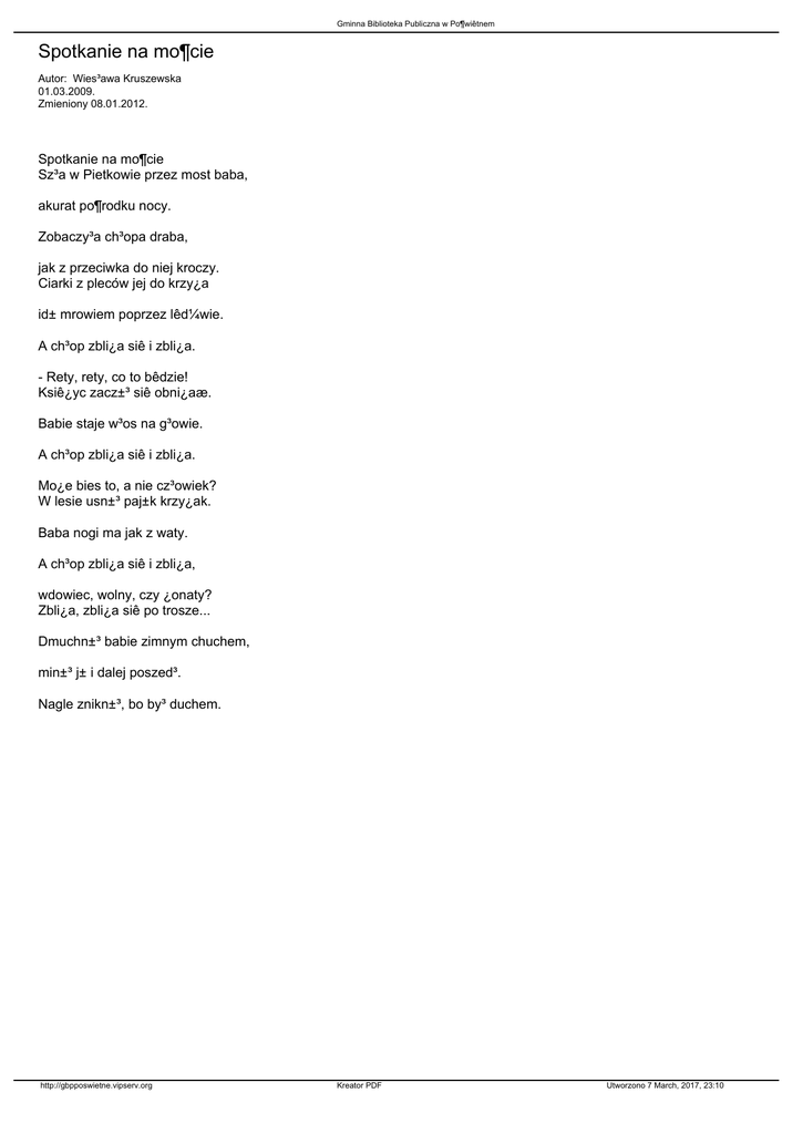 Gminna Biblioteka Publiczna w Po¶wiêtnem Spotkanie na mo¶cie Autor: Wies³awa Kruszewska 01.03.2009. Zmieniony 08.01.2012. Spotkanie na mo¶cie Sz³a w Pietkowie przez most baba, akurat po¶rodku nocy. Zobaczy³a ch³opa draba, jak z przeciwka do niej kroczy. Ciarki z pleców jej do krzy¿a id± mrowiem poprzez lêd¼wie. A ch³op zbli¿a siê i zbli¿a. - Rety, rety, co to bêdzie! Ksiê¿yc zacz±³ siê obni¿aæ. Babie staje w³os na g³owie. A ch³op zbli¿a siê i zbli¿a. Mo¿e bies to, a nie cz³owiek? W lesie usn±³ paj±k krzy¿ak. Baba nogi ma jak z waty. A ch³op zbli¿a siê i zbli¿a, wdowiec, wolny, czy ¿onaty? Zbli¿a, zbli¿a siê po trosze... Dmuchn±³ babie zimnym chuchem, min±³ j± i dalej poszed³. Nagle znikn±³, bo by³ duchem. http://gbpposwietne.vipserv.org Kreator PDF Utworzono 7 March, 2017, 23:10