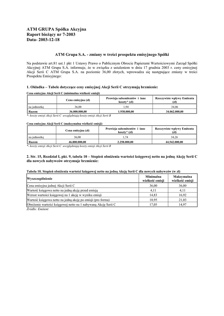 ATM GRUPA Spółka Akcyjna Raport bieżący nr 7-2003 Data- 2003-12-18 ATM Grupa S.A. - zmiany w treści prospektu emisyjnego Spółki Na podstawie art.81 ust.1 pkt 1 Ustawy Prawo o Publicznym Obrocie Papierami Wartościowymi Zarząd Spółki Akcyjnej ATM Grupa S.A. informuje, że w związku z ustaleniem w dniu 17 grudnia 2003 r. ceny emisyjnej Akcji Serii C ATM Grupa S.A. na poziomie 36,00 złotych, wprowadza się następujące zmiany w treści Prospektu Emisyjnego: 1. Okładka – Tabele dotyczące ceny emisyjnej Akcji Serii C otrzymują brzmienie: Cena emisyjna Akcji Serii C (minimalna wielkość emisji) na jednostkę Cena emisyjna (zł) Prowizja subemitentów i inne koszty* (zł) Rzeczywiste wpływy Emitenta (zł) 36,00 1,94 34,06 1.938.000,00 34.062.000,00 Prowizja subemitentów i inne koszty* (zł) Rzeczywiste wpływy Emitenta (zł) Razem 36.000.000,00 *- koszty emisji Akcji Serii C uwzględniają koszty emisji Akcji Serii B Cena emisyjna Akcji Serii C (maksymalna wielkość emisji) Cena emisyjna (zł) na jednostkę 36,00 Razem 46.800.000,00 *- koszty emisji Akcji Serii C uwzględniają koszty emisji Akcji Serii B 1,74 34,26 2.258.000,00 44.542.000,00 2. Str. 15, Rozdział I, pkt. 9, tabela 10 – Stopień obniżenia wartości księgowej netto na jedną Akcję Serii C dla nowych nabywców otrzymuje brzmienie: Tabela 10. Stopień obniżenia wartości księgowej netto na jedną Akcję Serii C dla nowych nabywców (w zł) Wyszczególnienie Cena emisyjna jednej Akcji Serii C Wartość księgowa netto na jedną akcję przed emisją Wzrost wartości księgowej na 1 akcję w wyniku emisji Wartość księgowa netto na jedną akcję po emisji (pro forma) Obniżenie wartości księgowej netto na 1 nabywaną Akcję Serii C Źródło: Emitent Minimalna wielkość emisji Maksymalna wielkość emisji 36,00 4,11 14,83 18,95 17,05 36,00 4,11 16,92 21,03 14,97 3. Str. 15, Rozdział I, pkt. 9, tabela 11 – Proporcje wkładu pieniężnego dotychczasowych i nowych akcjonariuszy otrzymuje brzmienie: Tabela 11. Proporcje wkładu pieniężnego dotychczasowych i nowych akcjonariuszy Łączny wkład pieniężny do kapitału Spółki wartość w zł procent Nabyte akcje Wyszczególnienie ilość Minimalna wielkość emisji Dotychczasowi akcjonariusze (Akcje Serii A) Nowi nabywcy (Akcje Serii B i C) – Akcje Serii B – Akcje Serii C Razem (Akcje Serii A–C) Maksymalna wielkość emisji Dotychczasowi akcjonariusze (Akcje Serii A) Nowi nabywcy (Akcje Serii B i C) – Akcje Serii B – Akcje Serii C Razem (Akcje Serii A–C) Źródło: Emitent procent Średnia cena zapłacona za 1 akcję (w zł) 1.150.000 2.150.000 1.150.000 1.000.000 3.300.000 34,85% 65,15% 34,85% 30,30% 100,00% 2.300.000 38.300.000 2.300.000 36.000.000 40.600.000 5,67% 94,33% 5,67% 88,67% 100,00% 2,00 17,81 2,00 36,00 12,30 1.150.000 2.450.000 1.150.000 1.300.000 3.600.000 31,94% 68,06% 31,94% 36,11% 100,00% 2.300.000 49.100.00 2.300.000 46.800.00 51.400.000 4,47% 95,53% 4,47% 91,05% 100,00% 2,00 20,04 2,00 36,00 14,28 4. Str. 25, Rozdział III, pkt. 1, tabela 13 – Charakterystyka Akcji Oferowanych otrzymuje brzmienie: Tabela 13. Charakterystyka Akcji Oferowanych Papiery wartościowe wg rodzajów Liczba 1 2 Wartość Cena emisyjna nominalna (w zł) (w zł) 3 4 Nadwyżka ceny emisyjnej nad wartością nominalną (w zł) 5 Szacunkowe Wpływy Emitenta prowizje i koszty (w zł) emisji (w zł) 6 7 = (2 x 4) – 6 Wariant I - minimalna wielkość emisji Akcji Serii C Akcje Serii B na jednostkę 1 Razem 1.150.000 Akcje Serii C na jednostkę 1 Razem 1.000.000 Razem Akcje Oferowane na jednostkę 1 Razem 2.150.000 2,00 2.300.000 2,00 2.300.000 0,00 0 - 2,00 2.300.000 2.00 2.000.000 36,00 36.000.000 34,00 34.000.000 1,94 1.938.000 34,06 34.062.000 2,00 4.900.000 17,81 38.300.000 15,81 33.400.000 0,90 1.938.000 16,91 36.362.000 Wariant II – maksymalna wielkość emisji Akcji Serii C Akcje Serii B na jednostkę 1 Razem 1.150.000 Akcje Serii C na jednostkę 1 Razem 1.300.000 Razem Akcje Oferowane na jednostkę 1 Razem 2.450.000 Źródło: Emitent 2,00 2.300.000 2,00 2.300.000 0,00 0 - 2,00 2.300.000 2.00 2.600.000 36,00 46.800.000 34,00 44.200.000 1,74 2.258.000 34,26 44.542.000 2,00 4.900.000 20,04 49.100.000 18,04 44.200.000 0,92 2.258.000 19,12 46.842.000