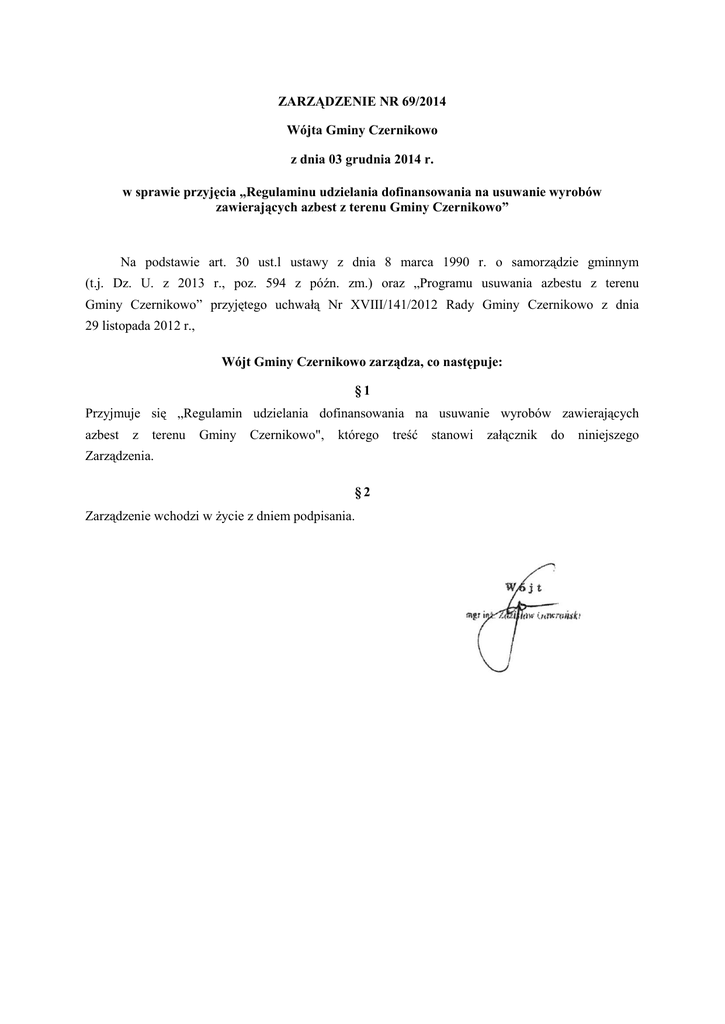 ZARZĄDZENIE NR 69/2014 Wójta Gminy Czernikowo z dnia 03 grudnia 2014 r. w sprawie przyjęcia „Regulaminu udzielania dofinansowania na usuwanie wyrobów zawierających azbest z terenu Gminy Czernikowo” Na podstawie art. 30 ust.l ustawy z dnia 8 marca 1990 r. o samorządzie gminnym (t.j. Dz. U. z 2013 r., poz. 594 z późn. zm.) oraz „Programu usuwania azbestu z terenu Gminy Czernikowo” przyjętego uchwałą Nr XVIII/141/2012 Rady Gminy Czernikowo z dnia 29 listopada 2012 r., Wójt Gminy Czernikowo zarządza, co następuje: §1 Przyjmuje się „Regulamin udzielania dofinansowania na usuwanie wyrobów zawierających azbest z terenu Gminy Czernikowo", którego Zarządzenia. §2 Zarządzenie wchodzi w życie z dniem podpisania. treść stanowi załącznik do niniejszego Załącznik nr 1 do Zarządzenia Nr 69/2014 Wójta Gminy Czernikowo z dnia 3 grudnia 2014 r. REGULAMIN udzielania dofinansowania na usuwania wyrobów zawierających azbest z terenu Gminy Czernikowo §1 1. Użyte w Regulaminie określenie „właściciel” oznacza właściciela lub użytkownika wieczystego obiektu budowlanego lub innego miejsca zawierającego azbest. 2. Użyte w Regulaminie określenie „Program” oznacza „Program usuwania azbestu z terenu Gminy Czernikowo”. 3. Użyte określenia „azbest”, „wyroby zawierające azbest” i „materiały zawierające azbest” oznaczają wyroby z azbestu rozumiane według przepisów ustawy z dnia 19 czerwca 1997 r. o zakazie stosowania wyrobów zawierających azbest (Dz. U. z 2004r. Nr 3 poz. 20 z póżn. zm.). §2 Regulamin udzielania dofinansowania na realizację usuwania wyrobów zawierających azbest z terenu Gminy Czernikowo, zwany dalej „Regulaminem”, określa zasady przyznawania dofinansowania na realizację przedsięwzięć polegających na pokryciu części kosztów związanych z demontażem, transportem i utylizacją odpadów powstałych przy likwidacji pokryć dachowym i elewacji zawierających azbest z obiektów budowlanych zlokalizowanych na terenie gminy Czernikowo. §3 1. Dofinansowanie nie pokrywa kosztów związanych z zakupem i montażem nowych pokryć dachowych i elewacji. 2. Środki na dofinansowanie pochodzić będą z Wojewódzkiego Funduszu Ochrony Środowiska i Gospodarki Wodnej w Toruniu. 3. O dofinansowanie może ubiegać się osoba fizyczna, która posiada tytuł prawny do obiektu budowlanego, zlokalizowanego na terenie Gminy Czernikowo i jest wpisana w „Program usuwania azbestu z terenu Gminy Czernikowo” oraz złoży kompletny wniosek o usunięcie wyrobów zawierających azbest a także podpisze stosowną umowę na udzielenie dofinansowania na realizację usuwania wyrobów zawierających azbest z terenu Gminy Czernikowo. 4. W przypadku posiadania innego tytułu prawnego niż własność lub użytkowanie wieczyste, do wniosku należy dołączyć zgodę właściciela nieruchomości. 5. W przypadku obiektu budowlanego, do którego prawo własności posiada kilka osób, do wniosku należy dołączyć zgodę wszystkich pozostałych właścicieli na realizację zadania. 6. Prace związane z demontażem i transportem na uprawnione składowisko odpadów mogą być wykonywane tylko przez wyspecjalizowaną firmę, posiadająca stosowne pozwolenia. 7. Wybór firmy o której mowa w pkt. 6, dokonuje Wójt Gminy Czernikowo zgodnie z Ustawą Prawo zamówień publicznych. §4 1. Dofinansowanie może być udzielone tylko na pokrycie kosztów kwalifikowanych, do których zalicza się: demontaż pokrycia dachowego lub elewacji zawierających azbest, transport odpadów niebezpiecznych z miejsca rozbiórki do miejsca unieszkodliwienia, unieszkodliwienie lub zabezpieczenie odpadów niebezpiecznych. 2. Środki finansowe na realizację Programu będą pochodzić z dotacji Wojewódzkiego Funduszu Ochrony Środowiska i Gospodarki Wodnej w Toruniu. 3. Dofinansowanie zadania określonego w ust. 1, realizowane ze środków pozyskanych z Wojewódzkiego Funduszu Ochrony Środowiska i Gospodarki Wodnej w Toruniu, udzielone będzie w formie dotacji, w wysokości do 100 % wartości kosztów kwalifikowanych. 4. Dotacja może być udzielona osobie fizycznej, na podstawie zawartej umowy na udzielenie dofinansowania na realizację usuwania wyrobów zawierających azbest z terenu Gminy Czernikowo, pod warunkiem że jest ona ujęta w „Program usuwania azbestu z terenu Gminy Czernikowo”. 5. Wysokość dofinansowania zadania, o którym mowa w ust. 3, może ulec zmianie na zasadach określonych przez Wojewódzki Fundusz Ochrony Środowiska i Gospodarki Wodnej w Toruniu. §5 1. Pomoc finansowa skierowana jest do właścicieli obiektów budowlanych z wbudowanymi wyrobami zawierającymi azbest oraz posiadających takie wyroby, które powstały przy likwidacji lub wymianie elementów pokryć dachowych lub elewacji z nieruchomości leżącej na terenie gminy Czernikowo. 2. Do uzyskania dofinansowania na realizację Programu uprawnieni są właściciele, którzy przedłożyli informację o wyrobach zawierających azbest Wójtowi Gminy Czernikowo. 3. Właściciel zobowiązany jest, w zależności od charakteru wykonywanych prac, zgłosić lub uzyskać na nie stosowne pozwolenie z Wydziału Architektury i Budownictwa Starostwa Toruńskiego. 4. Dotacja nie obejmuje podmiotów, które we własnym zakresie dokonały czynności przekazania do unieszkodliwienia wyrobów zawierających azbest. 6. Dotacja nie obejmuje kosztów zakupu i montażu pokryć dachowych zastępujących wyroby zawierające azbest oraz pozostałych kosztów nie związanych z wykonywaniem usług, o których mowa w § 3 ust. 1 Regulaminu. §6 1. Podstawą do dofinansowania przedsięwzięcia jest złożenie wniosku w Urzędzie Gminy Czernikowo, na obowiązującym formularzu stanowiącym załącznik nr 1 do niniejszego Regulaminu. 2. Druk wniosku dostępny w Urzędzie Gminy Czernikowo lub ze strony internetowej Gminy Czernikowo: www.czemikowo.pl. 3. Do wniosku należy dołączyć odpowiednio: a) dokument