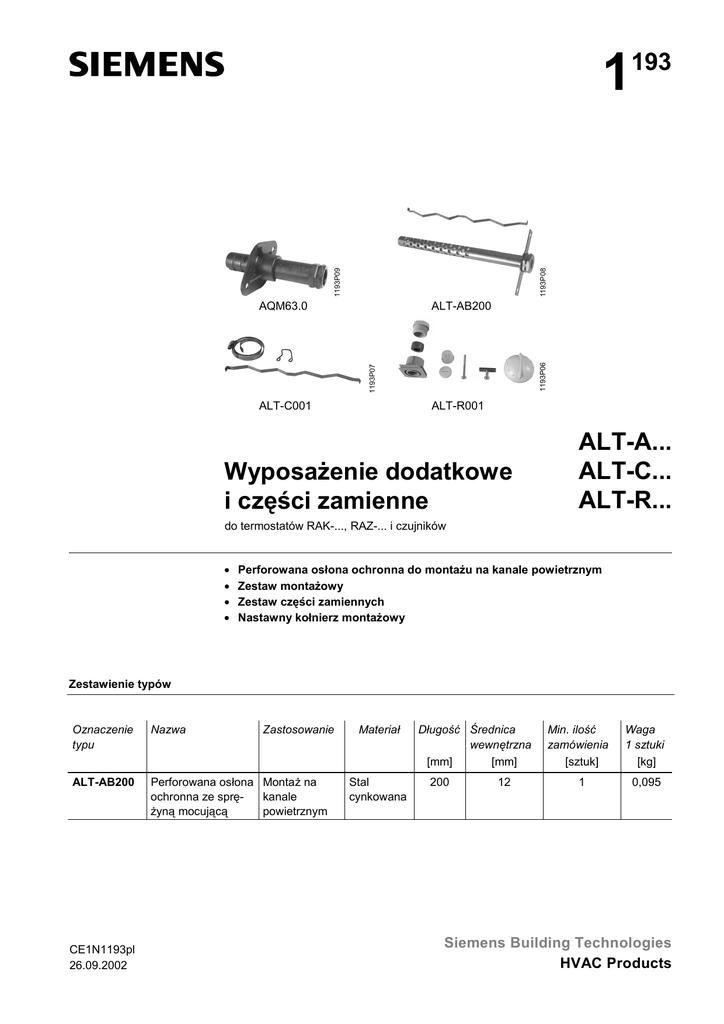 1 1193P08 1193P09 193 1193P06 ALT-AB200 1193P07 AQM63.0 ALT-C001 ALT-R001 Wyposażenie dodatkowe i części zamienne ALT-A... ALT-C... ALT-R... do termostatów RAK-..., RAZ-... i czujników • • • • Perforowana osłona ochronna do montażu na kanale powietrznym Zestaw montażowy Zestaw części zamiennych Nastawny kołnierz montażowy Zestawienie typów Oznaczenie typu Nazwa ALT-AB200 Perforowana osłona Montaż na ochronna ze sprękanale żyną mocującą powietrznym CE1N1193pl 26.09.2002 Zastosowanie Materiał Stal cynkowana Długość Średnica wewnętrzna [mm] [mm] 200 12 Min. ilość zamówienia [sztuk] 1 Waga 1 sztuki [kg] 0,095 Siemens Building Technologies HVAC Products Oznaczenie Nazwa typu ALT-C001 ALT-R001 AQM63.0 Zestaw montażowy Zestaw części zamiennych Wyposażenie montażowe Zawartość Zastosowanie Materiał Waga zestawu [kg] Stal 0,034 1 sprężyna o długości 200 mm Do mocowania elementu pomiarowego w osłonie perforowanej (zabezpieczenie przed zakłóceniami wywołanymi przez drgania) 1 opaska zaciskowa o długości 330 mm Do mocowania RAK... na rurze 4 spinki Montaż naścienny: do mocowania elementu pomiarowego w osłonie ochronnej 2 pokrętła nastawcze Do zmiany nastaw wartości zadanych: RAK-TR, RAZ-TW, RAZ-ST ABS+PC 2 dławiki kablowe Do RAK-... i RAZ-..., składa się z oprawy, uszczelnienia i elementu mocującego (M16 x 1,5) ABS+PC guma 4 osłony przycisku Reset Do RAK-ST, RAK-TB, RAZ-ST ABS+PC 3 śruby z metalową płytką Do mocowania osłony ochronnej (wszystkie typy) 4 wkręty mocujące obudowy Do wszystkich typów RAK... i RAZ... 4 osłony IP43 Do montażu na rurze 1 nastawiany kołnierz montażowy Do kanałów powietrznych z izolacją o grubości do 70 mm Stal cynkowana Stal 0,040 Stal Stal galwanizowana Plastik PA66GF35 0,038 Wymiary (w mm) ALT-AB200 200 6,2 210 11 12 25 6,2 200 AQM63.0 6 3 15,5 21,5 60 107 80 2/2 2002 Siemens Building Technologies Siemens Building Technologies HVAC Products Wyposażenie dodatkowe i części zamienne ALT-A..., ALT-C..., ALT-R... 1193M04 50 ø 20 SW 22 ø 40 1193M03 1 70 83 12 SW22 CE1N1193pl 26.09.2002