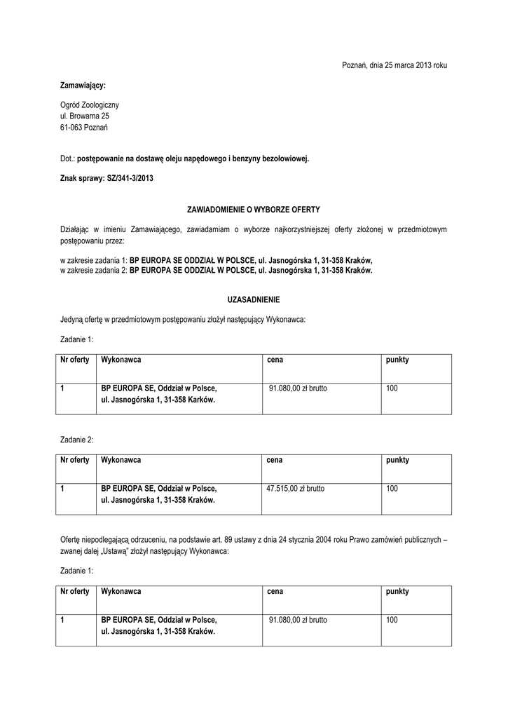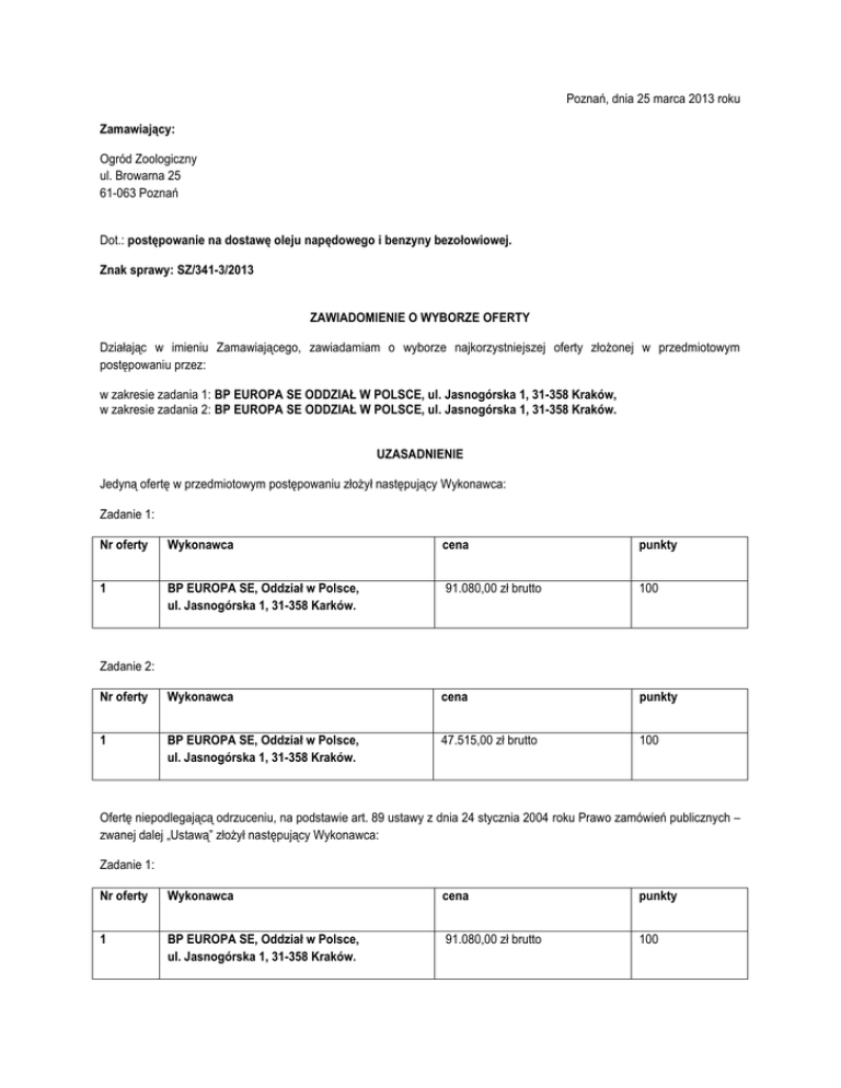Poznań, dnia 25 marca 2013 roku Zamawiający: Ogród Zoologiczny ul. Browarna 25 61-063 Poznań Dot.: postępowanie na dostawę oleju napędowego i benzyny bezołowiowej. Znak sprawy: SZ/341-3/2013 ZAWIADOMIENIE O WYBORZE OFERTY Działając w imieniu Zamawiającego, zawiadamiam o wyborze najkorzystniejszej oferty złożonej w przedmiotowym postępowaniu przez: w zakresie zadania 1: BP EUROPA SE ODDZIAŁ W POLSCE, ul. Jasnogórska 1, 31-358 Kraków, w zakresie zadania 2: BP EUROPA SE ODDZIAŁ W POLSCE, ul. Jasnogórska 1, 31-358 Kraków. UZASADNIENIE Jedyną ofertę w przedmiotowym postępowaniu złożył następujący Wykonawca: Zadanie 1: Nr oferty Wykonawca cena punkty 1 BP EUROPA SE, Oddział w Polsce, ul. Jasnogórska 1, 31-358 Karków. 91.080,00 zł brutto 100 Zadanie 2: Nr oferty Wykonawca cena punkty 1 BP EUROPA SE, Oddział w Polsce, ul. Jasnogórska 1, 31-358 Kraków. 47.515,00 zł brutto 100 Ofertę niepodlegającą odrzuceniu, na podstawie art. 89 ustawy z dnia 24 stycznia 2004 roku Prawo zamówień publicznych – zwanej dalej „Ustawą” złożył następujący Wykonawca: Zadanie 1: Nr oferty Wykonawca cena punkty 1 BP EUROPA SE, Oddział w Polsce, ul. Jasnogórska 1, 31-358 Kraków. 91.080,00 zł brutto 100 Zadanie 2: Nr oferty Wykonawca cena punkty 1 BP EUROPA SE, Oddział w Polsce, ul. Jasnogórska 1, 31-358 Kraków. 47.515,00 zł brutto 100 Wykonawca nie podlega wykluczeniu z postępowania, na podstawie art. 24 ust. 1 i 2 Ustawy. Art. 91 Ustawy stanowi, iż Zamawiający wybiera ofertę najkorzystniejszą na podstawie kryteriów oceny ofert określonych w SIWZ. Zgodnie z punktem 15.1 SIWZ jedynym kryterium oceny w przedmiotowym postępowaniu była cena. Jedyną ofertę w postępowaniu złożyła: w zakresie zadania 1: BP EUROPA SE, Oddział w Polsce, ul. Jasnogórska 1, 31-358 Kraków, w zakresie zadania 2: BP EUROPA SE, Oddział w Polsce, ul. Jasnogórska 1, 31-358 Kraków. Oferta ta otrzymała maksymalną liczbę punktów. Zaproponowana cena w zakresie zadań 1 i 2 nie przekracza kwoty, którą Zamawiający zamierzał przeznaczyć na sfinansowanie zamówienia. Biorąc pod uwagę powyższe, Zamawiający dokonał wyboru ww. oferty. Dodatkowo, Zamawiający informuje, iż zgodnie z art. 94 ust. 2 pkt. 1 lit. a w zw. z art. 92 ust. 1 pkt 4 Ustawy, Zamawiający może zawrzeć umowę w sprawie zamówienia publicznego przed upływem terminów, o których mowa w art. 94 ust. 1 Ustawy, jeżeli w postępowaniu o udzielenie zamówienia złożono tylko jedną ofertę. W związku z powyższym wzywam wybranego Wykonawcę do stawienia się w terminie od 25 do 28 marca 2013 roku w godzinach 10:00 – 13:00 w siedzibie Zamawiającego celem podpisania umowy. ……………………………….. Lech Banach