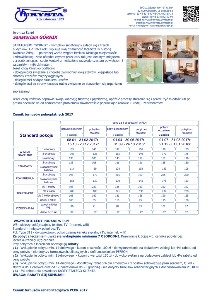 SPÓŁDZIELNIA TURYSTYCZNA 32-600 Oświęcim, ul. Solskiego 2 telefony: (0 48 33) 842-43-76, 842-27-19 tel/fax: (0 48 33) 842-59-94 e-mail: [email protected] Internet: www.turysta.oswiecim.pl Portal internetowy: www.nawakacje24.pl Sanatorium GÓRNIK SANATORIUM ”GÓRNIK” – kompleks sanatoryjny składa się z trzech budynków. Od 1971 roku wpisuje swą działalność leczniczą w historię Iwonicza Zdroju – położonej wśród wzgórz Beskidu Niskiego miejscowości uzdrowiskowej. Nasz ośrodek czynny przez cały rok jest idealnym miejscem dla osób ceniących sobie kontakt z nieskażoną przyrodą czystym powietrzem i wspaniałym mikroklimatem. Jeżeli chcą Państwo podleczyć: - dolegliwości związane z chorobą zwyrodnieniową stawów, kręgosłupa lub choroby krężków międzykręgowych - dolegliwości będące skutkiem urazów - dolegliwości ze strony narządu ruchu związane ze starzeniem się organizmu zapraszamy! Jeżeli chcą Państwo poprawić swoją kondycję fizyczną i psychiczną, opóźnić procesy starzenia się i przedłużyć młodość lub po prostu oderwać się od codziennych problemów równocześnie poprawiając zdrowie i urodę – zapraszamy!!! Cennik turnusów pełnopłatnych 2017 cena za 1 osobodzień w PLN pobyt z leczeniem Standard pokoju 3 zabiegi pobyt bez leczenia 08.01 - 31.03.2017r. 15.10 - 20.12.2017r. WYŻSZY STANDARD 1-osobowy 165 2-osobowy 148 3-osobowy 130 2-osobowy 133 STANDARD 3-osobowy bez balkonu POK.PREMIUM 3-osobowy bez balkonu 2-osobowy dla 1 osoby APARTAMENT DZIECI 3-10 lat dla 2 osób 114 195 155 305 205 140 pobyt z leczeniem 3 zabiegi pobyt bez leczenia 01.04 - 30.06.2017r. 01.09 - 24.10.2016r. pobyt z leczeniem 3 zabiegi pobyt bez leczenia 01.07 - 31.08.2017r. 21.12 - 01.01.2018r. 181 156 165 140 105 143 118 151 126 108 146 121 155 130 89 128 103 170 215 190 130 170 145 335 310 123 280 180 221 196 190 170 133 225 178 352 234 165 145 108 200 153 327 209 dla 3 i wiecej osób 165 140 181 156 190 165 dzieci 3-10 lat 100 85 110 95 115 100 dzieci 3-10 lat WS 86 71 98 83 102 87 dzieci 3-10 lat 82 97 82 67 92 77 WSZYSTKIE CENY PODANE W PLN WS- większy pokój(czajnik, telefon, TV, Internet, wifi) Standard - mniejszy pokój bez TV Pok Typu 311 - dwupokojowy: pokój dzienny+aneks sypialny (TV, internet, wifi) Za pobyt z leczeniem uważ się wykupienie minimum 7 OSOBODNI. Rezerwacje krótsze wg. cennika pobyty bez leczenia+zabiegi w/g cennika. Przy pobytach z leczeniem obowiązują rabaty: /1/. Wykupienie pobytu min. 14-dniowego - kupon o wartości 100 zł - do wykorzystania na dodatkowe zabiegi lub 4% rabatu od ceny pobytu - nie dotyczy turnusówrehabilitacyjnych z dofinansowaniem PEFRON /2/. Wykupienie pobyty min. 21-dniowego - kupon o wartości 150 zł - do wykorzystania na dodatkowe zabiegi lub 4% rabatu od ceny pobytu /3/. Wykupienie pobytu min. 14-dniowego - dodatkowy rabat 5% dla emerytów i rencistów (obowiązuje poza sezonem, tj. od 2 stycznia do 1 czerwca oraz od 17 października do 21 grudnia) - nie dotyczy turnusów rehabilitacyjnych z dofinansowaniem PEFRON /4/. 5% rabatu dla posiadaczy KARTY STAŁEGO KLIENTA UWAGA: RABATY SIĘ SUMUJĄ!!! Cennik turnusów rehabilitacyjnych PCPR 2017 08.01 - 31.03.2017r. 25.10 - 20.12.2017r. Standard pokoju 01.04 - 30.06.2017r. 01.09 - 24.10.2017r. osobodzień 14 dni-turnus osobodzień wyższy standard 147 2 058 164 2-osobowy z pełnym węzłem sanitarnym wyższy standard 134 1 876 147 standard 108 1 512 118 premium 145 2 030 155 3-osobowy z pełnym węzłem sanitarnym wyższy standard 105 1 470 98 wyższy standard standard 1-osobowy z pełnym węzłem sanitarnym dzieci 3 -10 lat standard/b. balkonu 14 dni -turnus 01.07- 31.08.2017r. 21.12 - 29.12.2017r. osobodzień 14 dni-turnus 2 296 173 2 422 2 058 157 2 198 1 652 140 1 960 2 170 165 2 310 115 1 610 138 1 932 1 372 108 1 512 123 1 722 82 1 120 90 1 260 98 1 372 78 1 092 86 1 204 91 1 274 WSZYSTKIE CENY PODANE W PLN W cenie pobytu: nocleg, wyżywienie, 2 zabiegi+gimnastyka, spacer po Iwoniczu z przewodnikiem, prelekcje, pogadanki. Warunkiem skorzystania z turnusu rehabilitacyjnego jest posiadanie dofinansowania ze środków PEFRON Cennik zabiegów balneologicznych 2017 HYDROTERAPIA kąpiel mineralna 25,00 kapiel co2 20,00 kapiel wirowa 19,00 inhalacje indywidualne 12,00 inhalacje zbiorowe 11,00 inhalacje ultradźwiękowe 12,00 masaż podwodny 24,00 bicz szkocki 24,00 kąpiel perełkowa z ozonem 22,00 masaż wirowy 22,00 kąpiel solankowa częściowa 21,00 kąpiel zmiennocieplna 15,00 kąpiel borowinowa 24,00 FIZYKOTERAPIA diadynamik 12,00 galwanizacja 12,00 czterokomorówka 14,00 interdyn 12,00 ultradźwięki 18,50 jonoforeza 12,00 jonoforeze borowinowa 15,00 magnetoterapia 14,00 stymulacja 12,00 krioterapia 14,00 krioterapia ogólnoustrojowa 33,00 krioterapia ogólnoustrojowa - karnet min. 10 zab. 290,00 kriożelki 11,00 kapsuła kwasowęglowa gazowa 16,00 MASAŻE masaż ręczny częściowy 23,00 fotel wibracyjny 14,00 aquavibron 12,00 hydrojet 20,00 CIEPŁOLECZNICTWO borowina fasony 31,00 borowina zawijana 38,00 plastry borowinowe 15,00 12,00 plastry borowinowe dłonie ŚWIATŁOLECZNICTWO laser 19,00 lampa SOLLUX 12,00 KINEZYTERAPIA gimnastyka indywidualna 13,00 gimnastyka zbiorowa 11,00 terapia metodą PNF - pierwsze spotkanie/kolejne spotkania 31,00/16,00 terapia metodą McKenziego - pierwsze spotkanie/kolejne spotkania 31,00/16,00 kinezjotaping - kręgosłup/kończyny górne/kończyny dolne 31,00/21,00/16,00 gimnastyka z krioterapią miejscową 20,00 Cennik opłat za udostępnianie dokumentacji medycznej 1 strona kopii 0,70 zł 1 strona wyciągu, odpisu 7,50 zł na elektronicznym nośniku 7,50 zł udostępnienie dokumentacji do wglądu – na miejscu po uprzednim uzgodnieniu terminu – bez opłat Obejmuje dokumentację medyczną: Historia choroby, karta informacyjna, karta zabiegowa, skierowanie na leczenie uzdrowiskowe, potwierdzenie otrzymania skierowania z NFZ, indywidualna karta epidemiologiczna, oświadczenie kuracjusza Cennik odp