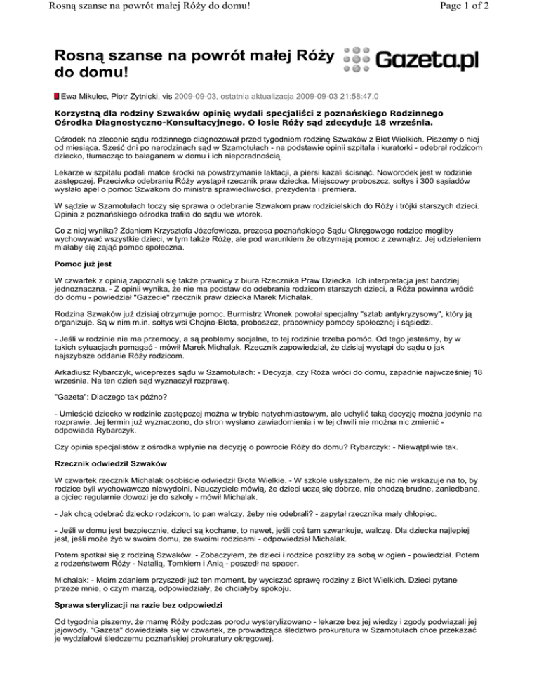 Rosną szanse na powrót małej Róży do domu! Page 1 of 2 Rosną szanse na powrót małej Róży do domu! Ewa Mikulec, Piotr Żytnicki, vis 2009-09-03, ostatnia aktualizacja 2009-09-03 21:58:47.0 Korzystną dla rodziny Szwaków opinię wydali specjaliści z poznańskiego Rodzinnego Ośrodka Diagnostyczno-Konsultacyjnego. O losie Róży sąd zdecyduje 18 września. Ośrodek na zlecenie sądu rodzinnego diagnozował przed tygodniem rodzinę Szwaków z Błot Wielkich. Piszemy o niej od miesiąca. Sześć dni po narodzinach sąd w Szamotułach - na podstawie opinii szpitala i kuratorki - odebrał rodzicom dziecko, tłumacząc to bałaganem w domu i ich nieporadnością. Lekarze w szpitalu podali matce środki na powstrzymanie laktacji, a piersi kazali ścisnąć. Noworodek jest w rodzinie zastępczej. Przeciwko odebraniu Róży wystąpił rzecznik praw dziecka. Miejscowy proboszcz, sołtys i 300 sąsiadów wysłało apel o pomoc Szwakom do ministra sprawiedliwości, prezydenta i premiera. W sądzie w Szamotułach toczy się sprawa o odebranie Szwakom praw rodzicielskich do Róży i trójki starszych dzieci. Opinia z poznańskiego ośrodka trafiła do sądu we wtorek. Co z niej wynika? Zdaniem Krzysztofa Józefowicza, prezesa poznańskiego Sądu Okręgowego rodzice mogliby wychowywać wszystkie dzieci, w tym także Różę, ale pod warunkiem że otrzymają pomoc z zewnątrz. Jej udzieleniem miałaby się zająć pomoc społeczna. Pomoc już jest W czwartek z opinią zapoznali się także prawnicy z biura Rzecznika Praw Dziecka. Ich interpretacja jest bardziej jednoznaczna. - Z opinii wynika, że nie ma podstaw do odebrania rodzicom starszych dzieci, a Róża powinna wrócić do domu - powiedział "Gazecie" rzecznik praw dziecka Marek Michalak. Rodzina Szwaków już dzisiaj otrzymuje pomoc. Burmistrz Wronek powołał specjalny "sztab antykryzysowy", który ją organizuje. Są w nim m.in. sołtys wsi Chojno-Błota, proboszcz, pracownicy pomocy społecznej i sąsiedzi. - Jeśli w rodzinie nie ma przemocy, a są problemy socjalne, to tej rodzinie trzeba pomóc. Od tego jesteśmy, by w takich sytuacjach pomagać - mówił Marek Michalak. Rzecznik zapowiedział, że dzisiaj wystąpi do sądu o jak najszybsze oddanie Róży rodzicom. Arkadiusz Rybarczyk, wiceprezes sądu w Szamotułach: - Decyzja, czy Róża wróci do domu, zapadnie najwcześniej 18 września. Na ten dzień sąd wyznaczył rozprawę. "Gazeta": Dlaczego tak późno? - Umieścić dziecko w rodzinie zastępczej można w trybie natychmiastowym, ale uchylić taką decyzję można jedynie na rozprawie. Jej termin już wyznaczono, do stron wysłano zawiadomienia i w tej chwili nie można nic zmienić odpowiada Rybarczyk. Czy opinia specjalistów z ośrodka wpłynie na decyzję o powrocie Róży do domu? Rybarczyk: - Niewątpliwie tak. Rzecznik odwiedził Szwaków W czwartek rzecznik Michalak osobiście odwiedził Błota Wielkie. - W szkole usłyszałem, że nic nie wskazuje na to, by rodzice byli wychowawczo niewydolni. Nauczyciele mówią, że dzieci uczą się dobrze, nie chodzą brudne, zaniedbane, a ojciec regularnie dowozi je do szkoły - mówił Michalak. - Jak chcą odebrać dziecko rodzicom, to pan walczy, żeby nie odebrali? - zapytał rzecznika mały chłopiec. - Jeśli w domu jest bezpiecznie, dzieci są kochane, to nawet, jeśli coś tam szwankuje, walczę. Dla dziecka najlepiej jest, jeśli może żyć w swoim domu, ze swoimi rodzicami - odpowiedział Michalak. Potem spotkał się z rodziną Szwaków. - Zobaczyłem, że dzieci i rodzice poszliby za sobą w ogień - powiedział. Potem z rodzeństwem Róży - Natalią, Tomkiem i Anią - poszedł na spacer. Michalak: - Moim zdaniem przyszedł już ten moment, by wyciszać sprawę rodziny z Błot Wielkich. Dzieci pytane przeze mnie, o czym marzą, odpowiedziały, że chciałyby spokoju. Sprawa sterylizacji na razie bez odpowiedzi Od tygodnia piszemy, że mamę Róży podczas porodu wysterylizowano - lekarze bez jej wiedzy i zgody podwiązali jej jajowody. "Gazeta" dowiedziała się w czwartek, że prowadząca śledztwo prokuratura w Szamotułach chce przekazać je wydziałowi śledczemu poznańskiej prokuratury okręgowej. Rosną szanse na powrót małej Róży do domu! Page 2 of 2 Mariusz Orlicki, zastępca prokuratora okręgowego, potwierdził, że w zabezpieczonej w szpitalu dokumentacji nie ma zgody na sterylizację, a jedynie na cesarskie cięcie i poszerzenie zabiegu, jeśli pojawi się niebezpieczeństwo dla zdrowia i życia. Orlicki potwierdził, że prokuratura powoła zespół biegłych, którzy ocenią, czy w tej sytuacji takie niebezpieczeństwo istniało i lekarze mieli prawo sterylizować kobietę. - Dopiero potem zapadnie decyzja, czy postawić lekarzom zarzuty - mówi Orlicki. Prokuratura będzie szukać biegłych poza Wielkopolską. Przygotowanie opinii może zająć im nawet kilka miesięcy. A to oznacza, że w tym roku w śledztwie prawdopodobnie już nic się nie wydarzy. Komentarz Włodzimierza Bogaczyka - szefa poznańskiej redakcji "Gazety Wyborczej" Bardzo mądre słowa rzecznika praw dziecka: To moment, by wyciszać sprawę rodziny z Błot Wielkich. Rodzeństwo Róży marzy o spokoju. A jednak... Nie można przestać pisać, dopóki dziewczynka nie wróci do domu. Na przeszkodzie wyciszenia sprawy stoją wciąż sędziowie z Szamotuł i Poznania. Dla pierwszych najważniejsze jest, by w papierach wszystko się zgadzało. Czy naprawdę nie można przyspieszyć terminu rozprawy? Nikt nie uwierzy, że walczący o dziecko rodzice i ich prawnik nie pojawiliby się w sądzie we wcześniejszym terminie. Wystarczy wysłać list polecony. Sędziowie poznańscy też nie są bez winy. Widzieli tę samą opinię co rzecznik praw dziecka. Marek Michalak przeczytał tam, że nie ma podstaw do odebrania Róży rodzicom. Koniec kropka. Tymczasem sędzia Józefowicz podkreśla, że dziecko można oddać, tylko pod warunkiem zapewnienia rodzinie dużej pomocy zewnętrznej