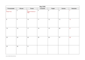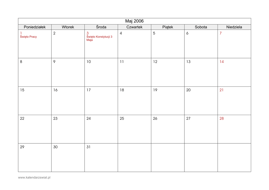 Maj 2006 Poniedziałek 1 Wtorek 2 Środa 3 Czwartek Piątek Sobota Niedziela 4 5 6 7 Święto Konstytucji 3 Maja Święto Pracy 8 9 10 11 12 13 14 15 16 17 18 19 20 21 22 23 24 25 26 27 28 29 30 31 www.kalendarzswiat.pl