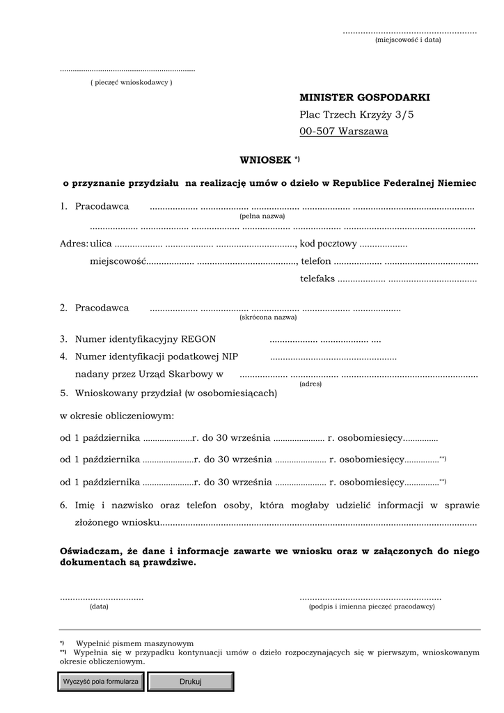..................................................... (miejscowość i data) ................................................................ ( pieczęć wnioskodawcy ) MINISTER GOSPODARKI Plac Trzech Krzyży 3/5 00-507 Warszawa WNIOSEK *) o przyznanie przydziału na realizację umów o dzieło w Republice Federalnej Niemiec 1. Pracodawca ................... ................... ................... ................... ................................................ (pełna nazwa) ................... ................... ................... ................... ................... .................................................... Adres: ulica ................... ................... ..............................., kod pocztowy ................... miejscowość................... ......................................., telefon ................... ..................................... telefaks ................... ................................... 2. Pracodawca ................... ................... ................... ................... ................... (skrócona nazwa) 3. Numer identyfikacyjny REGON ................... ................... .... 4. Numer identyfikacji podatkowej NIP .................................................. nadany przez Urząd Skarbowy w ................... ................... ...................................................... (adres) 5. Wnioskowany przydział (w osobomiesiącach) w okresie obliczeniowym: od 1 października .....................r. do 30 września ...................... r. osobomiesięcy............... od 1 października ......................r. do 30 września ...................... r. osobomiesięcy...............**) od 1 października ......................r. do 30 września ...................... r. osobomiesięcy...............**) 6. Imię i nazwisko oraz telefon osoby, która mogłaby udzielić informacji w sprawie złożonego wniosku............................................................................................................................. Oświadczam, że dane i informacje zawarte we wniosku oraz w załączonych do niego dokumentach są prawdziwe. ................................. ........................................................ (data) (podpis i imienna pieczęć pracodawcy) Wypełnić pismem maszynowym Wypełnia się w przypadku kontynuacji umów o dzieło rozpoczynających się w pierwszym, wnioskowanym okresie obliczeniowym. *) **) Wyczyść pola formularza Drukuj