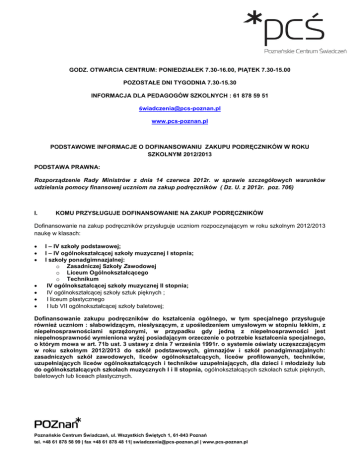 GODZ. OTWARCIA CENTRUM: PONIEDZIAŁEK 7.30-16.00, PIĄTEK 7.30-15.00 POZOSTAŁE DNI TYGODNIA 7.30-15.30 INFORMACJA DLA PEDAGOGÓW SZKOLNYCH : 61 878 59 51 ś[email protected] www.pcs-poznan.pl PODSTAWOWE INFORMACJE O DOFINANSOWANIU ZAKUPU PODRĘCZNIKÓW W ROKU SZKOLNYM 2012/2013 PODSTAWA PRAWNA: Rozporządzenie Rady Ministrów z dnia 14 czerwca 2012r. w sprawie szczegółowych warunków udzielania pomocy finansowej uczniom na zakup podręczników ( Dz. U. z 2012r. poz. 706) I. KOMU PRZYSŁUGUJE DOFINANSOWANIE NA ZAKUP PODRĘCZNIKÓW Dofinansowanie na zakup podręczników przysługuje uczniom rozpoczynającym w roku szkolnym 2012/2013 naukę w klasach: I – IV szkoły podstawowej; I – IV ogólnokształcącej szkoły muzycznej I stopnia; I szkoły ponadgimnazjalnej: o Zasadniczej Szkoły Zawodowej o Liceum Ogólnokształcącego o Technikum IV ogólnokształcącej szkoły muzycznej II stopnia; IV ogólnokształcącej szkoły sztuk pięknych ; I liceum plastycznego I lub VII ogólnokształcącej szkoły baletowej; Dofinansowanie zakupu podręczników do kształcenia ogólnego, w tym specjalnego przysługuje również uczniom : słabowidzącym, niesłyszącym, z upośledzeniem umysłowym w stopniu lekkim, z niepełnosprawnościami sprzężonymi, w przypadku gdy jedną z niepełnosprawności jest niepełnosprawność wymieniona wyżej posiadającym orzeczenie o potrzebie kształcenia specjalnego, o którym mowa w art. 71b ust. 3 ustawy z dnia 7 września 1991r. o systemie oświaty uczęszczającym w roku szkolnym 2012/2013 do szkół podstawowych, gimnazjów i szkół ponadgimnazjalnych: zasadniczych szkół zawodowych, liceów ogólnokształcących, liceów profilowanych, techników, uzupełniających liceów ogólnokształcących i techników uzupełniających, dla dzieci i młodzieży lub do ogólnokształcących szkołach muzycznych I i II stopnia, ogólnokształcących szkołach sztuk pięknych, baletowych lub liceach plastycznych. Poznańskie Centrum Świadczeń, ul. Wszystkich Świętych 1, 61-843 Poznań tel. +48 61 878 58 99 | fax +48 61 878 48 11| [email protected] | www.pcs-poznan.pl II. MIEJSCE I TERMIN SKŁADANIA WNIOSKÓW Wniosek o dofinansowanie zakupu podręczników składa się do dyrektora szkoły, do której uczeń będzie uczęszczał w roku szkolnym 2012/2013. Zgodnie z § 3 .3 Rozporządzenia Rady Ministrów z dnia 14 czerwca 2012r. w sprawie szczegółowych warunków udzielania pomocy finansowej uczniom na zakup podręczników termin składania wniosków ustala Prezydent Miasta. Wnioski w roku szkolnym 2012/2013 należy składać w terminie do 10 października 2012r. III. IV. KTO MOŻE ZŁOŻYĆ WNIOSEK Rodzice; Opiekun prawny; Rodzina zastępcza; Za zgodą przedstawiciela ustawowego lub rodziców zastępczych wniosek może złożyć: nauczyciel, pracownik socjalny lub inna osoba. KRYTERIUM DOCHODOWE UPRAWNIJĄCE DO OTRZYMANIA DOFINANSOWANIA ZAKUPU PODRĘCZNIKÓW do 30 września 2012r - 351zł netto od 1 października 2012r. – 456zł netto dotyczy wyłącznie uczniów klasy II – IV szkoły podstawowej, klasy II – IV ogólnokształcącej szkoły muzycznej I stopnia, I klasy szkoły ponadgimnazjalnej: Zasadniczej Szkoły Zawodowej, Liceum Ogólnokształcącego, Technikum, IV klasy ogólnokształcącej szkoły muzycznej II stopnia, IV klasy ogólnokształcącej szkoły sztuk pięknych, I klasy liceum plastycznego, I klasy lub VII ogólnokształcącej szkoły baletowej). 504zł netto dotyczy wyłącznie podstawowej, klasy muzycznej I stopnia I uczniów klasy I ogólnokształcącej szkoły szkoły Ustalanie dochodu rodziny W celu ubiegania się o przyznanie dofinansowania W celu ubiegania się o przyznanie dofinansowania niezbędne jest przedstawienie wszystkich dochodów niezbędne jest przedstawienie wszystkich dochodów osiąganych przez członków rodziny z miesiąca osiąganych przez członków rodziny w roku 2010. poprzedzającego złożenie wniosku. Jeżeli wniosek zostanie złożony w październiku to Należy pamiętać, że dochodem w rozumieniu dokumentujemy dochody za miesiąc wrzesień. ustawy Należy pamiętać, że dochodem w rozumieniu O świadczeniach rodzinnych po odliczeniu kwot ustawy o pomocy społecznej są np. świadczenia alimentów świadczonych na rzecz innych osób są: rodzinne, alimentacyjne, dodatek mieszkaniowy, - przychody podlegające opodatkowaniu na alimenty płacone zgodnie z wyrokiem. W przypadku zasadach określonych w art. 27, 30b, 30c, i 30e kiedy członek naszej rodziny płaci alimenty na ustawy o podatku dochodowym od osób fizycznych osobę z poza rodziny to płaconą kwotę alimentów pomniejszone o koszty uzyskania przychodu oraz odejmujemy od dochodu rodziny. składki na ubezpieczenie społeczne i zdrowotne. - deklarowany w oświadczeniu dochód z działalności podlegającej opodatkowaniu na podstawie przepisów o zryczałtowanym podatku dochodowym Obliczenie dochodów rodziny odbywa się na podstawie ustawy o pomocy społecznej zgodnie, z którą ,, Rodzinę tworzą osoby spokrewnione lub niespokrewnione pozostające w faktycznym związku, wspólnie zamieszkujące i gospodarujące”. Do dochodu ustalonego nie wlicza się: jednorazowego pieniężnego świadczenia socjalnego; wartości świadczeń w naturze; świadczenia przysługującego osobie bezrobotnej na podstawie przepisów w o promocji zatrudnienia i instytucjach rynku pracy z tytułu wykonywania prac społecznie użytecznych; zapomogi pieniężnej, o której mowa w przepisach o zapomodze pieniężnej dla niektórych emerytów, rencistów i osób pobierających świadczenie przedemerytalne albo zasiłek przedemerytalny w 2007 r. od niektórych przychodów osiąganych przez osoby fizyczne, pomniejszone o należny zryczałtowany podatek dochodowy i składki na ubezpieczenia społeczne i zdrowotne. - inne dochody niepodlegające opodatkowaniu na podstawie przepisów o podatku dochodowym od osób fizycznych np. alimenty otrzymywane na dzieci, Obliczenie dochodów rodz