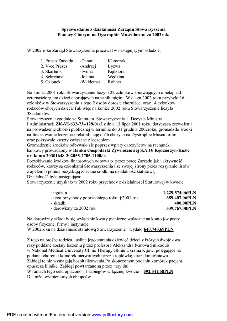 Sprawozdanie z działalności Zarządu Stowarzyszenia Pomocy Chorym na Dystrophie Musculorum za 2002rok. W 2002 roku Zarząd Stowarzyszenia pracował w następującym składzie: 1. Prezes Zarządu 2. V-ce Prezes 3. Skarbnik 4. Sekretarz 5. Członek -Danuta -Andrzej -Iwona -Jolanta -Waldemar Klimczak Łyżwa Kędziora Wędzina Rohner Na koniec 2001 roku Stowarzyszenie liczyło 22 członków sprawujących opiekę nad czternaściorgiem dzieci chorujących na zanik mięśni. W ciągu 2002 roku przybyło 16 członków w Stowarzyszeniu z tego 2 osoby dorosłe chorujące, oraz 14 członków rodziców chorych dzieci. Tak więc na koniec 2002 roku Stowarzyszenie liczyło 38członków. Stowarzyszenie zgodnie ze Statutem Stowarzyszenia i Decyzją Ministra i Administracji ZK-VI-632-73-/129/01/2 z dnia 13 lipca 2001 roku, dotyczącą zezwolenia na prowadzenie zbiórki publicznej w terminie do 31 grudnia 2002roku, gromadziło środki na finansowanie leczenia i rehabilitację osób chorych na Dystrophie Musculorum oraz pokrywało koszty związane z leczeniem. Gromadzenie środków odbywało się poprzez wpłaty darczyńców na rachunek bankowy prowadzony w Banku Gospodarki Żywnościowej S.A.O/ Kędzierzyn-Kożle nr. konta 20301648-202055-2705-1100/0. Pozyskiwanie środków finansowych odbywało przez pracę Zarządu jak i aktywność rodziców, którzy są członkami Stowarzyszenia i ze swojej strony przez rozsyłanie listów z apelem o pomoc pozyskują znaczne środki na działalność statutową. Działalność była następująca; Stowarzyszenie uzyskało w 2002 roku przychody z działalności Statutowej w kwocie - ogółem - tego przychody poprzedniego roku tj;2001 rok - składki - darowizny za 2002 rok 1.229.574.06PLN 689.407,06PLN 400,00PLN 539.767,00PLN Na darowizny składały się wyłącznie kwoty pieniężne wpłacane na konto j/w przez osoby fizyczne, firmy i instytucje. W 2002roku na działalność statutową Stowarzyszenie wydało 640.740.69PLN Z tego na prośbę rodzica i usilne jego starania dziewięć dzieci z których dwoje dwa razy poddane zostały leczeniu przez profesora Aleksandra lvanova Smikodub w National Medical University Clinic Therapy Glinie Ukraina Kijów, polegające na podaniu choremu komórek pierwotnych przez kroplówkę, oraz domięśniowo. Zabiegi te nie wymagają hospitalizowania.Po skończonym podaniu komórek pacjent. opuszcza klinikę. Zabiegi powtarzane są przez trzy dni. W ramach tego celu opłacono 11 zabiegów w łącznej kwocie 592.541.58PLN Dla niżej wymienionych chłopców PDF created with pdfFactory trial version www.pdffactory.com 1 2 3 4 5 6 7 8 9 Dawid Łukasz Łukasz Piotr Piotr Grzegorz Kamil Łukasz Mariusz Adam Mariusz Nowicki Lewicki Lewicki Wolak Wolak Gil Chełstowski Krasoń Popławski Wiatr Zając pierwszy zabieg drugi zabieg pierwszy zabieg drugi zabieg 54,672,00 zł 54,672,00 zł 39,631,52 zł 58,498,50 zł 40,412,14 zł 60,121,06 zł 40,412,14 zł 60,308,70 zł 62,072,52 zł 61,695,00 zł 60,046,00 zł Dla w/w dzieci pokryto koszty podróży, oraz opłacono pobyty zakwaterowania wraz z opiekunem na podstawie przedłożonych faktur i rachunków w kwocie; 30.312,49PLN Opłacenie dodatkowej indywidualnej rehabilitacji dziecka przebywającego w Ośrodku Rehabilitacyjnym Konstancin-Jeziorna, oraz pokrycie kosztów pobytu opiekuna. Dziecko wraz z opiekunem przebywało 13 miesięcy. Opłacono koszty korzystania z rehabilitacji w basenie w kwocie; 12.823,00PLN Wydatki na pokrycie kosztów leków wg. recept rodziców, których nie było stać na ich wykupienie w kwocie; 677,92PLN Zakupiono sprzęt rehabilitacyjny potrzebny do ćwiczeń w podwieszkach, materac, akumulatory do wózka inwalidzkiego w kwocie 4.385,70PLN Koszty administracyjne Stowarzyszenia stanowiły w 2002roku 1,52% uzyskanych przychodów i wynosiły; 18.702.10PLN Z czego sfinansowano koszty usług księgowych, telekomunikacyjnych, ksero, oraz druki ulotek wyniosły w kwocie; 12.797,86PLN z tego zużycie materiałów biurowych, zakup znaczków pocztowych kopert potrzebnych do rozsyłania próśb z apelem rodziców o pomoc w kwocie; 4.747,74PLN z tytułu opłat administracyjnych i prowizji bankowych wyniosły kwotę: 1.156.50PLN: Inwestycje krótkoterminowe w postaci środków pieniężnych w kwocie 8.720.97PLN Wykazane na dzień 31.12.2002rok są to nierozliczone kwoty za leki sprowadzane z Grecji, oraz zakup wózka inwalidzkiego dla Łukasza Łowickiego. Na dzień sporządzania sprawozdania przedstawiona została i rozliczona należność w kwocie 1.037,72 za leki sprowadzane z Grecji. PDF created with pdfFactory trial version www.pdffactory.com Ponadto Stowarzyszenie uzyskało przychody finansowe z lokat krótkoterminowych w wysokości; 51.956.84PLN Praca Zarządu jest wolontariatem, darowizny w całości finansują potrzeby dzieci i ich opiekunów. Stowarzyszenie w znaczny sposób wspomaga rodziców w walce z nieuleczalną chorobą są to kontakty z lekarzami i placówkami j/w oraz przekazywaniem informacji leczonych dzieci, oraz wymiana doświadczeń w prowadzeniu rehabilitacji. Rok 2002 zamknął się wynikiem dodatnim w wysokości 616.523.93PLN. Sprawozdanie sporządził Zarząd Stowarzyszenia w osobach: 1 Prezes Zarządu Danuta Klimczak 2 V- ce Prezes Andrzej Łyżwa 3 Skarbnik Iwona Kędziora 4 Sekretarz Jolanta Wędzina 5 Członek Zarządu Waldemar Rohner PDF created with pdfFactory trial version www.pdffactory.com