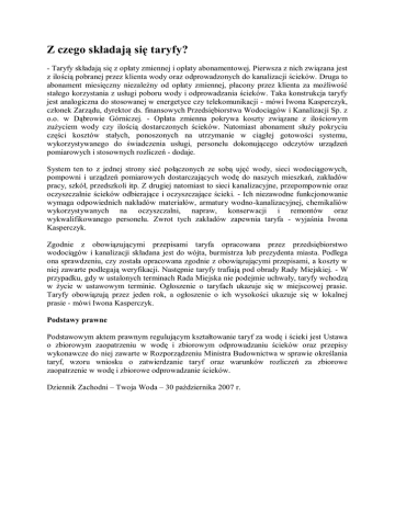 Z czego składają się taryfy? - Taryfy składają się z opłaty zmiennej i opłaty abonamentowej. Pierwsza z nich związana jest z ilością pobranej przez klienta wody oraz odprowadzonych do kanalizacji ścieków. Druga to abonament miesięczny niezależny od opłaty zmiennej, płacony przez klienta za możliwość stałego korzystania z usługi poboru wody i odprowadzania ścieków. Taka konstrukcja taryfy jest analogiczna do stosowanej w energetyce czy telekomunikacji - mówi Iwona Kasperczyk, członek Zarządu, dyrektor ds. finansowych Przedsiębiorstwa Wodociągów i Kanalizacji Sp. z o.o. w Dąbrowie Górniczej. - Opłata zmienna pokrywa koszty związane z ilościowym zużyciem wody czy ilością dostarczonych ścieków. Natomiast abonament służy pokryciu części kosztów stałych, ponoszonych na utrzymanie w ciągłej gotowości systemu, wykorzystywanego do świadczenia usługi, personelu dokonującego odczytów urządzeń pomiarowych i stosownych rozliczeń - dodaje. System ten to z jednej strony sieć połączonych ze sobą ujęć wody, sieci wodociągowych, pompowni i urządzeń pomiarowych dostarczających wodę do naszych mieszkań, zakładów pracy, szkół, przedszkoli itp. Z drugiej natomiast to sieci kanalizacyjne, przepompownie oraz oczyszczalnie ścieków odbierające i oczyszczające ścieki. - Ich niezawodne funkcjonowanie wymaga odpowiednich nakładów materiałów, armatury wodno-kanalizacyjnej, chemikaliów wykorzystywanych na oczyszczalni, napraw, konserwacji i remontów oraz wykwalifikowanego personelu. Zwrot tych zakładów zapewnia taryfa - wyjaśnia Iwona Kasperczyk. Zgodnie z obowiązującymi przepisami taryfa opracowana przez przedsiębiorstwo wodociągów i kanalizacji składana jest do wójta, burmistrza lub prezydenta miasta. Podlega ona sprawdzeniu, czy została opracowana zgodnie z obowiązującymi przepisami, a koszty w niej zawarte podlegają weryfikacji. Następnie taryfy trafiają pod obrady Rady Miejskiej. - W przypadku, gdy w ustalonych terminach Rada Miejska nie podejmie uchwały, taryfy wchodzą w życie w ustawowym terminie. Ogłoszenie o taryfach ukazuje się w miejscowej prasie. Taryfy obowiązują przez jeden rok, a ogłoszenie o ich wysokości ukazuje się w lokalnej prasie - mówi Iwona Kasperczyk. Podstawy prawne Podstawowym aktem prawnym regulującym kształtowanie taryf za wodę i ścieki jest Ustawa o zbiorowym zaopatrzeniu w wodę i zbiorowym odprowadzaniu ścieków oraz przepisy wykonawcze do niej zawarte w Rozporządzeniu Ministra Budownictwa w sprawie określania taryf, wzoru wniosku o zatwierdzanie taryf oraz warunków rozliczeń za zbiorowe zaopatrzenie w wodę i zbiorowe odprowadzanie ścieków. Dziennik Zachodni – Twoja Woda – 30 października 2007 r.