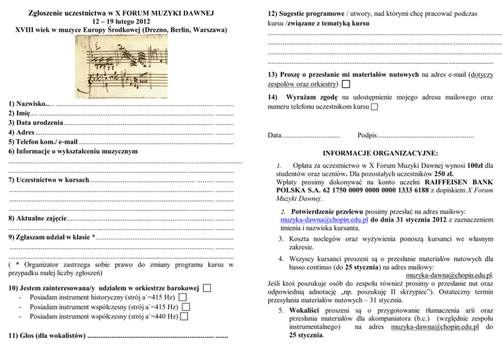 Zgłoszenie uczestnictwa w X FORUM MUZYKI DAWNEJ 12 – 19 lutego 2012 XVIII wiek w muzyce Europy Środkowej (Drezno, Berlin, Warszawa) 12) Sugestie programowe / utwory, nad którymi chcę pracować podczas kursu /związane z tematyką kursu ..................................................................................................................... ......... .................................................................................................... .......................... ......................................................................................................................... ..... .............................................................................................................................. 13) Proszę o przesłanie mi materiałów nutowych na adres e-mail (dotyczy zespołów oraz orkiestry) 1) Nazwisko..... ..................................................................................... .......... 2) Imię.... .............................................................................................. .......... 3) Data urodzenia................................................................................. .......... 4) Adres ................................................................................................ .......... 5) Telefon kom./ e-mail .................................................................................... 6) Informacje o wykształceniu muzycznym .................................................................................................... .......................... .............................................................................................................................. 7) Uczestnictwo w kursach......................................................... ......... .......... .............................................................................................................. .......... .............................................................................................................. .......... .............................................................................................................................. 8) Aktualne zajęcie............................................................................... .......... ...... ........................................................................................................ .......... 9) Zgłaszam udział w klasie *............................................................................ .............................................................................................................. .......... .............................................................................................................................. ( * Organizator zastrzega sobie prawo do zmiany programu kursu w przypadku małej liczby zgłoszeń) 10) Jestem zainteresowana/y udziałem w orkiestrze barokowej - Posiadam instrument historyczny (strój a`=415 Hz) - Posiadam instrument współczesny (strój a`=415 Hz) - Posiadam instrument współczesny (strój a`=440 Hz) 11) Głos (dla wokalistów) .................................................................... ....... 14) Wyrażam zgodę na udostępnienie mojego adresu mailowego oraz numeru telefonu uczestnikom kursu Data................................ Podpis.................................................... INFORMACJE ORGANIZACYJNE: 1. Opłata za uczestnictwo w X Forum Muzyki Dawnej wynosi 100zł dla studentów oraz uczniów. Dla pozostałych uczestników 250 zł. Wpłaty prosimy dokonywać na konto uczelni RAIFFEISEN BANK POLSKA S.A. 62 1750 0009 0000 0000 1333 6188 z dopiskiem X Forum Muzyki Dawnej. 2. Potwierdzenie przelewu prosimy przesłać na adres mailowy: [email protected] do dnia 31 stycznia 2012 z zaznaczeniem imienia i nazwiska kursanta. 3. Koszta noclegów oraz wyżywienia ponoszą kursanci we własnym zakresie. 4. Wszyscy kursanci proszeni są o przesłanie materiałów nutowych dla basso continuo (do 25 stycznia) na adres mailowy: [email protected]. Jeśli ktoś poszukuje osób do zespołu również prosimy o przesłanie nut oraz odpowiednią adnotację „np. poszukuję II skrzypiec”). Ostateczny termin przesyłania materiałów nutowych – 31 stycznia. 5. Wokaliści proszeni są o przygotowanie tłumaczenia arii oraz przesłania materiałów dla akompaniatora (b.c.) (względnie zespołu instrumentalnego) na adres [email protected] do 25 stycznia. 6. W dniu przyjazdu kursanci proszeni są o zgłoszenie się do stoiska informacyjnego znajdującego się przy wejściu głównym uczelni lub kontakt z Sekretarzem X FMD p. Katarzyną Gucwa (tel. 504 290 590). 7. Spotkanie informacyjne odbędzie się w poniedziałek 13 lutego o g. 8:30. Obecność na spotkaniu jest obowiązkowa. Uniwersytet Muzyczny Fryderyka Chopina w Warszawie X FORUM MUZYKI DAWNEJ 12-19 lutego 2012 XVIII wiek w muzyce Europy Środkowej (Drezno, Berlin, Warszawa) PRZEBIEG KURSU: Koncert Inauguracyjny odbędzie się 12 lutego o g. 17.00 Zajęcia rozpoczynają się 13 lutego i są prowadzone do dnia 18 lutego (sobota). Wyjątkiem jest klasa fagotu, której zajęcia będą się odbywać jeszcze 19 lutego. Prosimy o dokładne sprawdzenie na liście terminów lekcji poszczególnych wykładowców. W niedzielę 19 lutego odbywać się będą wyłącznie próby do Koncertu Finałowego. W godzinach rannych będą odbywać się zajęcia solowe oraz kameralne. Przerwa obiadowa w godz. 14-15. Zajęcia z orkiestry barokowej w godzinach popołudniowych. W trakcie kursu planowane są m.in. następujące wykłady: - „Hasse w Warszawie” (dr hab. Alina Żórawska-Witkowska, prof. UW) - „Styl polski w muzyce niemieckiej XVIII wieku” (dr Szymon Paczkowski, UW) Szczegółowy plan kursu zostanie przedstawiony uczestnikom na spotkaniu informacyjnym. Organizacja: Międzywydziałowe Studium Muzyki Dawnej / Wydział Instrumentalny UMFC w Warszawie Kierownictwo artystyczne - Agata S