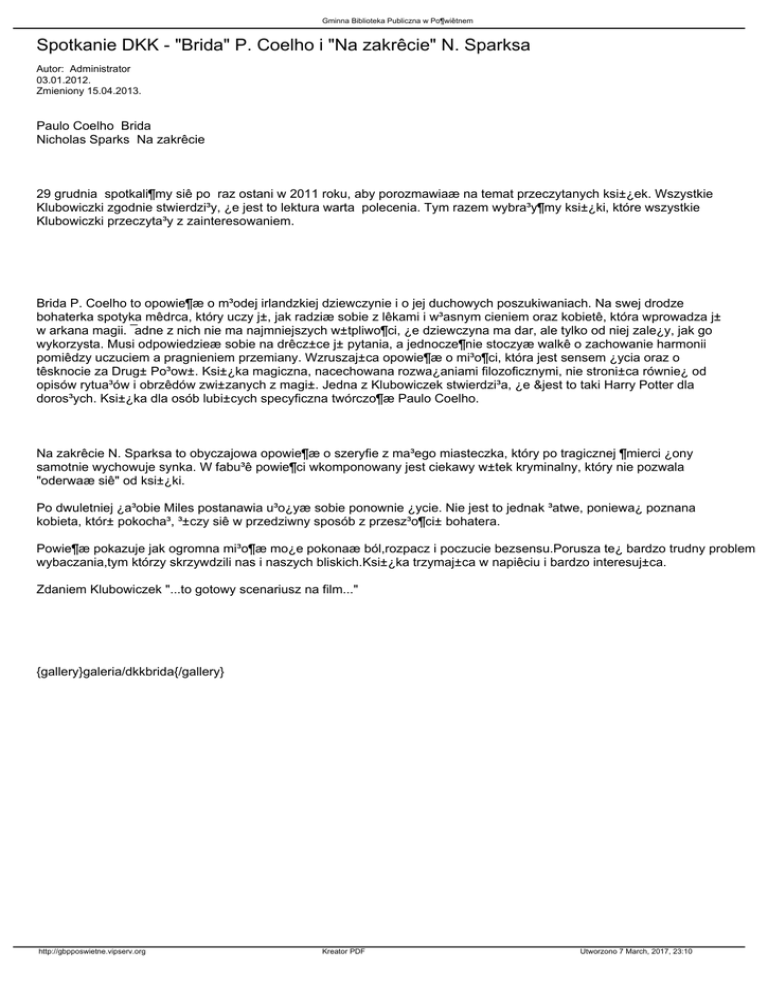 Spotkanie DKK - "Brida" P. Coelho i "Na zakręcie" N. Sparksa