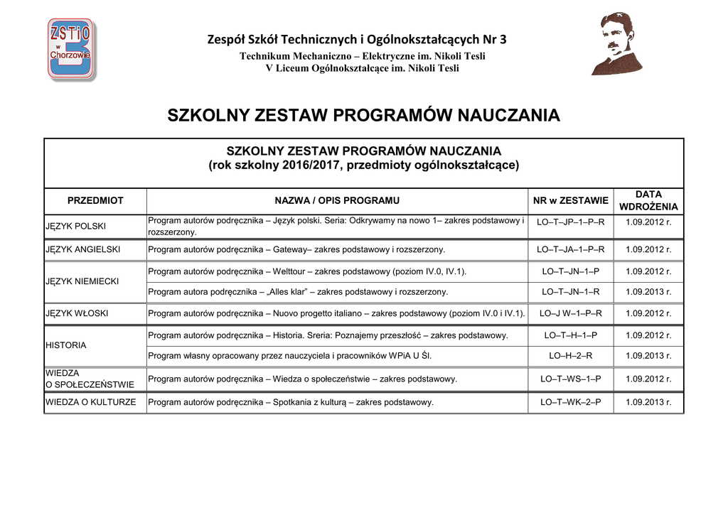 Zespół Szkół Technicznych i Ogólnokształcących Nr 3 Technikum Mechaniczno – Elektryczne im. Nikoli Tesli V Liceum Ogólnokształcące im. Nikoli Tesli SZKOLNY ZESTAW PROGRAMÓW NAUCZANIA SZKOLNY ZESTAW PROGRAMÓW NAUCZANIA (rok szkolny 2016/2017, przedmioty ogólnokształcące) NAZWA / OPIS PROGRAMU NR w ZESTAWIE DATA WDROŻENIA JĘZYK POLSKI Program autorów podręcznika – Język polski. Seria: Odkrywamy na nowo 1– zakres podstawowy i rozszerzony. LO–T–JP–1–P–R 1.09.2012 r. JĘZYK ANGIELSKI Program autorów podręcznika – Gateway– zakres podstawowy i rozszerzony. LO–T–JA–1–P–R 1.09.2012 r. Program autorów podręcznika – Welttour – zakres podstawowy (poziom IV.0, IV.1). LO–T–JN–1–P 1.09.2012 r. Program autora podręcznika – „Alles klar” – zakres podstawowy i rozszerzony. LO–T–JN–1–R 1.09.2013 r. Program autorów podręcznika – Nuovo progetto italiano – zakres podstawowy (poziom IV.0 i IV.1). LO–J W–1–P–R 1.09.2012 r. LO–T–H–1–P 1.09.2012 r. LO–H–2–R 1.09.2013 r. PRZEDMIOT JĘZYK NIEMIECKI JĘZYK WŁOSKI Program autorów podręcznika – Historia. Sreria: Poznajemy przeszłość – zakres podstawowy. HISTORIA Program własny opracowany przez nauczyciela i pracowników WPiA U Śl. WIEDZA O SPOŁECZEŃSTWIE Program autorów podręcznika – Wiedza o społeczeństwie – zakres podstawowy. LO–T–WS–1–P 1.09.2012 r. WIEDZA O KULTURZE Program autorów podręcznika – Spotkania z kulturą – zakres podstawowy. LO–T–WK–2–P 1.09.2013 r. PRZEDMIOT MATEMATYKA NAZWA / OPIS PROGRAMU Modyfikacja programu autorów podręcznika – Matematyka poznać, zrozumieć - zakres podstawowy i rozszerzony. Programu autorów podręcznika – Fizyka to nie katastrofa – zakres podstawowy. NR w ZESTAWIE DATA WDROŻENIA LO–T–M–1–P–R 1.09.2012 r. LO–T–F–2–P 1.09.2013 r. T–F–1–R 1.09.2013 r. LO–T–CH–2–P 1.09.2016 r. LO–T–B–2–P 1.09.2015 r. LO–B–1–R 1.09.2012 r. LO–T–G–1–P 1.09.2012 r. LO–G–1–R 1.09.2013 r. LO–T–PP–1–P 1.09.2012 r. LO–PP–2–P 1.09.2014 r. LO–T–INF–1–P 1.09.2012 r. LO–WF–1–P 1.09.2012 r. T–WF–1–P 1.09.2012 r. LO–T–EB–1–P 1.09.2012 r. FIZYKA Programu autorów podręcznika – Z fizyką w przyszłość – zakres rozszerzony. CHEMIA Program autorów podręcznika – To jest chemia – zakres podstawowy. Program autorów podręcznika – Biologia. Seria: Ciekawi świata – zakres podstawowy. BIOLOGIA Program autorów podręcznika – Biologia na czasie – zakres rozszerzony. Program autorów podręcznika – Geografia. Seria: Odkrywamy na nowo” – zakres podstawowy. GEOGRAFIA Program autorów podręcznika – Geografia. Seria: Ciekawi świata – zakres rozszerzony. PODSTAWY Program autorów podręcznika – Krok w przedsiębiorczość. PRZEDSIĘBIORCZOŚCI PODSTAWY Program własny. Podstawy przedsiębiorczości z elementami prawa. PRZEDSIĘBIORCZOŚCI 1INFORMATYKA WYCHOWANIE FIZYCZNE EDUKACJA DLA BEZPIECZEŃSTWA Program autorów podręcznika – Informatyka. Seria: Ciekawi świata – zakres podstawowy. Program własny opracowany przez zespół nauczycieli dla liceum ogólnokształcącego. Program własny opracowany przez zespół nauczycieli dla technikum. Program autorów podręcznika – Edukacja dla bezpieczeństwa. Seria: Ciekawi świata. NR w ZESTAWIE DATA WDROŻENIA LO–T–WDZR–1 1.09.2012r. Program dopuszczony do użytku szkolnego DKOS-5002-3/04 WR-244 1.09.2003r. RELIGIA Program dopuszczony do użytku szkolnego AZ-4-01/10 REL-281 1.09.2011r. HISTORIA I SPOŁECZEŃSTWO Program autorów serii podręczników – Historia i społeczeństwo. LO–HIS–1–P 1.09.2013 r. PRZYRODA Program autorów podręcznika – Przyroda 1. LO–P–1–P 1.09.2013 r. WSTĘP DO BIOTECHNOLOGII Program własny opracowany nauczyciela. LO–WDB–1–P 1.09.2013 r. ELEMENTY PRAWA Program własny opracowany przez nauczyciela i pracowników WPiA U Śl. LO–EP–1–P 1.09.2013 r. PRZEDMIOT WYCHOWANIE DO ŻYCIA W RODZINIE EDUKACJA REGIONALNA NAZWA / OPIS PROGRAMU DKW-4015-22/01 SZKOLNY ZESTAW PROGRAMÓW NAUCZANIA (rok szkolny 2016/2017, przedmioty zawodowe) PRZEDMIOT ELEKTROTECHNIKA I ELEKTRONIKA (E) TECHNOLOGIA I MATERIAŁOZNAWSTWO ELEKTRYCZNE MASZYNY ELEKTRYCZNE INSTALACJE ELEKTRYCZNE URZĄDZENIA ELEKTRYCZNE PRACOWNIA ELEKTROTECHNIKI I ELEKTRONIKI (E) PROJEKTOWANIE INSTALACJI I URZĄDZEŃ ELEKTRYCZNYCH PRACOWNIA INSTALACJI ELEKTRYCZNYCH PRACOWNIA MASZYN ELEKTRYCZNYCH PRACOWNIA URZĄDZEŃ ELEKTRYCZNYCH JĘZYK ANGIELSKI ZAWODOWY PODEJMOWANIE DZIŁAŁALNOŚCI GOSPODARCZEJ NAZWA / OPIS PROGRAMU Modyfikacja programu nauczania przedmiotu elektrotechnika i elektronika na podstawie programu nauczania w zawodzie technik elektryk (KOWEZiU). Modyfikacja programu nauczania przedmiotu technologia i materiałoznawstwo elektryczne na podstawie programu nauczania w zawodzie technik elektryk (KOWEZiU). Modyfikacja programu nauczania przedmiotu maszyny elektryczne na podstawie programu nauczania w zawodzie technik elektryk (KOWEZiU). Modyfikacja programu nauczania przedmiotu instalacje elektryczne na podstawie programu nauczania w zawodzie technik elektryk (KOWEZiU). Modyfikacja programu nauczania przedmiotu urządzenia elektryczne na podstawie programu nauczania w zawodzie technik elektryk (KOWEZiU). Modyfikacja programu nauczania przedmiotu pracownia elektrotechniki i elektroniki na podstawie programu nauczania w zawodzie technik elektryk (KOWEZiU). Modyfikacja programu nauczania przedmiotu projektowanie instalacji i urządzeń elektrycznych na podstawie programu nauczania w zawodzie technik elektryk (KOWEZiU). Modyfikacja programu nauczania przedmiotu pracownia instalacji elektrycznych na podstawie programu nauczania w zawodzie technik elektryk (KOWEZiU). Modyfikacja programu nauczania przedmiotu pracownia maszyn elektrycznych na podstawie programu nauczania w zawodzie technik elektryk (KOWEZiU). Modyfikacja programu na