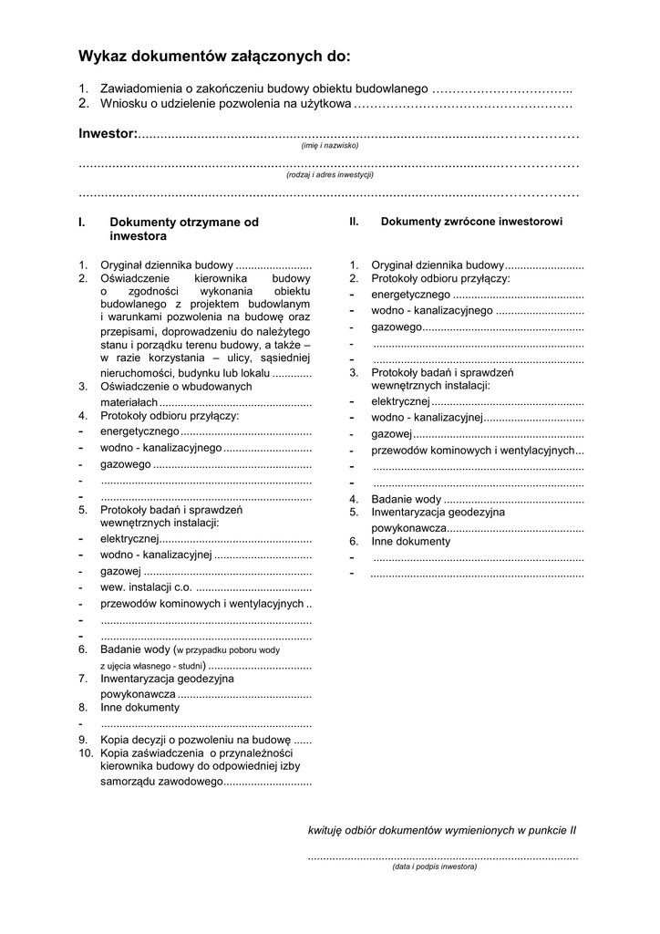 Wykaz dokumentów załączonych do: 1. Zawiadomienia o zakończeniu budowy obiektu budowlanego …………………………….. 2. Wniosku o udzielenie pozwolenia na użytkowa ……………………………………………… Inwestor:..................................................................................................……………… (imię i nazwisko) ..................................................................................................................……………… (rodzaj i adres inwestycji) ..................................................................................................................……………… I. 1. 2. II. Dokumenty otrzymane od inwestora Oryginał dziennika budowy ......................... Oświadczenie kierownika budowy o zgodności wykonania obiektu budowlanego z projektem budowlanym i warunkami pozwolenia na budowę oraz przepisami, doprowadzeniu do należytego stanu i porządku terenu budowy, a także – w razie korzystania – ulicy, sąsiedniej nieruchomości, budynku lub lokalu ............. 3. Oświadczenie o wbudowanych materiałach .................................................. 4. Protokoły odbioru przyłączy: - energetycznego ........................................... - wodno - kanalizacyjnego ............................. gazowego .................................................... ..................................................................... - ..................................................................... 5. Protokoły badań i sprawdzeń wewnętrznych instalacji: - elektrycznej.................................................. - wodno - kanalizacyjnej ................................ gazowej ....................................................... wew. instalacji c.o. ...................................... przewodów kominowych i wentylacyjnych .. - ..................................................................... - ..................................................................... 6. Badanie wody (w przypadku poboru wody z ujęcia własnego - studni) .................................. 7. Inwentaryzacja geodezyjna powykonawcza ............................................ 8. Inne dokumenty ..................................................................... 9. Kopia decyzji o pozwoleniu na budowę ...... 10. Kopia zaświadczenia o przynależności kierownika budowy do odpowiedniej izby samorządu zawodowego............................. 1. 2. - 3. - 4. 5. 6. - Dokumenty zwrócone inwestorowi Oryginał dziennika budowy .......................... Protokoły odbioru przyłączy: energetycznego ........................................... wodno - kanalizacyjnego ............................. gazowego..................................................... ..................................................................... ..................................................................... Protokoły badań i sprawdzeń wewnętrznych instalacji: elektrycznej .................................................. wodno - kanalizacyjnej ................................. gazowej ........................................................ przewodów kominowych i wentylacyjnych ... ..................................................................... ..................................................................... Badanie wody .............................................. Inwentaryzacja geodezyjna powykonawcza............................................. Inne dokumenty ..................................................................... ...................................................................... kwituję odbiór dokumentów wymienionych w punkcie II ........................................................................................ (data i podpis inwestora)