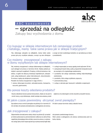 6 A B C ko n s u m e nt a – s p r z e d a ż n a o dl e g ło ś ć ABC konsumenta – sprzedaż na odległość Zakupy bez wychodzenia z domu Czy kupując w sklepie internetowym lub zamawiając produkt z katalogu, mamy takie same prawa jak w sklepie tradycyjnym? Tak, dokonując zakupów na odległość, mamy takie same prawa jak przy zwykłym zakupie, a wręcz są one silniejsze z uwagi na brak osobistego kontaktu ze sprzedawcą (a także z produktem!). Czy możemy zrezygnować z zakupu w domu wysyłkowym lub sklepie internetowym? Tak, możemy zrezygnować z zakupu dokonanego na odległość, czyli odstąpić od umowy w terminie 10 dni. Należy jednak pamiętać o pewnych wyjątkach. Przepisy, o których piszemy w tej ulotce, w ogóle nie dotyczą inwestycji kapitałowych, ubezpieczeń, usług bankowych, aukcji internetowych, nieruchomości. Te umowy rządzą się odrębnymi przepisami. Ponadto nie można zrezygnować w ciągu 10 dni z: • umowy dotyczącej turystyki, zakwaterowania, transportu, rozrywki, gastronomii; • z usługi rozpoczętej za naszą zgodą przed upływem 10 dni; • z zakupionych kaset video, audio, programów komputerowych po usunięciu ich oryginalnego opakowania; • z produktu lub usługi wykonanej według indywidualnego zamówienia; • z produktu, który ulega szybkiemu zepsuciu; • z prenumeraty prasy; • z usług w zakresie gier losowych i zakładów wzajemnych. Kto ponosi koszty odesłania produktu? Koszty odesłania towaru ponosi konsument, chyba że nie jest to zwrot rzeczy, a jej reklamacja. Jeżeli zostaje ona uznana, przed- siębiorca ma obowiązek zwrotu kosztów przesyłki towaru. W jakim czasie powinniśmy otrzymać zwrot pieniędzy? Sprzedawca musi zwrócić pieniądze nie później niż w terminie 14 dni od daty otrzymania oświadczenia o odstąpieniu od umowy. W takim samym terminie należy odesłać towar. Jak zrezygnować z zakupu? Odpowiednie oświadczenie należy złożyć na piśmie (!) i przesłać je listem poleconym (z potwierdzeniem odbioru) na adres rmy najpóźniej dziesiątego dnia od daty zawarcia umowy o wykonanie usługi (ale przed rozpoczęciem jej wykonywania) bądź daty otrzymania zamówionego towaru. Wzór pisma o odstąpieniu od umowy zamieszczony jest na końcu tekstu. Czy możemy reklamować produkt zakupiony w Internecie lub z katalogu? Towary zakupione na odległość reklamujemy na takich samych zasadach, jak rzeczy zakupione w zwykłym sklepie, z tym wyjątkiem, że dla celów dowodowych warto przesyłać pisma rekla- macyjne także oddzielnym listem poleconym. O przysługujących nam prawach w przypadku reklamacji można przeczytać w „ABC konsumenta. Co warto wiedzieć o zakupach i reklamacji”. Czy musimy płacić za paczkę, której nie zamawialiśmy? Za towar, którego nie zamawialiśmy, nie mamy obowiązku płacić. Przesłanie niezamówionego towaru następuje na koszt i ryzyko przedsiębiorcy. Warto jednak upewnić się, czy rzeczywiście nie złożyliśmy zamówienia... czasem nie pamiętamy, że wypełniliśmy kupon w gazecie, dołączony np. do krzyżówki. Czy oferta, że „Wygrałeś 100 000 zł” jest prawdziwa? Takie oferty z reguły są próbą przestępczego wyłudzenia pieniędzy, szczególnie gdy wiążą się one na wstępie z koniecznością poniesienia pewnych kosztów (zapłata „kosztów administracyjnych”, zadzwonienie pod numer 0-701... ). Przed skorzystaniem z takiej „okazji” proponujemy skontaktować się z Federacją Konsumentów. Podstawa prawna: Ustawa o ochronie niektórych praw konsumentów oraz o odpowiedzialności za szkodę wyrządzoną przez produkt niebezpieczny z dnia 2 marca 2000 r. (DzU z 2000 r. Nr 22, poz. 271) ........................................................ ........................................................ ........................................................ imię, nazwisko i adres konsumenta ...................., dn. ........................ .................................................... .................................................... .................................................... .................................................... nazwa i adres przedsiębiorstwa OŚWIADCZENIE O ODSTĄPIENIU OD UMOWY ZAWARTEJ NA ODLEGŁOŚĆ Oświadczam, że zgodnie z art. 7 ust. 1 ustawy z dnia 2 marca 2000 r. o ochronie niektórych praw konsumentów oraz o odpowiedzialności za szkodę wyrządzoną przez produkt niebezpieczny (DzU nr 22, poz. 271 z późn. zm.) odstępuję od umowy nr ... zawartej dnia .................... w .......................... Proszę o zwrot kwoty .................. zł (słownie ................................................... ......................) przekazem pocztowym na adres: ........................................................................................................................ Na zwrot ww. kwoty będę oczekiwać w terminie 14 dni od daty otrzymania tego pisma. Bezskuteczny upływ tego terminu spowoduje podjęcie dalszych czynności zmierzających do wyegzekwowania ww. kwoty wraz z ustawowymi odsetkami. Jednocześnie informuję, że przedmiot umowy wydam oddzielną przesyłką na adres Państwa siedziby. ................................ podpis konsumenta Sprawdź, jakie masz prawa Federacja Konsumentów Pl. Powstańców Warszawy 1/3 00-030 Warszawa tel. (22) 827 11 73 fax (22) 827 90 59 e-mail: [email protected] www.federacja-konsumentow.org.pl Niniejszy dokument został opublikowany dzięki pomocy nansowej Unii Europejskiej. Za treść dokumentu odpowiada Federacja Konsumentów, poglądy w nim wyrażone nie odzwierciedlają w żadnym razie ocjalnego stanowiska Unii Europejskiej.