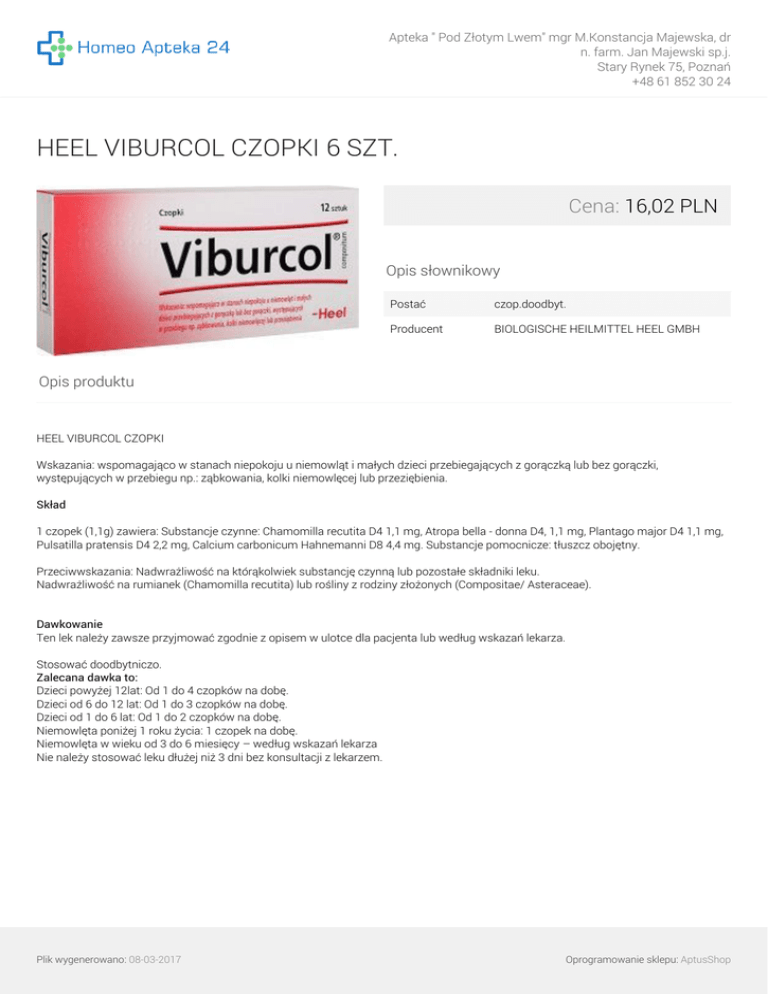 Apteka " Pod Złotym Lwem" mgr M.Konstancja Majewska, dr n. farm. Jan Majewski sp.j. Stary Rynek 75, Poznań +48 61 852 30 24 HEEL VIBURCOL CZOPKI 6 SZT. Cena: 16,02 PLN Opis słownikowy Postać czop.doodbyt. Producent BIOLOGISCHE HEILMITTEL HEEL GMBH Opis produktu HEEL VIBURCOL CZOPKI Wskazania: wspomagająco w stanach niepokoju u niemowląt i małych dzieci przebiegających z gorączką lub bez gorączki, występujących w przebiegu np.: ząbkowania, kolki niemowlęcej lub przeziębienia. Skład 1 czopek (1,1g) zawiera: Substancje czynne: Chamomilla recutita D4 1,1 mg, Atropa bella - donna D4, 1,1 mg, Plantago major D4 1,1 mg, Pulsatilla pratensis D4 2,2 mg, Calcium carbonicum Hahnemanni D8 4,4 mg. Substancje pomocnicze: tłuszcz obojętny. Przeciwwskazania: Nadwrażliwość na którąkolwiek substancję czynną lub pozostałe składniki leku. Nadwrażliwość na rumianek (Chamomilla recutita) lub rośliny z rodziny złożonych (Compositae/ Asteraceae). Dawkowanie Ten lek należy zawsze przyjmować zgodnie z opisem w ulotce dla pacjenta lub według wskazań lekarza. Stosować doodbytniczo. Zalecana dawka to: Dzieci powyżej 12lat: Od 1 do 4 czopków na dobę. Dzieci od 6 do 12 lat: Od 1 do 3 czopków na dobę. Dzieci od 1 do 6 lat: Od 1 do 2 czopków na dobę. Niemowlęta poniżej 1 roku życia: 1 czopek na dobę. Niemowlęta w wieku od 3 do 6 miesięcy – według wskazań lekarza Nie należy stosować leku dłużej niż 3 dni bez konsultacji z lekarzem. Plik wygenerowano: 08-03-2017 Powered by TCPDF (www.tcpdf.org) Oprogramowanie sklepu: AptusShop