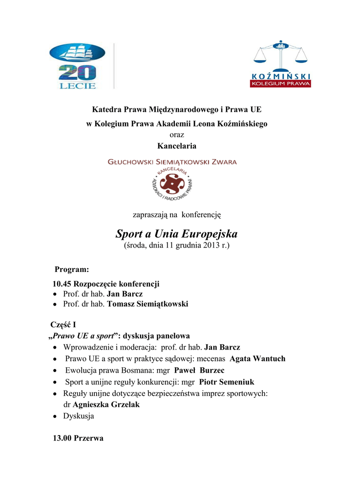 Katedra Prawa Międzynarodowego i Prawa UE w Kolegium Prawa Akademii Leona Koźmińskiego oraz Kancelaria zapraszają na konferencję Sport a Unia Europejska (środa, dnia 11 grudnia 2013 r.) Program: 10.45 Rozpoczęcie konferencji Prof. dr hab. Jan Barcz Prof. dr hab. Tomasz Siemiątkowski Część I „Prawo UE a sport”: dyskusja panelowa Wprowadzenie i moderacja: prof. dr hab. Jan Barcz Prawo UE a sport w praktyce sądowej: mecenas Agata Wantuch Ewolucja prawa Bosmana: mgr Paweł Burzec Sport a unijne reguły konkurencji: mgr Piotr Semeniuk Reguły unijne dotyczące bezpieczeństwa imprez sportowych: dr Agnieszka Grzelak Dyskusja 13.00 Przerwa Część II Działania Unii Europejskiej na rzecz sportu 13.15 Rozpoczęcie "Unia Europejska a sport: kompetencje, polityka, działania praktyczne" Jan Truszczyński, dyrektor generalny ds. edukacji, szkoleń, kultury i młodzieży w Komisji Europejskiej „Jak Unia może pomóc polskiemu sportowi?” (na przykładzie projektu Polskiego Związku Piłki Nożnej dotyczącego Akademii Młodych Orłów) - Bogdan Basałaj, zastępca Dyrektora Sportowego Polskiego Związku Piłki Nożnej 15.00 Podsumowanie i zakończenie konferencji Konferencja odbędzie się w dniu 11 grudnia 2013 r. (w środę) początek o godz. 10.45, w Sali Senatu (sala D-202) Akademia Leona Koźmińskiego, Warszawa, ul. Jagiellońska 57/59 Prosimy o potwierdzenie udziału: [email protected] Patronat medialny Notki biograficzne referentów (według kolejności alfabetycznej) Jan Barcz: prof. dr hab., kierownik Katedry Prawa Międzynarodowego i Prawa UE w Kolegium Prawa Akademii Leona Koźmińskiego Bogdan Basałaj: działacz sportowy, pełnił funkcję prezesa klubu piłkarskiego Wisła Kraków, był także dyrektorem zarządzającym spółki Ekstraklasa SA, obecnie zastępca Dyrektora Sportowego Polskiego Związku Piłki Nożnej Paweł Burzec: aplikant adwokacki w kancelarii Głuchowski Siemiątkowski Zwara, właściciel Agencji Menedżerskiej MVP, jest jednym z założycieli klubu siatkarskiego KPS Siedlce Banki Spółdzielcze z Grupy BPS Agnieszka Grzelak: doktor nauk prawnych; Katedra Prawa Europejskiego SGH w Warszawie i Biuro Analiz Sejmowych Piotr Semeniuk: pracował w zespole prawa konkurencji kancelarii CMS Cameron McKenna, obecnie redaktor działu prawa konkurencji na portalu www.korporacyjnie.pl, członek Stowarzyszenia Prawa Konkurencji oraz New York Bar Antitrust Committee, współpracownik Centrum Studiów Antymonopolowych i Regulacyjnych Uniwersytetu Warszawskiego Tomasz Siemiątkowski: Senior Partner Zarządzający w kancelarii Głuchowski Siemiątkowski Zwara, dr nauk ekonom., dr hab. nauk prawnych, profesor SGH oraz UKSW w Warszawie, ekspert prawa spółek, prawa bilansowego, prawa energetycznego i sportowego Jan Truszczyński: dyrektor generalny ds. edukacji, szkoleń, kultury i młodzieży w Komisji Europejskiej; uprzednio m.in. ambasador RP przy UE, sekretarz stanu w MSZ, główny negocjator podczas negocjacji w sprawie akcesji Polski do UE Agata Wantuch: adwokat specjalizujący się m.in. w prawie sportowym, prowadzi kancelarię w Krakowie, prezes Stowarzyszenia Obywatelski Wawel