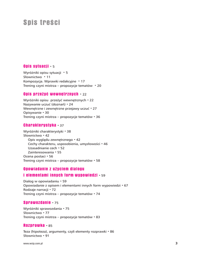 Spis treści Opis sytuacji • 5 Wyróżniki opisu sytuacji • 5 Słownictwo • 11 Kompozycja. Wprawki redakcyjne • 17 Trening czyni mistrza – propozycje tematów • 20 Opis przeżyć wewnętrznych • 22 Wyróżniki opisu przeżyć wewnętrznych • 22 Nazywanie uczuć (doznań) • 24 Wewnętrzne i zewnętrzne przejawy uczuć • 27 Opisywanie • 30 Trening czyni mistrza – propozycje tematów • 36 Charakterystyka • 37 Wyróżniki charakterystyki • 38 Słownictwo • 42 Opis wyglądu zewnętrznego • 42 Cechy charakteru, usposobienia, umysłowości • 46 Uzasadnianie cech • 52 Zainteresowania • 55 Ocena postaci • 56 Trening czyni mistrza – propozycje tematów • 58 Opowiadanie z użyciem dialogu i elementami innych form wypowiedzi • 59 Dialog w opowiadaniu • 59 Opowiadanie z opisem i elementami innych form wypowiedzi • 67 Rodzaje narracji • 72 Trening czyni mistrza – propozycje tematów • 74 Sprawozdanie • 75 Wyróżniki sprawozdania • 75 Słownictwo • 77 Trening czyni mistrza – propozycje tematów • 83 Rozprawka • 85 Teza (hipoteza), argumenty, czyli elementy rozprawki • 86 Słownictwo • 91 www.wsip.com.pl 3 Cytowanie • 95 Styl rozprawki • 100 Kompozycja rozprawki • 101 Plan, czyli co warto zrobić przed napisaniem rozprawki • 105 Rozprawka na podstawie tekstu • 106 Trening czyni mistrza – propozycje tematów • 109 Pamiętnik, dziennik • 110 Pamiętnik i dziennik jako utwory prozatorskie • 110 Narracja • 113 Chronologia • 114 Słownictwo • 116 Trening czyni mistrza – propozycje tematów • 120 Dedykacja • 122 Wywiad • 128 Wyróżniki wywiadu • 129 Tytułowanie • 131 Redagowanie zapowiedzi – lidów • 135 Trudna sztuka zadawania pytań • 137 Trening czyni mistrza – propozycje tematów • 141 Reportaż • 142 Cechy reportażu • 143 Tytuł – wizytówka reportażu • 145 Ciekawa zapowiedź tekstu – początek sukcesu • 149 Jak dzielić teksty, czyli o śródtytułach • 152 Jak się przygotować do napisania reportażu? • 155 Trening czyni mistrza – propozycje tematów • 156 Recenzja • 157 Wyróżniki recenzji • 159 Słownictwo • 162 Recenzent fachowcem! Słownictwo specjalistyczne • 162 Wyrazy bliskoznaczne i peryfrazy • 165 Frazeologia • 166 Słownictwo perswazyjne • 168 Wyrażanie własnego zdania • 169 Trening czyni mistrza – propozycje tematów • 173 Curriculum vitae (CV) • 174 Trening czyni mistrza – propozycje tematów • 178 Podanie • 180 Trening czyni mistrza – propozycje tematów • 183 4