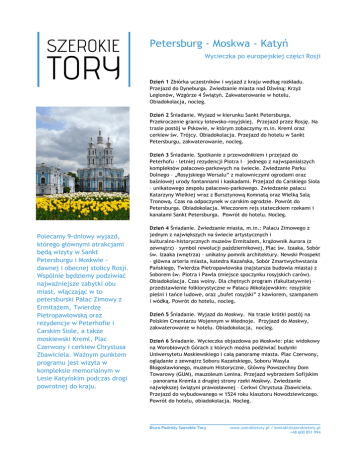 Petersburg - Moskwa - Katyń Wycieczka po europejskiej części Rosji Dzień 1 Zbiórka uczestników i wyjazd z kraju według rozkładu. Przejazd do Dyneburga. Zwiedzanie miasta nad Dźwiną: Krzyż Legionów, Wzgórze 4 Świątyń. Zakwaterowanie w hotelu. Obiadokolacja, nocleg. Dzień 2 Śniadanie. Wyjazd w kierunku Sankt Petersburga. Przekroczenie granicy łotewsko-rosyjskiej. Przejazd przez Rosję. Na trasie postój w Pskowie, w którym zobaczymy m.in. Kreml oraz cerkiew św. Trójcy. Obiadokolacja. Przejazd do hotelu w Sankt Petersburgu, zakwaterowanie, nocleg. Dzień 3 Śniadanie. Spotkanie z przewodnikiem i przejazd do Peterhofu - letniej rezydencji Piotra I – jednego z najwspanialszych kompleksów pałacowo-parkowych na świecie. Zwiedzanie Parku Dolnego – „Rosyjskiego Wersalu” z malowniczymi ogrodami oraz baśniowej urody fontannami i kaskadami. Przejazd do Carskiego Sioła – unikatowego zespołu pałacowo-parkowego. Zwiedzanie pałacu Katarzyny Wielkiej wraz z Bursztynową Komnatą oraz Wielką Salą Tronową. Czas na odpoczynek w carskim ogrodzie. Powrót do Petersburga. Obiadokolacja. Wieczorem rejs stateczkiem rzekami i kanałami Sankt Petersburga. Powrót do hotelu. Nocleg. Polecamy 9-dniowy wyjazd, którego głównymi atrakcjami będą wizyty w Sankt Petersburgu i Moskwie dawnej i obecnej stolicy Rosji. Wspólnie będziemy podziwiać najważniejsze zabytki obu miast, włączając w to petersburski Pałac Zimowy z Ermitażem, Twierdzę Pietropawłowską oraz rezydencje w Peterhofie i Carskim Siole, a także moskiewski Kreml, Plac Czerwony i cerkiew Chrystusa Zbawiciela. Ważnym punktem programu jest wizyta w kompleksie memorialnym w Lesie Katyńskim podczas drogi powrotnej do kraju. Dzień 4 Śniadanie. Zwiedzanie miasta, m.in.: Pałacu Zimowego z jednym z największych na świecie artystycznych i kulturalno-historycznych muzeów Ermitażem, krążownik Aurora (z zewnątrz) – symbol rewolucji październikowej, Plac św. Izaaka, Sobór św. Izaaka (wnętrza) – unikalny pomnik architektury. Newski Prospekt – główna arteria miasta, katedra Kazańska, Sobór Zmartwychwstania Pańskiego, Twierdza Pietropawłowska (najstarsza budowla miasta) z Soborem św. Piotra i Pawła (miejsce spoczynku rosyjskich carów). Obiadokolacja. Czas wolny. Dla chętnych program (fakultatywnie) – przedstawienie folklorystyczne w Pałacu Mikołajewskim: rosyjskie pieśni i tańce ludowe, oraz „bufet rosyjski” z kawiorem, szampanem i wódką. Powrót do hotelu, nocleg. Dzień 5 Śniadanie. Wyjazd do Moskwy. Na trasie krótki postój na Polskim Cmentarzu Wojennym w Miednoje. Przyjazd do Moskwy, zakwaterowanie w hotelu. Obiadokolacja, nocleg. Dzień 6 Śniadanie. Wycieczka objazdowa po Moskwie: plac widokowy na Worobiowych Górach z których można podziwiać budynki Uniwersytetu Moskiewskiego i całą panoramę miasta. Plac Czerwony, oglądanie z zewnątrz Soboru Kazańskiego, Soboru Wasyla Błogosławionego, muzeum Historyczne, Główny Powszechny Dom Towarowy (GUM), mauzoleum Lenina. Przejazd wybrzeżem Sofijskim – panorama Kremla z drugiej strony rzeki Moskwy. Zwiedzanie największej świątyni prawosławnej – Cerkwi Chrystusa Zbawiciela. Przejazd do wybudowanego w 1524 roku klasztoru Nowodziewiczego. Powrót do hotelu, obiadokolacja. Nocleg. Biuro Podróży Szerokie Tory www.szerokietory.pl / [email protected] +48 600 851 994 CENA: 2 469 PLN Terminy: 28.05 - 05.06.2017** 01.07 - 09.07.2017** 31.07 - 08.08.2017* 10.09 - 18.09.2017 * wysoki sezon - dopłata 95 zł ** wysoki sezon - dopłata 190 zł Dzień 7 Śniadanie. Ciąg dalszy zwiedzania miasta z przejazdem metrem. Kreml z Soborami, Zbrojownia z kolekcją koron carskich, jajek Faberze i tronów carskich, armatą Car–Działem i największym na świecie dzwonem Car–Dzwonem. Galeria Trietiakowska – największy i zarazem najbardziej znaczący zbiór sztuki rosyjskiej, zwiedzania najokazalszych stacji metra Moskiewskiego, spacer słynnym Arbatem. Powrót do hotelu, obiadokolacja. Nocleg. Dzień 8 Śniadanie. Krótkie zwiedzanie Smoleńska: Kreml, Sobór Uspieński. Wizyta w Katyniu – miejsce kaźni polskich oficerów. Przejazd w okolice Wielkich Łuków. Zakwaterowanie w hotelu, obiadokolacja. Wyjazd do kraju. Dzień 9 Śniadanie. Wyjazd do kraju przez Łotwę i Litwę. Przyjazd do Polski w godzinach nocnych (godzina zależna od przejść granicznych). Powrót do poszczególnych miejscowości. Program jest ramowy - kolejność zwiedzania może ulec zmianie. Największe atrakcje: • niepowtarzalna atmosfera Sankt Petersburga • zwiedzanie zabytków "Wenecji Północy" • wizyta w pałacach w Peterhofie i Carskim Siole • zwiedzanie Kremla, Placu Czerwonego i innych zabytków Moskwy • objazdowa wycieczka po rosyjskiej stolicy • kompleks memorialny w Lesie Katyńskim UWAGA: Uczestnicy mogą rozpocząć podróż w następujących miejscowościach: • Warszawa • Łomża • Augustów • Suwałki. Istnieje możliwość zorganizowania skomunikowanego dojazdu „antenkowego” z: • Białegostoku • Bydgoszczy • Elbląga • Ełku • Gdańska • Krakowa • Łodzi • Olsztyna • Ostrołęki • Ostrowca Św. • Ostródy • Płocka • Poznania • Radomia • Rzeszowa • Szczytna • Torunia • Włocławka • Wrocławia. Opcja dodatkowo płatna. Cena zawiera: przejazd autokarem (klimatyzacja, dvd, barek, wc) lub mniejszym autokarem (klimatyzacja, dvd) • 8 noclegów w hotelach**+/*** w pokojach 2-osobowych z łazienką • 8 śniadań i 8 obiadokolacji • opiekę pilota • ubezpieczenie Signal Iduna (KL 30.000 EUR, NNW 15.000 PLN, bagaż 1.000 PLN) Cena nie zawiera: dopłaty do wizy rosyjskiej: 350 zł • pakietu do realizacji programu: 180 EUR (rezerwacje i wstępy do zwiedzanych obiektów, usługi przewodnickie, komunikacja miejska, rejs statkiem po rzekach i kanałach Petersburga, zestaw słuchawkowy Tour Guide) płatnego obligatoryjnie pilotowi wycieczki • dopłaty do przedstawienia folklo