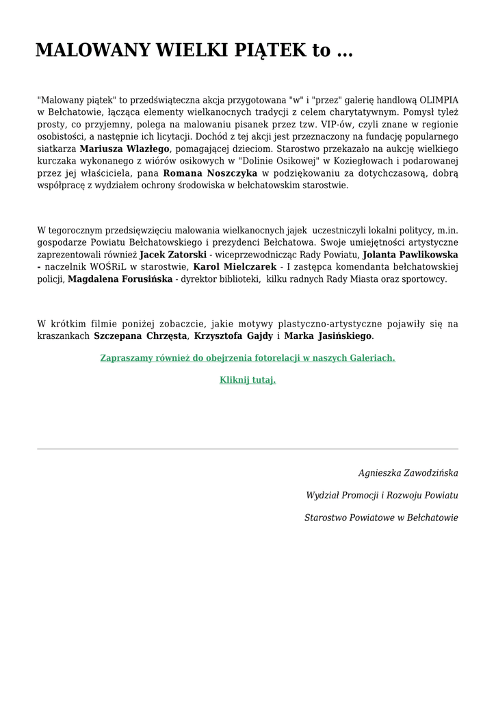MALOWANY WIELKI PIĄTEK to ... "Malowany piątek" to przedświąteczna akcja przygotowana "w" i "przez" galerię handlową OLIMPIA w Bełchatowie, łącząca elementy wielkanocnych tradycji z celem charytatywnym. Pomysł tyleż prosty, co przyjemny, polega na malowaniu pisanek przez tzw. VIP-ów, czyli znane w regionie osobistości, a następnie ich licytacji. Dochód z tej akcji jest przeznaczony na fundację popularnego siatkarza Mariusza Wlazłego, pomagającej dzieciom. Starostwo przekazało na aukcję wielkiego kurczaka wykonanego z wiórów osikowych w "Dolinie Osikowej" w Koziegłowach i podarowanej przez jej właściciela, pana Romana Noszczyka w podziękowaniu za dotychczasową, dobrą współpracę z wydziałem ochrony środowiska w bełchatowskim starostwie. W tegorocznym przedsięwzięciu malowania wielkanocnych jajek uczestniczyli lokalni politycy, m.in. gospodarze Powiatu Bełchatowskiego i prezydenci Bełchatowa. Swoje umiejętności artystyczne zaprezentowali również Jacek Zatorski - wiceprzewodnicząc Rady Powiatu, Jolanta Pawlikowska - naczelnik WOŚRiL w starostwie, Karol Mielczarek - I zastępca komendanta bełchatowskiej policji, Magdalena Forusińska - dyrektor biblioteki, kilku radnych Rady Miasta oraz sportowcy. W krótkim filmie poniżej zobaczcie, jakie motywy plastyczno-artystyczne pojawiły się na kraszankach Szczepana Chrzęsta, Krzysztofa Gajdy i Marka Jasińskiego. Zapraszamy również do obejrzenia fotorelacji w naszych Galeriach. Kliknij tutaj. Agnieszka Zawodzińska Wydział Promocji i Rozwoju Powiatu Starostwo Powiatowe w Bełchatowie