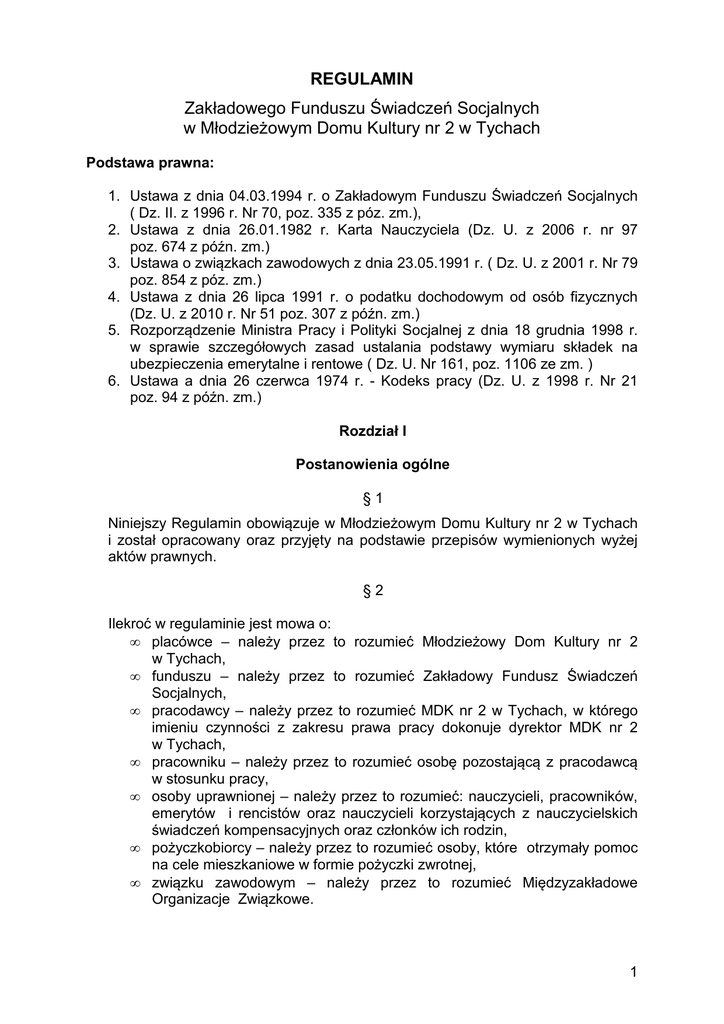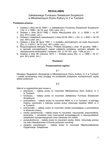 REGULAMIN Zakładowego Funduszu Świadczeń Socjalnych w Młodzieżowym Domu Kultury nr 2 w Tychach Podstawa prawna: 1. Ustawa z dnia 04.03.1994 r. o Zakładowym Funduszu Świadczeń Socjalnych ( Dz. II. z 1996 r. Nr 70, poz. 335 z póz. zm.), 2. Ustawa z dnia 26.01.1982 r. Karta Nauczyciela (Dz. U. z 2006 r. nr 97 poz. 674 z późn. zm.) 3. Ustawa o związkach zawodowych z dnia 23.05.1991 r. ( Dz. U. z 2001 r. Nr 79 poz. 854 z póz. zm.) 4. Ustawa z dnia 26 lipca 1991 r. o podatku dochodowym od osób fizycznych (Dz. U. z 2010 r. Nr 51 poz. 307 z późn. zm.) 5. Rozporządzenie Ministra Pracy i Polityki Socjalnej z dnia 18 grudnia 1998 r. w sprawie szczegółowych zasad ustalania podstawy wymiaru składek na ubezpieczenia emerytalne i rentowe ( Dz. U. Nr 161, poz. 1106 ze zm. ) 6. Ustawa a dnia 26 czerwca 1974 r. - Kodeks pracy (Dz. U. z 1998 r. Nr 21 poz. 94 z późn. zm.) Rozdział I Postanowienia ogólne §1 Niniejszy Regulamin obowiązuje w Młodzieżowym Domu Kultury nr 2 w Tychach i został opracowany oraz przyjęty na podstawie przepisów wymienionych wyżej aktów prawnych. §2 Ilekroć w regulaminie jest mowa o: • placówce – należy przez to rozumieć Młodzieżowy Dom Kultury nr 2 w Tychach, • funduszu – należy przez to rozumieć Zakładowy Fundusz Świadczeń Socjalnych, • pracodawcy – należy przez to rozumieć MDK nr 2 w Tychach, w którego imieniu czynności z zakresu prawa pracy dokonuje dyrektor MDK nr 2 w Tychach, • pracowniku – należy przez to rozumieć osobę pozostającą z pracodawcą w stosunku pracy, • osoby uprawnionej – należy przez to rozumieć: nauczycieli, pracowników, emerytów i rencistów oraz nauczycieli korzystających z nauczycielskich świadczeń kompensacyjnych oraz członków ich rodzin, • pożyczkobiorcy – należy przez to rozumieć osoby, które otrzymały pomoc na cele mieszkaniowe w formie pożyczki zwrotnej, • związku zawodowym – należy przez to rozumieć Międzyzakładowe Organizacje Związkowe. 1 §3 1. Środkami funduszu administruje dyrektor placówki lub osoba upoważniona posiadająca pisemne pełnomocnictwo. 2. Środki Funduszu są gromadzone na odrębnym rachunku bankowym. 3. Środki pozostające na rachunku bankowym Funduszu niewykorzystane w danym roku kalendarzowym przechodzą na rok następny. 4. Środki Funduszu na poszczególne formy pomocy socjalnej są przyznawane w formie pieniężnej. Rozdział II Tworzenie Funduszu §4 Fundusz tworzy się z corocznego odpisu: 1. Odpis podstawowy: • dla nauczycieli dokonuje się corocznie odpisu na zakładowy fundusz świadczeń socjalnych w wysokości ustalonej jako iloczyn planowanej, przeciętnej w danym roku kalendarzowym, liczby nauczycieli zatrudnionych w pełnym i niepełnym wymiarze zajęć skorygowanej w końcu roku do faktycznej przeciętnej liczby zatrudnionych nauczycieli (po podliczeniu na pełny wymiar zajęć ) i 110 % kwoty bazowej , o której mowa w art. 30 ust.3, obowiązującej w dniu 1 stycznia danego roku. • dla nauczycieli będących emerytami i rencistami lub nauczycielami pobierającymi nauczycielskie świadczenie kompensacyjne dokonuje się odpisu na zakładowy fundusz świadczeń socjalnych w wysokości z 5% emerytur i rent byłych nauczycieli oraz nauczycielskich świadczeń kompensacyjnych. • dla pracowników samorządowych wysokość odpisu podstawowego wynosi na jednego zatrudnionego, 37,5% odpisu przeciętnego wynagrodzenia miesięcznego w gospodarce narodowej w roku poprzednim lub drugim półroczu roku poprzedniego, jeżeli przeciętne wynagrodzenie z tego okresu stanowi kwotę wyższą, • pracodawca sprawujący opiekę socjalną nad emerytami i rencistami zwiększa Fundusz o 6,25% odpisu przeciętnego wynagrodzenie miesięcznego, na każdego emeryta nie będącego nauczycielem a objętych opieką socjalną, • na każdą zatrudnioną osobę w stosunku do której orzeczono znaczny lub umiarkowany stopień niepełnosprawności wysokość odpisu podstawowego może być zwiększona o 6,25% przeciętnego wynagrodzenia miesięcznego w gospodarce narodowej w roku poprzednim lub drugim półroczu roku poprzedniego, jeżeli przeciętne wynagrodzenie z tego okresu stanowi kwotę wyższą. 2 §5 1. Środki Funduszu zwiększa się: o odpis podstawowy - zgodnie z art. 5 ust. 5 ustawy zakładowym funduszu świadczeń socjalnych dla byłych pracowników – emerytów i rencistów ( z wyjątkiem byłych nauczycieli ), - zgodnie z art. 53 ust. 2 ustawy Karta Nauczyciela dla byłych nauczycieli – emerytów i rencistów, - o odsetki od środków Funduszu gromadzonych na rachunku bankowym, - o odsetki od oprocentowania pożyczek udzielonych na cele mieszkaniowe, - o darowizny oraz zapisy osób fizycznych i prawnych. 2. Odpisy i zwiększenia, o których mowa w § 4 ust. 2 i § 5 ust.1 tworzą jeden Fundusz. Rozdział III Osoby uprawnione do korzystania z funduszu §6 1. Uprawnionymi do korzystania z Funduszu są: • pracownicy zatrudnieni na podstawie umowy o pracę, powołania, mianowania – w pełnym i niepełnym wymiarze czasu pracy, • pracownicy przebywający na urlopach wychowawczych / macierzyńskich, • nauczyciele przebywający na urlopach zdrowotnych, • nauczyciele w stanie nieczynnym, • nauczyciele korzystający z nauczycielskich świadczeń kompensacyjnych • emeryci i renciści – dla których placówka była ostatnim miejscem pracy. • członkowie rodzin zmarłego pracownika, emeryta i rencisty, nauczycieli pobierających nauczycielskie świadczenie kompensacyjne, jeżeli byli na jego utrzymaniu i są uprawnieni do pobierania renty rodzinnej. §7 1. Ze świadczeń socjalnych mogą korzystać także członkowie rodzin osób uprawnionych do świadczeń z Funduszu. 2. Za członków rodzin, o których mowa w ust. 1 uważa się: • współmałżonków, • dzieci ( własne, przysposobione, przyjęte na wychowanie w ramach rodziny zastępczej, dzieci współmałżonka,) pozostające na utrzymaniu osoby uprawnionej w w
