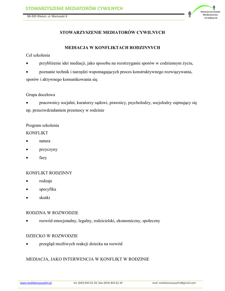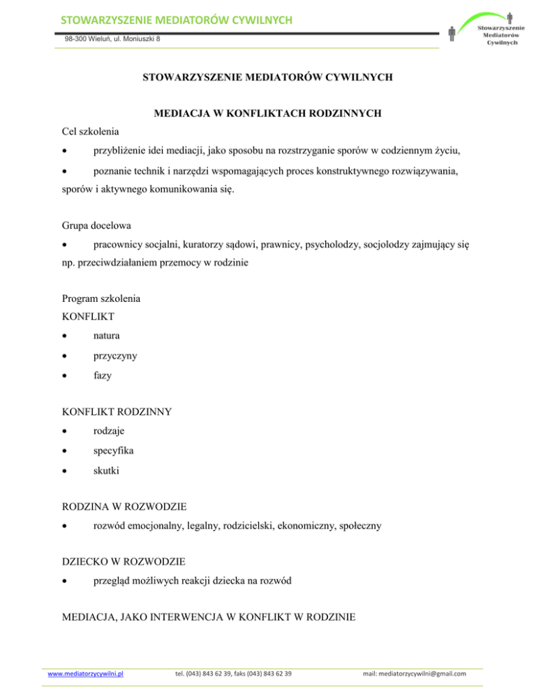 STOWARZYSZENIE MEDIATORÓW CYWILNYCH 98-300 Wieluń, ul. Moniuszki 8 STOWARZYSZENIE MEDIATORÓW CYWILNYCH MEDIACJA W KONFLIKTACH RODZINNYCH Cel szkolenia przybliżenie idei mediacji, jako sposobu na rozstrzyganie sporów w codziennym życiu, poznanie technik i narzędzi wspomagających proces konstruktywnego rozwiązywania, sporów i aktywnego komunikowania się. Grupa docelowa pracownicy socjalni, kuratorzy sądowi, prawnicy, psycholodzy, socjolodzy zajmujący się np. przeciwdziałaniem przemocy w rodzinie Program szkolenia KONFLIKT natura przyczyny fazy KONFLIKT RODZINNY rodzaje specyfika skutki RODZINA W ROZWODZIE rozwód emocjonalny, legalny, rodzicielski, ekonomiczny, społeczny DZIECKO W ROZWODZIE przegląd możliwych reakcji dziecka na rozwód MEDIACJA, JAKO INTERWENCJA W KONFLIKT W RODZINIE www.mediatorzycywilni.pl tel. (043) 843 62 39, faks (043) 843 62 39 mail: [email protected] definicja i zasady mediacji etapy mediacji rodzaje mediacji rola i zadania mediatora wskazania i przeciwwskazania do mediacji Metody szkolenia: Mini wykład z prezentacją, ćwiczenia indywidualne i grupowe, odgrywanie scenek. Prowadzący szkolenie: Członkowie Stowarzyszenia mediatorów Cywilnych Terminy szkolenia:13.12.2013r. lub dowolny, wcześniej ustalony z mediatorami Koszt szkolenia: 250,00 zł/ osobę ( przy grupie od 4-12 osób) Miejsce szkolenia: Łódź Zgłoszenia (telefonicznie) przyjmuje: Wieluń: Dorota Kamieniecka(693 830 857) Wrocław(Oława): Grażyna Górska(884 989 384) Łódź: Joanna Wieremiejewicz- Podkościelna (608 061 721) Po otrzymaniu zgłoszenia prześlemy Państwu formularz zgłoszeniowy. Podany program, jest programem „wyjściowym”. Wspólnie z odbiorcami ustalamy zakres tematyki i elementy, które powinny znaleźć się w programie szkolenia. www.mediatorzycywilni.pl tel. (043) 843 62 39, faks (043) 843 62 39 mail: [email protected]