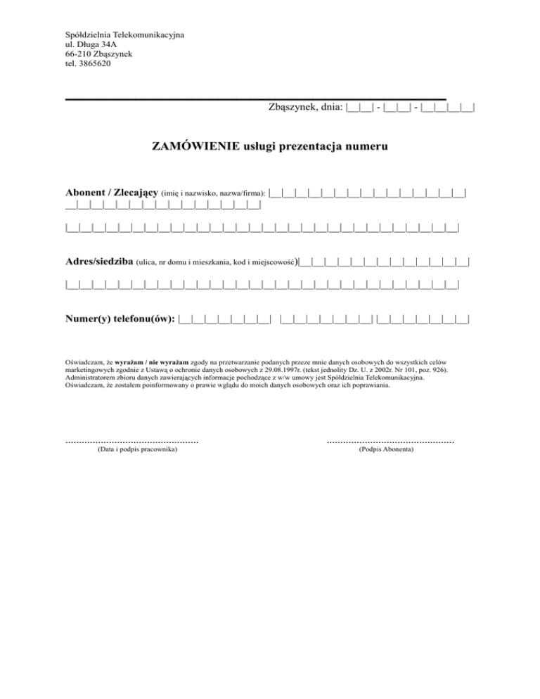 Spółdzielnia Telekomunikacyjna ul. Długa 34A 66-210 Zbąszynek tel. 3865620 ____________________________________________________________ Zbąszynek, dnia: |__|__| - |__|__| - |__|__|__|__| ZAMÓWIENIE usługi prezentacja numeru Abonent / Zlecający (imię i nazwisko, nazwa/firma): |__|__|__|__|__|__|__|__|__|__|__|__|__|__|__| __|__|__|__|__|__|__|__|__|__|__|__|__|__|__| |__|__|__|__|__|__|__|__|__|__|__|__|__|__|__|__|__|__|__|__|__|__|__|__|__|__|__|__|__|__| Adres/siedziba (ulica, nr domu i mieszkania, kod i miejscowość)|__|__|__|__|__|__|__|__|__|__|__|__|__| |__|__|__|__|__|__|__|__|__|__|__|__|__|__|__|__|__|__|__|__|__|__|__|__|__|__|__|__|__|__| Numer(y) telefonu(ów): |__|__|__|__|__|__|__| |__|__|__|__|__|__|__| |__|__|__|__|__|__|__| Oświadczam, że wyrażam / nie wyrażam zgody na przetwarzanie podanych przeze mnie danych osobowych do wszystkich celów marketingowych zgodnie z Ustawą o ochronie danych osobowych z 29.08.1997r. (tekst jednolity Dz. U. z 2002r. Nr 101, poz. 926). Administratorem zbioru danych zawierających informacje pochodzące z w/w umowy jest Spółdzielnia Telekomunikacyjna. Oświadczam, że zostałem poinformowany o prawie wglądu do moich danych osobowych oraz ich poprawiania. ................................................. (Data i podpis pracownika) ............................................... (Podpis Abonenta)
