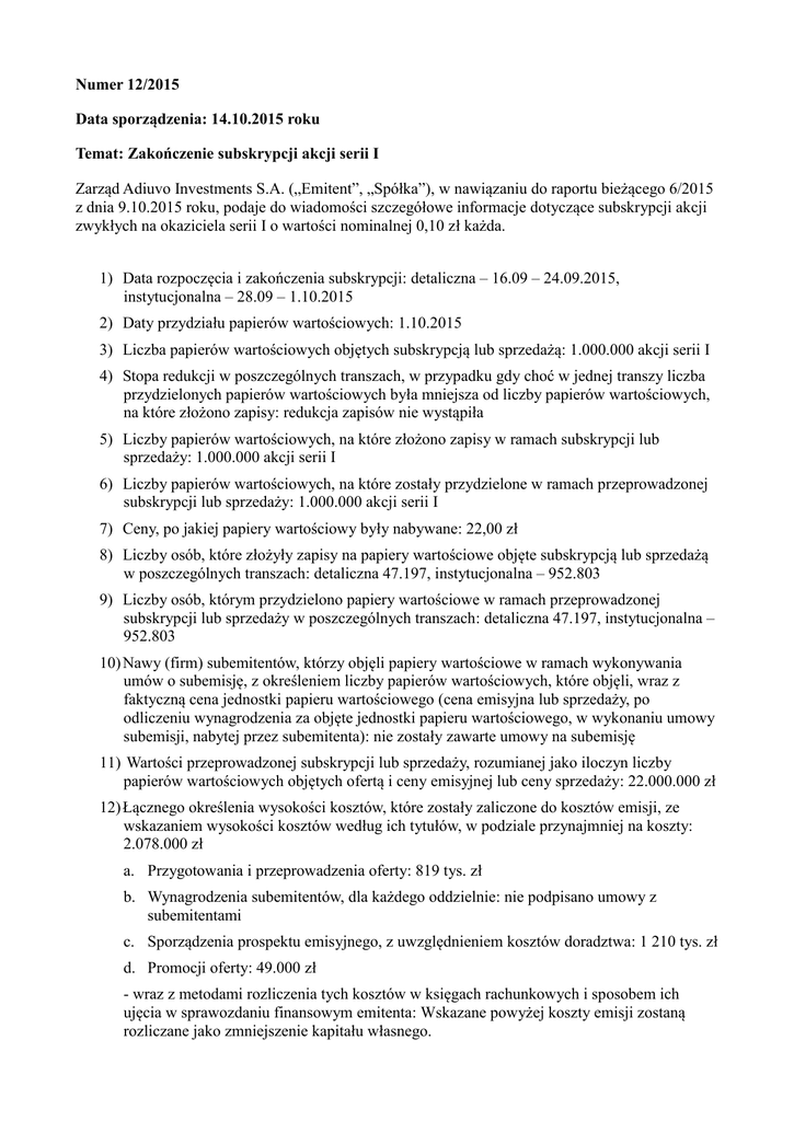 Numer 12/2015 Data sporządzenia: 14.10.2015 roku Temat: Zakończenie subskrypcji akcji serii I Zarząd Adiuvo Investments S.A. („Emitent”, „Spółka”), w nawiązaniu do raportu bieżącego 6/2015 z dnia 9.10.2015 roku, podaje do wiadomości szczegółowe informacje dotyczące subskrypcji akcji zwykłych na okaziciela serii I o wartości nominalnej 0,10 zł każda. 1) Data rozpoczęcia i zakończenia subskrypcji: detaliczna – 16.09 – 24.09.2015, instytucjonalna – 28.09 – 1.10.2015 2) Daty przydziału papierów wartościowych: 1.10.2015 3) Liczba papierów wartościowych objętych subskrypcją lub sprzedażą: 1.000.000 akcji serii I 4) Stopa redukcji w poszczególnych transzach, w przypadku gdy choć w jednej transzy liczba przydzielonych papierów wartościowych była mniejsza od liczby papierów wartościowych, na które złożono zapisy: redukcja zapisów nie wystąpiła 5) Liczby papierów wartościowych, na które złożono zapisy w ramach subskrypcji lub sprzedaży: 1.000.000 akcji serii I 6) Liczby papierów wartościowych, na które zostały przydzielone w ramach przeprowadzonej subskrypcji lub sprzedaży: 1.000.000 akcji serii I 7) Ceny, po jakiej papiery wartościowy były nabywane: 22,00 zł 8) Liczby osób, które złożyły zapisy na papiery wartościowe objęte subskrypcją lub sprzedażą w poszczególnych transzach: detaliczna 47.197, instytucjonalna – 952.803 9) Liczby osób, którym przydzielono papiery wartościowe w ramach przeprowadzonej subskrypcji lub sprzedaży w poszczególnych transzach: detaliczna 47.197, instytucjonalna – 952.803 10) Nawy (firm) subemitentów, którzy objęli papiery wartościowe w ramach wykonywania umów o subemisję, z określeniem liczby papierów wartościowych, które objęli, wraz z faktyczną cena jednostki papieru wartościowego (cena emisyjna lub sprzedaży, po odliczeniu wynagrodzenia za objęte jednostki papieru wartościowego, w wykonaniu umowy subemisji, nabytej przez subemitenta): nie zostały zawarte umowy na subemisję 11) Wartości przeprowadzonej subskrypcji lub sprzedaży, rozumianej jako iloczyn liczby papierów wartościowych objętych ofertą i ceny emisyjnej lub ceny sprzedaży: 22.000.000 zł 12) Łącznego określenia wysokości kosztów, które zostały zaliczone do kosztów emisji, ze wskazaniem wysokości kosztów według ich tytułów, w podziale przynajmniej na koszty: 2.078.000 zł a. Przygotowania i przeprowadzenia oferty: 819 tys. zł b. Wynagrodzenia subemitentów, dla każdego oddzielnie: nie podpisano umowy z subemitentami c. Sporządzenia prospektu emisyjnego, z uwzględnieniem kosztów doradztwa: 1 210 tys. zł d. Promocji oferty: 49.000 zł - wraz z metodami rozliczenia tych kosztów w księgach rachunkowych i sposobem ich ujęcia w sprawozdaniu finansowym emitenta: Wskazane powyżej koszty emisji zostaną rozliczane jako zmniejszenie kapitału własnego. 13) średniego kosztu przeprowadzenia subskrypcji lub sprzedaży przypadającego na jednostkę papieru wartościowego objętego subskrypcją lub sprzedażą: 2,078 zł Podstawa prawna: Art. 56 ust. 1 pkt 2 Ustawy o ofercie - informacje bieżące i okresowe Osoby reprezentujące Spółkę: Marek Orłowski - Prezes Zarządu Anna Aranowska-Bablok – Członek Zarządu