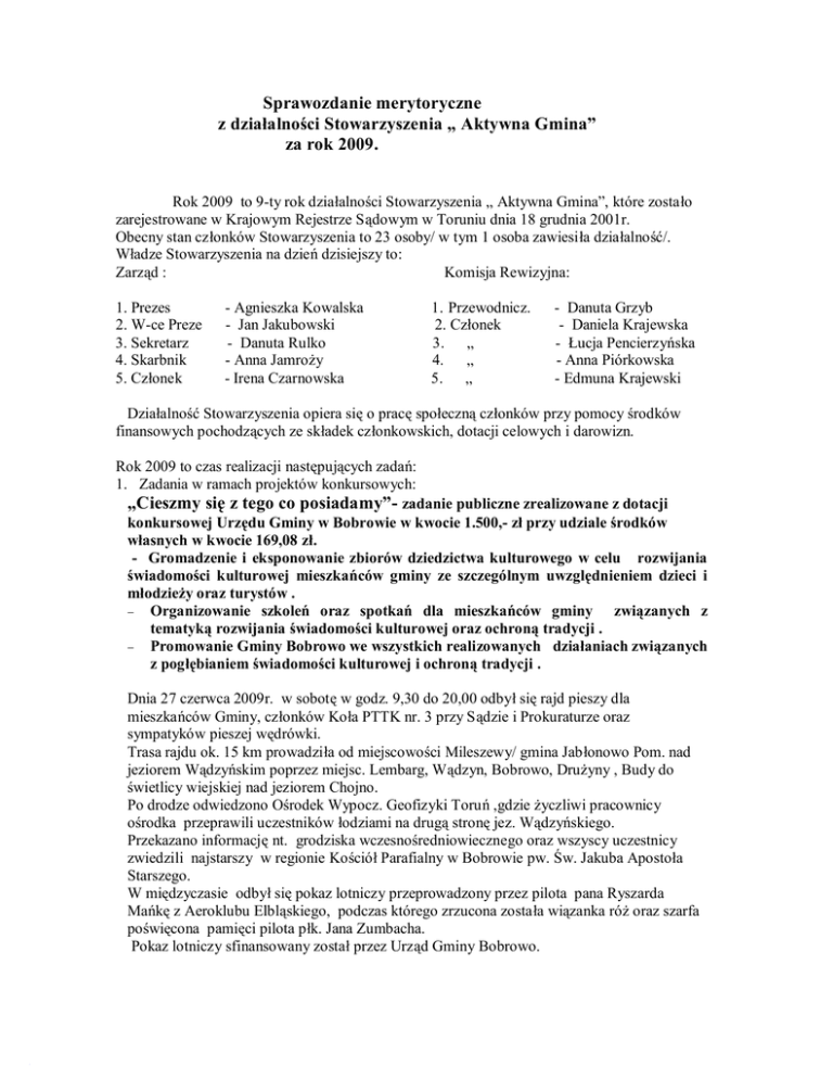 Sprawozdanie merytoryczne z działalności Stowarzyszenia „ Aktywna Gmina” za rok 2009. Rok 2009 to 9-ty rok działalności Stowarzyszenia „ Aktywna Gmina”, które zostało zarejestrowane w Krajowym Rejestrze Sądowym w Toruniu dnia 18 grudnia 2001r. Obecny stan członków Stowarzyszenia to 23 osoby/ w tym 1 osoba zawiesiła działalność/. Władze Stowarzyszenia na dzień dzisiejszy to: Zarząd : Komisja Rewizyjna: 1. Prezes 2. W-ce Preze 3. Sekretarz 4. Skarbnik 5. Członek - Agnieszka Kowalska - Jan Jakubowski - Danuta Rulko - Anna Jamroży - Irena Czarnowska 1. Przewodnicz. 2. Członek 3. „ 4. „ 5. „ - Danuta Grzyb - Daniela Krajewska - Łucja Pencierzyńska - Anna Piórkowska - Edmuna Krajewski Działalność Stowarzyszenia opiera się o pracę społeczną członków przy pomocy środków finansowych pochodzących ze składek członkowskich, dotacji celowych i darowizn. Rok 2009 to czas realizacji następujących zadań: 1. Zadania w ramach projektów konkursowych: „Cieszmy się z tego co posiadamy”- zadanie publiczne zrealizowane z dotacji konkursowej Urzędu Gminy w Bobrowie w kwocie 1.500,- zł przy udziale środków własnych w kwocie 169,08 zł. - Gromadzenie i eksponowanie zbiorów dziedzictwa kulturowego w celu rozwijania świadomości kulturowej mieszkańców gminy ze szczególnym uwzględnieniem dzieci i młodzieży oraz turystów . − Organizowanie szkoleń oraz spotkań dla mieszkańców gminy związanych z tematyką rozwijania świadomości kulturowej oraz ochroną tradycji . − Promowanie Gminy Bobrowo we wszystkich realizowanych działaniach związanych z pogłębianiem świadomości kulturowej i ochroną tradycji . Dnia 27 czerwca 2009r. w sobotę w godz. 9,30 do 20,00 odbył się rajd pieszy dla mieszkańców Gminy, członków Koła PTTK nr. 3 przy Sądzie i Prokuraturze oraz sympatyków pieszej wędrówki. Trasa rajdu ok. 15 km prowadziła od miejscowości Mileszewy/ gmina Jabłonowo Pom. nad jeziorem Wądzyńskim poprzez miejsc. Lembarg, Wądzyn, Bobrowo, Drużyny , Budy do świetlicy wiejskiej nad jeziorem Chojno. Po drodze odwiedzono Ośrodek Wypocz. Geofizyki Toruń ,gdzie życzliwi pracownicy ośrodka przeprawili uczestników łodziami na drugą stronę jez. Wądzyńskiego. Przekazano informację nt. grodziska wczesnośredniowiecznego oraz wszyscy uczestnicy zwiedzili najstarszy w regionie Kościół Parafialny w Bobrowie pw. Św. Jakuba Apostoła Starszego. W międzyczasie odbył się pokaz lotniczy przeprowadzony przez pilota pana Ryszarda Mańkę z Aeroklubu Elbląskiego, podczas którego zrzucona została wiązanka róż oraz szarfa poświęcona pamięci pilota płk. Jana Zumbacha. Pokaz lotniczy sfinansowany został przez Urząd Gminy Bobrowo. -2Po poczęstunku uczestników rajdu grochówką , ciastem i kawą w miejscowym Gminnym Ośrodku Kultury goście zwiedzili Izbę Dziedzictwa Kulturowego im. płk. Jana Zumbacha dowódcy i pilota Dywizjonu 303. oraz tablicę pamiątkową poświęconą Jego pamięci. Dalsza trasa rajdu prowadziła ścieżką przyrodniczo –regionalno- dydaktyczną z poznaniem rezerwatów torfowych i roślinnych, „ przepaści” ze swoją legendą i dalej nad brzegami jeziora Chojno. Rajd podsumowano w Świetlicy Wiejskiej w Budach, w rajdzie wzięło udział około 80 osób. Była to okazja do promocji Gminy Bobrowo, jej ciekawych miejsc , ludzi, historii i tradycji . Dnia 26 października 2009r. odbyło się w Gminnym Ośrodku Kultury w Bobrowie szkolenie pt. „ Zachowanie dziedzictwa kulturowego regionu- cele, formy, dobre praktyki”. Wykład przeprowadziła dr Olga Kwiatkowska z Muzeum Etnograficznego w Toruniu. W szkoleniu wzięło udział 16 osób na wysłanych 60 zaproszeń. To szkolenie zaowocowało tym ,że nawiązaliśmy kontakt z pracownikami Muzeum i w m-cu grudniu grupa kobiet- przedstawicielek KGW skorzystała z zaproszenia do zwiedzania wystaw Muzeum oraz kiermaszu bożonarodzeniowego. Zgodnie z planem dnia 20 listopada 2009r. w Gminnym Ośrodku Kultury w Bobrowie odbyła się Wieczornica o Księżach „ Tych , którzy już odeszli”, gdzie przedstawiono sylwetki 26 Księży, którzy byli proboszczami parafii na terenie gminy Bobrowo. Scenariusz wieczornicy obejmował przedstawienie życiorysów Księży, wiersze i pieśni okolicznościowe oraz wystawę zdjęć i innych pamiątek , które udało się wypożyczyć i zgromadzić przez członków Stowarzyszenia. Życiorysy wspominanych Księży w większości uzyskaliśmy dzięki życzliwości Ks. Kanonika Jerzego Karola Kalinowskiego – Archiwiście Diecezjalnemu w Toruniu . Księża Proboszczowie z parafii Bobrowo, Grzybno, Kruszyny , Nieżywięć , Mszano i Wrocki pomogli w ustaleniu nazwisk zmarłych Księży poszczególnych parafii. Nie jesteśmy pewni, czy nasza pamięć była na tyle dobra, aby wspomnieć wszystkich Księży, których życie związane było z mieszkańcami naszej Gminy. Mamy nadzieję, że wszyscy obecni na wieczornicy mieli okazję tych duszpasterzy sobie przypomnieć. Wystawa była również czynna w niedzielę. Wspominani księża to: 1. Ks. Józef Brunka 1917- 1988 2. Ks. Ossowski Henryk 1857- 1930 3. Ks. Turulski Marian 1857- 1906 4. Ks. Sentkowski Alfons 1872- 1950 5. Ks. Galla Antoni 1838- 1905 6 .Ks. Fischoeder Franciszek 1870- 1956 7. Ks. Kroplewski Albin 1878- 1942 8. Ks. Michnowski Marian Jan 1881- 1940 9. Ks. Schulz Brunon 1853- 1927 10.Ks. Hundsdorf Fryderyk 1848- 1915 11.Ks. Arndt Jan 1883- 1923 12.Ks. Jaranowski Konstanty 1888- 1939 13.Ks. Panek Paweł 1900- 1980 14.Ks. Stachowski Piotr 1885- 1962 15.Ks. Gierszewski Leon /zak.o.Gerard/ 1908- 1963 16.Ks. Hintz Franciszek I 1907- 1951 17.Ks. Kownacki Marcin 1886- 1942 18.Ks. Lubowski Brunon 1875- 1933 -319.Ks. Dąbrowski Bernard 20.Ks. Bieliński Romuald Jan Hubert 21.Ks. Szachnitowski Jan Stanisław 22.Ks. Szczepański Alfons 23.Ks. Żmijewski Alfons 24.Ks. Empel Józef 25.Ks. Malinowski Stefan 26.Ks. Szczepański Stanisław Michał 1902- 1971 1924- 1989 1919