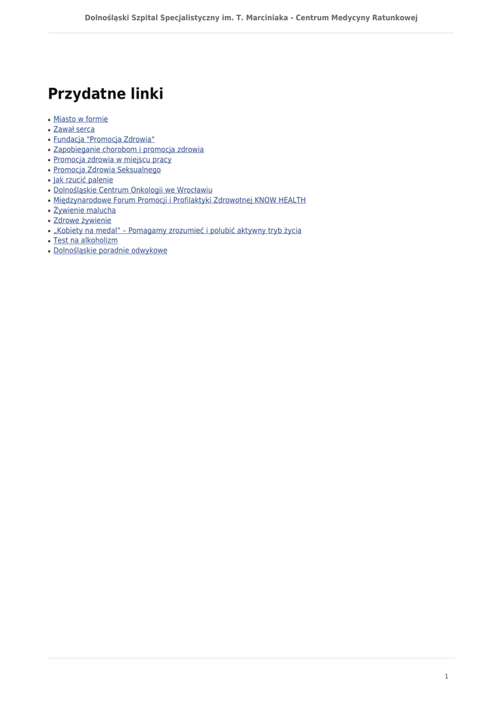 Dolnośląski Szpital Specjalistyczny im. T. Marciniaka - Centrum Medycyny Ratunkowej Przydatne linki ● ● ● ● ● ● ● ● ● ● ● ● ● ● Miasto w formie Zawał serca Fundacja "Promocja Zdrowia" Zapobieganie chorobom i promocja zdrowia Promocja zdrowia w miejscu pracy Promocja Zdrowia Seksualnego Jak rzucić palenie Dolnośląskie Centrum Onkologii we Wrocławiu Międzynarodowe Forum Promocji i Profilaktyki Zdrowotnej KNOW HEALTH Żywienie malucha Zdrowe żywienie „Kobiety na medal” – Pomagamy zrozumieć i polubić aktywny tryb życia Test na alkoholizm Dolnośląskie poradnie odwykowe 1