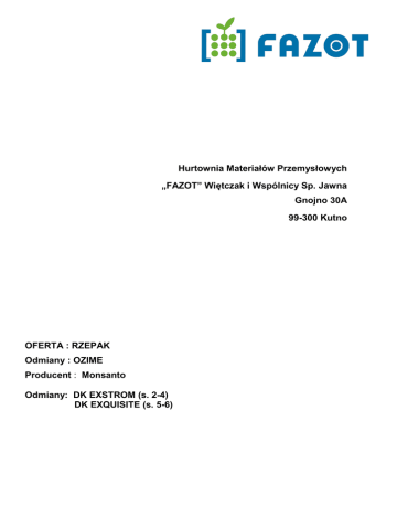 Hurtownia Materiałów Przemysłowych „FAZOT” Więtczak i Wspólnicy Sp. Jawna Gnojno 30A 99-300 Kutno OFERTA : RZEPAK Odmiany : OZIME Producent : Monsanto Odmiany: DK EXSTROM (s. 2-4) DK EXQUISITE (s. 5-6) 2 1. DK EXSTROM To odmiana uniwersalna, najwyższe plony osiąga na lekkich, średnich i mniej zasobnych glebach przy mniejszych dawkach nawożenia azotowego. Przynosi bardzo wysokie i stabilne plony. W Polsce zarejestrowana od roku 2012. Cechy charakterystyczne: - podwyższona odporność na osypywanie nasion, bardzo dobra zimotrwałość, tolerancja na choroby: o bardzo wysoka tolerancja na zgniliznę kapustnych (RLM – 7), o wysoka tolerancja na zgniliznę twardzikową. - optymalny wigor jesienny, bez tendencji do nadmiernego wydłużania szyjki korzeniowej przed zimą średniowczesne wznowienie wegetacji po zimie. - bardzo duża zawartość tłuszczu w nasionach. - nie łamie się i nie wylega przy zachowaniu rekomendowanej obsady roślin. Cechy rolnicze: o termin kwitnienia: średniowczesny, o termin dojrzewania: średniowczesny, o wysokość roślin: wysokie. Rekomendacje agrotechniczne: • odmiana polecana we wszystkich regionach Polski, • siew we wcześniejszym lub optymalnym terminie agrotechnicznym dla danego region, • norma wysiewu 50-55 nasion/m2* tak aby uzyskać obsadę docelową 45-50 roślin/m2. W opóźnionym terminie siewu zwiększyć normę wysiewu do 60 nasion/m2, • w celu uzyskania maksymalnej ilości rozgałęzień bocznych z dużą ilością łuszczyn należy zachować zalecaną obsadę roślin, stosując regulatory wzrostu jesienią i wiosną, • obowiązkowa jest ochrona przed: pchełką ziemną i rzepakową, gnatarzem rzepakowcem i chowaczem galasówkiem od fazy liścieni rzepaku, • nawożenie – wiosenne nawożenie N w dwóch dawkach: pierwsza dawka 3 w wysokości 80 kg/ha, druga dawka nie później niż 2 tygodnie przed rozpoczęciem kwitnienia. Odmiana umożliwia osiągnięcie bardzo wysokich plonów przy wiosennym nawożeniu azotowym od 120 do 160 kg/ha, • oprócz odpowiedniej dawki N oraz P i K, w razie potrzeby należy zastosować również nawożenie S, B, Ca, Mg oraz innymi mikroelementami, • konieczne jest zastosowanie fungicydu o funkcji regulatora wzrostu np. Caryx 240 SL 1L/ha, oprysk jesienią w fazie 4-6 liścia (BBCH14-16), • wiosną zaleca się zastosowanie fungicydu np. Caryx 1L/ha w fazie wydłużania łodygi (BBCH32-35) dla pól z bardzo dobrymi glebami, dużą ilością opadów i wysokim nawożeniem azotowym, • obowiązkowe jest stosowanie fungicydów przeciwko zgniliźnie twardzikowej w fazie opadania pierwszych płatków kwiatowych (BBCH 60-61), • w czasie żniw, w celu przyspieszenia i wyrównania dojrzewania, zaleca się zastosowanie preparatu Roundup 360 SL lub Roundup 360 Plus 4 l/ha lub Roundup Trans Energy 450 SL 1,5-3,2 l/ha, gdy wilgotność nasion wynosi poniżej 30%. 4 2. DK EXQUISITE Odmiana, przy której najwyższe plony można uzyskać na glebach dobrych i bardzo dobrych. W Polsce zarejestrowano w 2011 r., a w 2012 r. plon z tej odmiany według PDO COBORU wyniósł 121% wzorca. Cechy charakterystyczne: - wzorcowa zimotrwałość, rośliny o bardzo silnym systemie korzeniowym – nie łamie się i nie wylega, podwyższona odporność na osypywanie nasion optymalny wigor jesienny, nie ma tendencji do wydłużania szyjki korzeniowej posiada zdolność do kompensacji przy tworzeniu rozgałęzień bocznych, co jest niezwykle ważne przy obniżonej obsadzie roślin wysoka zawartość tłuszczu w nasionach tolerancja na choroby: o bardzo wysoka tolerancja na zgniliznę kapustnych (RLM – 7) o wysoka tolerancja na zgniliznę twardzikową. Cechy rolnicze: o termin kwitnienia: średniopóźny, o termin dojrzewania: średniopóźny, o wysokość roślin: wysokie. Rekomendacje agrotechniczne: • odmiana mieszańcowa polecana do uprawy we wszystkich regionach Polski, • wysokie plony agrotechnicznej, osiąga się przy zastosowaniu intensywnej technologii • siew we wcześniejszym lub optymalnym terminie agrotechnicznym dla danego region, • norma wysiewu około 45 nasion /m2* tak aby uzyskać obsadę docelową 40 roślin /m2, • obowiązkowa jest ochrona przed: pchełką ziemną i rzepakową, gnatarzem rzepakowcem i chowaczem galasówkiem od fazy liścieni rzepaku, • nawożenie – wiosenne nawożenie N w dwóch dawkach: pierwsza dawka w wysokości 80 kg/ha, druga dawka nie później niż 2 tygodnie przed rozpoczęciem kwitnienia. Dobrze reaguje na wysoki poziom nawożenia azotowego (180 kg/ha), ale zalecana jest regulacja wzrostu jesienią i wiosną, • oprócz odpowiedniej dawki N oraz P i K, w razie potrzeby należy zastosować również nawożenie S, B, Ca, Mg oraz innymi mikroelementami, 5 • konieczne jest zastosowanie fungicydu o funkcji regulatora wzrostu np. Caryx 240 SL 1L/ha, oprysk jesienią w fazie 4-6 liścia (BBCH14-16), • wiosną zaleca się zastosowanie fungicydu np. Caryx 1L/ha w fazie wydłużania łodygi (BBCH32-35) dla pól z bardzo dobrymi glebami, dużą ilością opadów i wysokim nawożeniem azotowym, • obowiązkowe jest stosowanie fungicydów przeciwko zgniliźnie twardzikowej w fazie opadania pierwszych płatków kwiatowych (BBCH 60-61), • w czasie żniw, w celu przyspieszenia i wyrównania dojrzewania, zaleca się zastosowanie preparatu Roundup 360 SL lub Roundup 360PLUS 4 l/ha lub Roundup Trans Energy 450 SL 1,5-3,2 l/ha , gdy wilgotność nasion wynosi poniżej 30%.