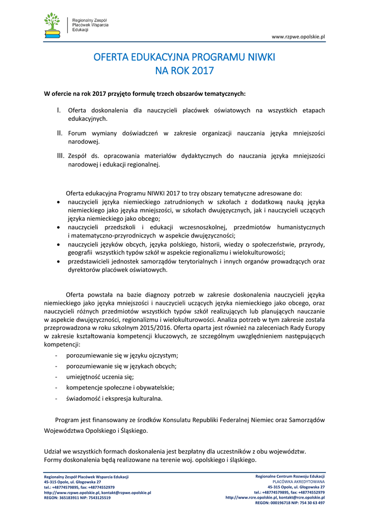 www.rzpwe.opolskie.pl OFERTA EDUKACYJNA PROGRAMU NIWKI NA ROK 2017 W ofercie na rok 2017 przyjęto formułę trzech obszarów tematycznych: I. Oferta doskonalenia dla nauczycieli placówek oświatowych na wszystkich etapach edukacyjnych. II. Forum wymiany doświadczeń w zakresie organizacji nauczania języka mniejszości narodowej. III. Zespół ds. opracowania materiałów dydaktycznych do nauczania języka mniejszości narodowej i edukacji regionalnej. Oferta edukacyjna Programu NIWKI 2017 to trzy obszary tematyczne adresowane do: nauczycieli języka niemieckiego zatrudnionych w szkołach z dodatkową nauką języka niemieckiego jako języka mniejszości, w szkołach dwujęzycznych, jak i nauczycieli uczących języka niemieckiego jako obcego; nauczycieli przedszkoli i edukacji wczesnoszkolnej, przedmiotów humanistycznych i matematyczno-przyrodniczych w aspekcie dwujęzyczności; nauczycieli języków obcych, języka polskiego, historii, wiedzy o społeczeństwie, przyrody, geografii wszystkich typów szkół w aspekcie regionalizmu i wielokulturowości; przedstawicieli jednostek samorządów terytorialnych i innych organów prowadzących oraz dyrektorów placówek oświatowych. Oferta powstała na bazie diagnozy potrzeb w zakresie doskonalenia nauczycieli języka niemieckiego jako języka mniejszości i nauczycieli uczących języka niemieckiego jako obcego, oraz nauczycieli różnych przedmiotów wszystkich typów szkół realizujących lub planujących nauczanie w aspekcie dwujęzyczności, regionalizmu i wielokulturowości. Analiza potrzeb w tym zakresie została przeprowadzona w roku szkolnym 2015/2016. Oferta oparta jest również na zaleceniach Rady Europy w zakresie kształtowania kompetencji kluczowych, ze szczególnym uwzględnieniem następujących kompetencji: - porozumiewanie się w języku ojczystym; - porozumiewanie się w językach obcych; - umiejętność uczenia się; - kompetencje społeczne i obywatelskie; - świadomość i ekspresja kulturalna. Program jest finansowany ze środków Konsulatu Republiki Federalnej Niemiec oraz Samorządów Województwa Opolskiego i Śląskiego. Udział we wszystkich formach doskonalenia jest bezpłatny dla uczestników z obu województw. Formy doskonalenia będą realizowane na terenie woj. opolskiego i śląskiego. Regionalny Zespół Placówek Wsparcia Edukacji 45-315 Opole, ul. Głogowska 27 tel.: +48774579895, fax: +48774552979 http://www.rzpwe.opolskie.pl, [email protected] REGON: 365183911 NIP: 7543125519 Regionalne Centrum Rozwoju Edukacji PLACÓWKA AKREDYTOWANA 45-315 Opole, ul. Głogowska 27 tel.: +48774579895, fax: +48774552979 http://www.rcre.opolskie.pl, [email protected] REGON: 000196718 NIP: 754 30 63 497 Ogólne założenia Programu Niwki Posługiwanie się językiem ojczystym i językami obcymi jest podstawą sukcesu Europy. Wielojęzyczność umożliwia komunikację i zrozumienie – podstawowe elementy dające inspirację różnorodnym kulturom europejskim do podejmowania wspólnych przedsięwzięć. Z tego właśnie powodu nauczanie języka jest wartością nadrzędną. Zachęcając uczniów od najmłodszych lat do uczenia się języków obcych, nauczyciele pomagają młodym Europejczykom stać się bardziej otwartymi na inne kultury, zwiększyć swoją mobilność i możliwość kontynuowania nauki za granicą, nauczyć się współzawodniczyć na globalnym rynku pracy, stale podnosić swoją wiedzę i umiejętności związane z procesem uczenia się. Rozumieć i być rozumianym to podstawowe potrzeby człowieka, których spełnienie jest szczególnie ważne tam, gdzie spotykają się i wspólnie żyją różne grupy narodowościowe. Dotyczy to w równej mierze mniejszości niemieckiej oraz polskiej większości. Profesjonalne kształcenie nauczycieli języka niemieckiego jest kwestią kluczową dla wysokiej jakości nauczania tego języka i osiągnięcia przez ucznia sukcesu. Szczególnie w naszym regionie germaniści powinni stanowić przykład ludzi szanujących wartości, takie jak: otwartość na innych, tolerancja różnic kulturowych i chęć komunikowania się w języku obcym. Powinni dysponować rozległą, interdyscyplinarną wiedzą merytoryczną i metodyczną zarówno ucząc języka niemieckiego, jako języka obcego, jak i języka mniejszości narodowej. Nauka języka niemieckiego rozpoczyna się w przedszkolu, gdzie dzieci powinny uzyskać na tyle dobre kompetencje językowe, by mogły pogłębiać naukę na kolejnych etapach edukacyjnych. Na etapie przedszkolnym rozpoczyna się również etap kształtowania pewnych postaw i kompetencji. To nie jest stricte nauczanie języka, a jedynie prowadzenie zajęć w języku niemieckim, podczas których kształtuje się i wprowadza elementy z życia codziennego, które są wyznacznikami podtrzymującymi i kształtującymi tożsamość narodową. W naszym regionie staramy się poszerzać wiedzę o wielokulturowości Śląska. Jednym z celów Programu Niwki jest przyczynianie się do wzajemnego zrozumienia różnych grup ludności i wzbudzanie świadomości, że Śląsk ma tylko jedną – wspólną przyszłość. Śląsk jako obszar wielokulturowy, zawsze będzie odgrywać szczególną rolę w stosunkach polsko-niemieckich. Przygotowanie kreatywnych nauczycieli, którzy uczą nie tylko języka, czy innych przedmiotów, ale i funkcjonowania w wielokulturowym środowisku, to istotne zadanie Programu Niwki. Stale rosnące wymagania edukacyjne i zainteresowanie nauczycieli doskonaleniem zawodowym w zakresie metodyki i dydaktyki nauczania języka obcego i języka mniejszości narodowej, edukacji regionalnej i wielokulturowej oraz rozumienia relacji polsko- niemieckich potwierdzają potrzebę i konieczność kontynuowania Programu Niwki przy stałym monitorowaniu potrzeb tej grupy zawodowej, ze szczególnym naciskiem na promowanie języka niemieckiego jako dziedzictwa kulturowego w kontekście regionu o silnych wielokulturowych tradycjach, doskonalenie sprawności k