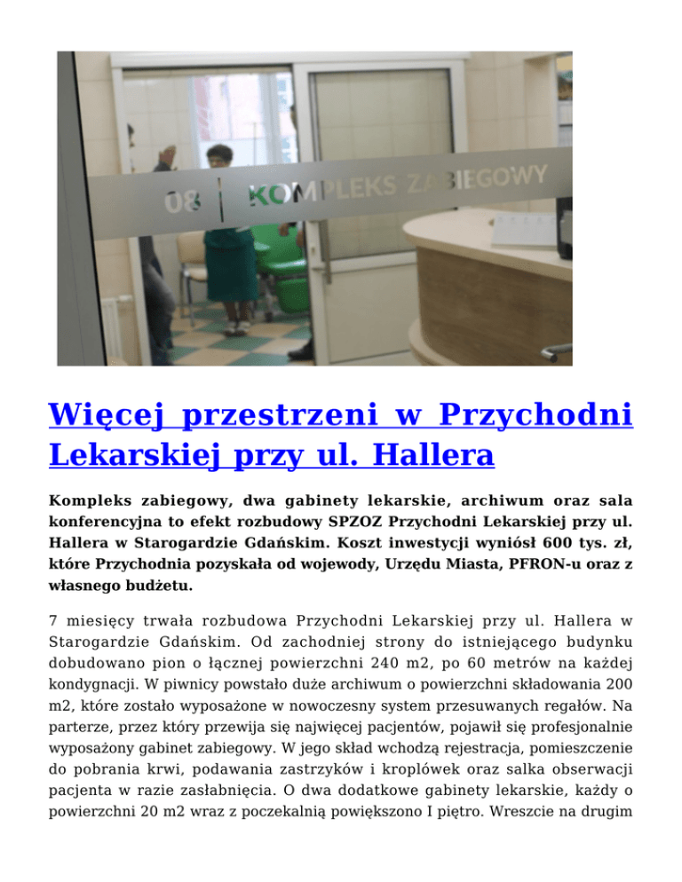 Więcej przestrzeni w Przychodni Lekarskiej przy ul. Hallera Kompleks zabiegowy, dwa gabinety lekarskie, archiwum oraz sala konferencyjna to efekt rozbudowy SPZOZ Przychodni Lekarskiej przy ul. Hallera w Starogardzie Gdańskim. Koszt inwestycji wyniósł 600 tys. zł, które Przychodnia pozyskała od wojewody, Urzędu Miasta, PFRON-u oraz z własnego budżetu. 7 miesięcy trwała rozbudowa Przychodni Lekarskiej przy ul. Hallera w Starogardzie Gdańskim. Od zachodniej strony do istniejącego budynku dobudowano pion o łącznej powierzchni 240 m2, po 60 metrów na każdej kondygnacji. W piwnicy powstało duże archiwum o powierzchni składowania 200 m2, które zostało wyposażone w nowoczesny system przesuwanych regałów. Na parterze, przez który przewija się najwięcej pacjentów, pojawił się profesjonalnie wyposażony gabinet zabiegowy. W jego skład wchodzą rejestracja, pomieszczenie do pobrania krwi, podawania zastrzyków i kroplówek oraz salka obserwacji pacjenta w razie zasłabnięcia. O dwa dodatkowe gabinety lekarskie, każdy o powierzchni 20 m2 wraz z poczekalnią powiększono I piętro. Wreszcie na drugim piętrze, obok działu administracji i gabinetów specjalistycznych znalazło się miejsce na przestronną salę konferencyjną z zapleczem kuchennym, przeznaczoną głównie na szkolenia kadry medycznej. Pobieranie krwi w nowych lepszych warunkach – Szczególnie cieszymy się z nowego gabinetu zabiegowego – powiedziała Maria Orlikowska-Płaczek dyrektor Przychodni Lekarskiej. Nasi pacjenci będą mogli robić wyniki w komfortowych warunkach. To pozwoli nam też przebudować stary gabinet zabiegowy. Istnieje szansa na uzyskanie trzech dodatkowych pomieszczeń, co bardzo rozładuje aktualne zagęszczenie poradni specjalistycznych, których jest w tej chwili 21. Lekarze pracują na zmiany, niektórzy nawet do późnych godzin nocnych. Z drugiej strony nowa baza wpłynie też na kontraktowanie. Mając dobrze wyposażone gabinety będziemy mogli się starać o dodatkowe świadczenia – dodała dyrektor. Dla naszych pacjentów to bardzo ważne, że mają dostęp do wysokiej klasy specjalistów w jednym miejscu, które dobrze znają. Bezpieczeństwo i komfort Przy okazji rozbudowy, firma NOWA, która realizowała inwestycję, odnowiła elewację całego budynku. Utwardziła kostką i płytami ażurowymi MEBA teren, przylegający do zachodniej części obiektu, uzyskując w ten sposób dodatkowe miejsca parkingowe. Również schody wejściowe zostały zmodernizowane. – Wreszcie mamy antypoślizgowe stopnie. Dodatkowo zainstalowano tam podgrzewaną spiralę, która zapobiega oblodzeniu. – poinformowała dyrektor Przychodni. Nasi pacjenci będą mogli bezpiecznie wchodzić do budynku. Ponadto wymieniono płytki na schodach w środku Przychodni, odmalowano klatkę schodową i wyremontowano pomieszczenia do składowania odpadów niebezpiecznych. – Wszystko po to, by pacjenci czuli się w Przychodni dobrze i bezpiecznie – podsumowała Maria Orlikowska-Płaczek. Uroczyste przecięcie wstęgi Nowo wybudowaną część Przychodni uroczyście otwarto w piątek 15 stycznia. Wśród zaproszonych gości byli przedstawiciele władz miejskich i gminnych, członkowie Rady Społecznej Przychodni, dyrektorzy placówek służby zdrowia i pomocy społecznej, wykonawcy inwestycji oraz pracownicy. Gości przywitała Maria Orlikowska – Płaczek, która przybliżyła profil działania placówki oraz jej historię. Prezydent miasta Janusz Stankowiak podziękował kierownik SPZOZ PL za to, że z taką konsekwencją myśli o rozwoju Przychodni dla dobra mieszkańców. – Kto się nie rozwija ten się cofa, dlatego wierzę, że to nie jest ostatnie słowo pani dyrektor, że będzie kontynuować ten rozwój – zakończył. Ksiądz dziekan Józef Pick poświęcił nowo wybudowaną cześć Przychodni, a po przecięciu wstęgi, goście zwiedzili nowe pomieszczenia.