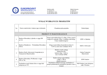 EUROPROJEKT Siedziba spółki: ul. Jaskrowa 15 43-382 Bielsko –Biała tel./fax 033 822 46 67 INFRASTRUKTURA Sp. z o.o. www.europrojekt.bielsko.pl [email protected] Oddział Katowice: ul. Kolista 25 40-486 Katowice tel. 881 960 511 WYKAZ WYBRANYCH PROJEKTÓW Lp. Nazwa zamówienia i miejsce jego wykonania Charakterystyka projektu Zamawiający PROJEKTY W TRAKCIE REALIZACJI 1. Budowa Obwodnicy Lęborka w ciągu DW nr 214 2. Budowa Południowo – Wschodniej Obwodnicy Gliwic 3. Budowa Strefy Aktywności Gospodarczej w Tomaszowie Mazowieckim 4. Budowa Obwodnicy Wolbromia w ciągu DW nr 786 5. Przebudowa stacji Jelenia Góra w ciągu linii kolejowej nr 274 Droga wojewódzka klasy G o dług. 10 km, węzeł z drogą S-6, estakada 330m, 2 wiadukty nad koleją, 4 inne wiadukt drogowe ZDW w Gdańsku Droga wojewódzka dwujezdniowa klasy G 3 265 m, most 22m i estakada 104 m MZD w Gliwicach Budowa węzła z drogą ekspresową S8, budowa dróg 1 266 m, sieci wod-kan 5200m Budowa drogi wojewódzkiej o dług. 3 700 m obiekty mostowe Przebudowa układu torowego, przebudowa 2 przejść podziemnych, przebudowa peronów wraz z wiatami Gmina Tomaszów Mazowiecki ZDW Kraków PKP Polskie Linie Kolejowe oddz. Wrocław EUROPROJEKT INFRASTRUKTURA Sp. z o.o. www.europrojekt.bielsko.pl [email protected] 6. Budowa Strefy Aktywności Gospodarczej w Brzezinach 7. Budowa pompowni przewałowej do rzeki Białej w Tarnowie 8. Budowa drogi zbiorczej przy drodze ekspresowej S-69 w Żywcu Siedziba spółki: ul. Jaskrowa 15 43-382 Bielsko –Biała tel./fax 033 822 46 67 Oddział Katowice: ul. Kolista 25 40-486 Katowice tel. 881 960 511 Budowa skrzyżowania z drogą wojewódzką nr 708 Budowa drogi dojazdowej o dług. 880 m, Sieci wod-kan 2825 m Zabezpieczenie przeciwpowodziowe dla miasta Tarnowa, budowa pompowni wód opadowych do rzeki Białej budowa drogi dojazdowej, przebudowa wałów przeciwpowodziowych Budowa drogi zbiorczej Budowa obiektu mostowego nad potokiem Kiemlichowiec Gmina Miasto Brzeziny Tarnowskie Wodociągi Sp. z o.o. GDDKiA Oddział w Katowicach PROJEKTY ZAKOŃCZONE 9. 10. Przebudowa DK nr 11 - ul. Strzelców Bytomskich w Bytomiu Budowa drogi gminnej w Zembrzycach w ramach budowy zbiornika „Świnna Poręba” DK nr 11 klasy G o dług. 1778,34 m, wodociąg 1780m, kanalizacja 2178m Przedsiębiorstwo Budownictwa Inżynieryjnego Energopol Sp. z o.o. Budowa drogi 814 m, most 122,25 m RZGW Kraków EUROPROJEKT INFRASTRUKTURA Sp. z o.o. www.europrojekt.bielsko.pl [email protected] 11. 12. Rozbudowa DW nr 942 – ul. Warszawska w Bielsku-Białej Rozbudowa DW nr 783 na odcinku OlkuszWolbrom. Siedziba spółki: ul. Jaskrowa 15 43-382 Bielsko –Biała tel./fax 033 822 46 67 Oddział Katowice: ul. Kolista 25 40-486 Katowice tel. 881 960 511 Droga wojewódzka klasy G o dług. 1727m, wiadukt drogowy i kolejowy o długości 178,51 m, przebudowa mostu, budowa kładki dla pieszych o długości 211,60m, przebudowa 6 skrzyżowań z budową sygnalizacji świetlnej MZD w Bielsku-Białej Droga wojewódzka klasy G o dług. 14 248,68 m, most o długości 12 m Eurovia Polska S.A. Droga wojewódzka klasy G o dług. 7600m, most o dł. 20,63 m, wiadukt drogowy, projekt specjalistycznego wzmocnienia gruntów Przedsiębiorstwo Budownictwa Inżynieryjnego Energopol Sp z o.o. 13. Budowa obwodnicy w miejscowości Szczurowa w ciągu drogi wojewódzkiej nr 768 14. Przebudowa DK nr 1 w Goczałkowicach – Zdroju Droga krajowa klasy G o dług. 500 m GDDKiA oddział Katowice 15. Budowa Strefy Aktywności Gospodarczej w Trzebini Przebudowa dróg o dług. 1000m, sieci wod-kan 2450m Eurovia Polska S.A. EUROPROJEKT INFRASTRUKTURA Sp. z o.o. www.europrojekt.bielsko.pl [email protected] 16. Przebudowa DW nr 965 na terenie gminy Drwinia 17. Budowa Specjalnej Strefy Ekonomicznej w Gminie Jasienica koło Bielska – Białej 18. Przebudowa mostów drogowych zlokalizowanych w ciągu drogi krajowej DK nr 94 w miejscowości Pawłowice i Karchowice 19. 20. 21. Budowa wschodniej obwodnicy Wojnicza w ciągu DW nr 975 Rozbudowa Strefy Aktywności Gospodarczej w Tarnowie – Etap I Rozbudowa ul. Cieszyńskiej w Bielsku – Białej, Siedziba spółki: ul. Jaskrowa 15 43-382 Bielsko –Biała tel./fax 033 822 46 67 Oddział Katowice: ul. Kolista 25 40-486 Katowice tel. 881 960 511 Droga wojewódzka klasy G o dług. 5014,46 m Eurovia Polska S.A. Drogi 1653,93 m, sieci wod-kan 12 760m Urząd Gminy Jasienica Droga krajowa klasy G, 2 mosty GDDKiA oddział Katowice Droga wojewódzka klasy G o dług. 675 m, most o długości 47 m, wiadukt o długości 18 m, budowa murów oporowych z gruntu zbrojonego Droga wojewódzka klasy G o dług. 260 m, drogi gminne klasy L 1100 m, pompownia przewałowa, kanalizacja 758 m, wodociąg 1314 m Droga powiatowa klasy G o dług. 3493,00 m, rozbudowa skrzyżowań, budowa sygnalizacji, most, przejście podziemne Mostostal Warszawa S.A. Przedsiębiorstwo Budownictwa Inżynieryjnego Energopol Sp. z o.o. MZD w Bielsku-Białej EUROPROJEKT INFRASTRUKTURA Sp. z o.o. www.europrojekt.bielsko.pl [email protected] 22. Odbudowa dróg w Borzęcinie i zabezpieczenie przeciwpowodziowe, przebudowa wałów przeciwpowodziowych Siedziba spółki: ul. Jaskrowa 15 43-382 Bielsko –Biała tel./fax 033 822 46 67 Oddział Katowice: ul. Kolista 25 40-486 Katowice tel. 881 960 511 Odbudowa dróg o dług. 7700 m, przesłona filtracyjna, przebudowa wałów przeciwpowodziowych Przedsiębiorstwo Budownictwa Inżynieryjnego Energopol Sp. z o.o.
