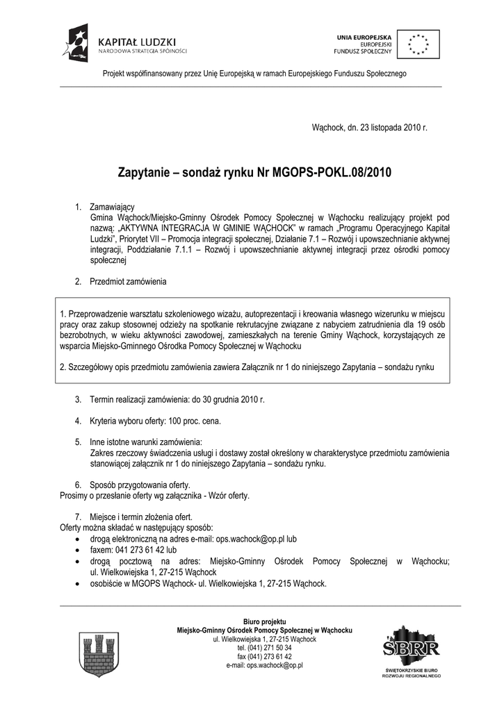 Projekt współfinansowany przez Unię Europejską w ramach Europejskiego Funduszu Społecznego ___________________________________________________________________________________________________ Wąchock, dn. 23 listopada 2010 r. Zapytanie – sondaż rynku Nr MGOPS-POKL.08/2010 1. Zamawiający Gmina Wąchock/Miejsko-Gminny Ośrodek Pomocy Społecznej w Wąchocku realizujący projekt pod nazwą: „AKTYWNA INTEGRACJA W GMINIE WĄCHOCK” w ramach „Programu Operacyjnego Kapitał Ludzki”, Priorytet VII – Promocja integracji społecznej, Działanie 7.1 – Rozwój i upowszechnianie aktywnej integracji, Poddziałanie 7.1.1 – Rozwój i upowszechnianie aktywnej integracji przez ośrodki pomocy społecznej 2. Przedmiot zamówienia 1. Przeprowadzenie warsztatu szkoleniowego wizażu, autoprezentacji i kreowania własnego wizerunku w miejscu pracy oraz zakup stosownej odzieży na spotkanie rekrutacyjne związane z nabyciem zatrudnienia dla 19 osób bezrobotnych, w wieku aktywności zawodowej, zamieszkałych na terenie Gminy Wąchock, korzystających ze wsparcia Miejsko-Gminnego Ośrodka Pomocy Społecznej w Wąchocku 2. Szczegółowy opis przedmiotu zamówienia zawiera Załącznik nr 1 do niniejszego Zapytania – sondażu rynku 3. Termin realizacji zamówienia: do 30 grudnia 2010 r. 4. Kryteria wyboru oferty: 100 proc. cena. 5. Inne istotne warunki zamówienia: Zakres rzeczowy świadczenia usługi i dostawy został określony w charakterystyce przedmiotu zamówienia stanowiącej załącznik nr 1 do niniejszego Zapytania – sondażu rynku. 6. Sposób przygotowania oferty. Prosimy o przesłanie oferty wg załącznika - Wzór oferty. 7. Miejsce i termin złożenia ofert. Oferty można składać w następujący sposób: drogą elektroniczną na adres e-mail: [email protected] lub faxem: 041 273 61 42 lub drogą pocztową na adres: Miejsko-Gminny Ośrodek Pomocy ul. Wielkowiejska 1, 27-215 Wąchock osobiście w MGOPS Wąchock- ul. Wielkowiejska 1, 27-215 Wąchock. Społecznej w Wąchocku; ________________________________________________________________________________________________________ Biuro projektu Miejsko-Gminny Ośrodek Pomocy Społecznej w Wąchocku ul. Wielkowiejska 1, 27-215 Wąchock tel. (041) 271 50 34 fax (041) 273 61 42 e-mail: [email protected] Projekt współfinansowany przez Unię Europejską w ramach Europejskiego Funduszu Społecznego ___________________________________________________________________________________________________ Oferty należy składać do: 03 grudnia 2010 r., godz. 15.00. Rozstrzygnięcie ofert nastąpi w terminie 2 dni roboczych. 8. Osoba do kontaktu w przedmiotowej sprawie. Imię i nazwisko: Teresa Jurkiewicz Tel. 041 271 50 34 E-mail: [email protected] lub Malwina Skrzyniarz-Pióro 665-762-585 [email protected] .................................................................... (data, podpis kierownika jednostki) ________________________________________________________________________________________________________ Biuro projektu Miejsko-Gminny Ośrodek Pomocy Społecznej w Wąchocku ul. Wielkowiejska 1, 27-215 Wąchock tel. (041) 271 50 34 fax (041) 273 61 42 e-mail: [email protected] Projekt współfinansowany przez Unię Europejską w ramach Europejskiego Funduszu Społecznego ___________________________________________________________________________________________________ Załącznik Nr 1 do Zapytania – sondażu rynku Nr MGOPS-POKL.08/2010 Charakterystyka przedmiotu zamówienia: WARSZTAT WIZAŻU, AUTOPREZENTACJI I KREOWANIA WŁASNEGO WIZERUNKU W MIEJSCU PRACY (8 GODZ. WARSZTATOWYCH) Program szkolenia: I. Odkrywanie świadomości własnego ciała, czyli jak wyglądam i jak jestem postrzegany. pozawerbalnych komunikatów podczas autoprezentacji (4 godziny) Znaczenie Wywieranie pierwszego wrażenia. Postawa ciała i dystans fizyczny z uwzględnieniem poszczególnych stref w kontaktach interpersonalnych. Gestykulacja, czyli co mówię, kiedy nie mówię. Mimika twarzy. II. Budowanie wizerunku przez wygląd zewnętrzny. Zasady ogólne (4 godziny) Analiza wyglądu. Maskowanie wad i wydobycie zalet poprzez staranny dobór kroju, faktury, wzoru garderoby. Rola koloru. Dobór właściwego stroju do konkretnej sytuacji: DRESS CODE Fryzura, makijaż, biżuteria i dodatki. INDYWIDUALNY DOBÓR I DOSTAWA GARDEROBY dla 19 osób W POSTACI: 1. Garnitur męski wykonany z materiału o zawartości minimum70%wełny + elana w numeracji charakterystycznej dla dorosłego mężczyzny w ilości 4 szt. 2. Garsonka damska w numeracji charakterystycznej dla dorosłej kobiety w ilości 15 szt. 3. Buty wizytowe męskie szt. 4 4. Buty wizytowe damskie szt.15 5. Koszula męska dobrana do garnituru szt. 4 6. Koszula damska dobrana do garsonki szt. 15 ________________________________________________________________________________________________________ Biuro projektu Miejsko-Gminny Ośrodek Pomocy Społecznej w Wąchocku ul. Wielkowiejska 1, 27-215 Wąchock tel. (041) 271 50 34 fax (041) 273 61 42 e-mail: [email protected] Projekt współfinansowany przez Unię Europejską w ramach Europejskiego Funduszu Społecznego ___________________________________________________________________________________________________ Wymogi o charakterze ogólnym do przedmiotu zamówienia: 1. Wymagany program warsztatu musi zawierać informacje, o których mówi Rozporządzenie Ministra Pracy i Polityki Społecznej z dn. 02 marca 2007 r. w sprawie szczegółowych warunków prowadzenia przez publiczne służby zatrudnienia usług rynku pracy (Dz. U. Nr 476, poz. 315), a mianowicie: Nazwę i zakres warsztatu; Czas trwania i sposób organizacji warsztatu; Wymagania wstępne dla uczestników warsztatu; Cele warsztatu; Plan nauczania określający tematy zajęć edukacyjnych oraz ich wymiar, z uwzględnieniem części teoretycznej i praktycznej; Treści warsztatu w zakresie poszczególnych zajęć edukacyjnych; Wykaz literatury oraz niezbędnych środków i materiałów dydaktycznych Sposób