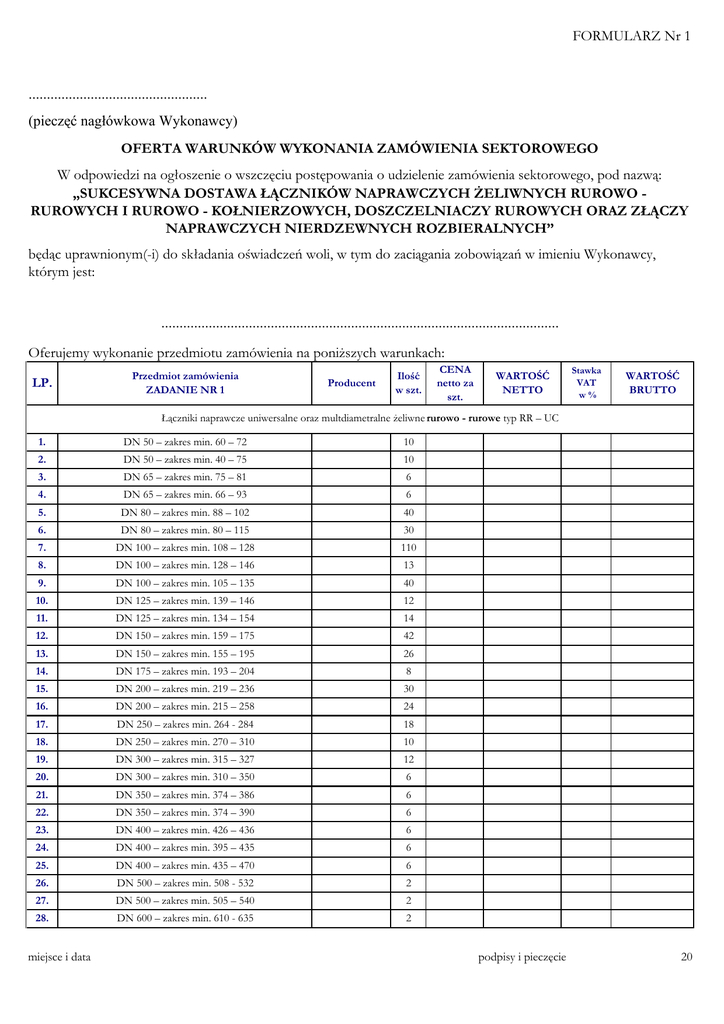 FORMULARZ Nr 1 ................................................. (pieczęć nagłówkowa Wykonawcy) OFERTA WARUNKÓW WYKONANIA ZAMÓWIENIA SEKTOROWEGO W odpowiedzi na ogłoszenie o wszczęciu postępowania o udzielenie zamówienia sektorowego, pod nazwą: „SUKCESYWNA DOSTAWA ŁĄCZNIKÓW NAPRAWCZYCH ŻELIWNYCH RUROWO RUROWYCH I RUROWO - KOŁNIERZOWYCH, DOSZCZELNIACZY RUROWYCH ORAZ ZŁĄCZY NAPRAWCZYCH NIERDZEWNYCH ROZBIERALNYCH” będąc uprawnionym(-i) do składania oświadczeń woli, w tym do zaciągania zobowiązań w imieniu Wykonawcy, którym jest: ............................................................................................................. Oferujemy wykonanie przedmiotu zamówienia na poniższych warunkach: LP. Przedmiot zamówienia ZADANIE NR 1 Producent Ilość w szt. CENA netto za szt. WARTOŚĆ NETTO Stawka VAT w% WARTOŚĆ BRUTTO Łączniki naprawcze uniwersalne oraz multdiametralne żeliwne rurowo - rurowe typ RR – UC 1. DN 50 – zakres min. 60 – 72 10 2. DN 50 – zakres min. 40 – 75 10 3. DN 65 – zakres min. 75 – 81 6 4. DN 65 – zakres min. 66 – 93 6 5. DN 80 – zakres min. 88 – 102 40 6. DN 80 – zakres min. 80 – 115 30 7. DN 100 – zakres min. 108 – 128 110 8. DN 100 – zakres min. 128 – 146 13 9. DN 100 – zakres min. 105 – 135 40 10. DN 125 – zakres min. 139 – 146 12 11. DN 125 – zakres min. 134 – 154 14 12. DN 150 – zakres min. 159 – 175 42 13. DN 150 – zakres min. 155 – 195 26 14. DN 175 – zakres min. 193 – 204 8 15. DN 200 – zakres min. 219 – 236 30 16. DN 200 – zakres min. 215 – 258 24 17. DN 250 – zakres min. 264 - 284 18 18. DN 250 – zakres min. 270 – 310 10 19. DN 300 – zakres min. 315 – 327 12 20. DN 300 – zakres min. 310 – 350 6 21. DN 350 – zakres min. 374 – 386 6 22. DN 350 – zakres min. 374 – 390 6 23. DN 400 – zakres min. 426 – 436 6 24. DN 400 – zakres min. 395 – 435 6 25. DN 400 – zakres min. 435 – 470 6 26. DN 500 – zakres min. 508 - 532 2 27. DN 500 – zakres min. 505 – 540 2 28. DN 600 – zakres min. 610 - 635 2 miejsce i data podpisy i pieczęcie 20 Łączniki naprawcze uniwersalne oraz multidiamertalne żeliwne rurowo-kołnierzowe typ RK – UD 29. 30. 31. 32. 33. 34. 35. 36. 37. 38. 39. 40. 41. 42. 43. 44. 45. 46. 47. 48. 49. 50. 51. 52. 53. 54. 55. 56. 57. DN 50 – zakres min. 60 – 72 DN 50 – zakres min. 40 – 75 DN 65 – zakres min. 68 – 85 DN 65 – zakres min. 75 – 82 DN 65 – zakres min. 66 – 93 DN 80 – zakres min. 88 – 102 DN 80 – zakres min. 80 – 115 DN 100 – zakres min. 108 – 128 DN 100 – zakres min. 105 – 135 DN 100 – zakres min. 128 - 146 DN 125 – zakres min. 139 – 146 DN 125 – zakres min. 134 - 154 DN 150 – zakres min. 159 – 175 DN 150 – zakres min. 155 – 195 DN 175 – zakres min. 193 – 204 DN 200 – zakres min. 219 – 236 DN 200 – zakres min. 215 – 258 DN 250 – zakres min. 264 - 284 DN 250 – zakres min. 270 – 310 DN 300 – zakres min. 315 – 327 DN 300 – zakres min. 310 – 350 DN 350 – zakres min. 374 – 386 DN 350 – zakres min. 374 – 390 DN 400 – zakres min. 426 – 435 DN 400 – zakres min. 400 – 435 DN 400 – zakres min. 435 – 470 DN 500 – zakres min. 508 – 532 DN 500 – zakres min. 505 – 540 DN 600 – zakres min. 610 – 635 12 12 6 6 6 60 40 70 36 16 12 16 36 26 6 12 12 18 5 12 5 5 5 4 6 6 2 2 2 Doszczelniacze rurowe 58. 59. 60. 61. 62. 63. 64. 65. 66. 67. 68. 69. Doszczelniacz do rury żeliwnej DN 80 o średnicy zewnętrznej rury 98,0 Doszczelniacz do rury żeliwnej DN 100 o średnicy zewnętrznej rury 118,0 Doszczelniacz do rury żeliwnej DN 125 o średnicy zewnętrznej rury 144,0 Doszczelniacz do rury żeliwnej DN 150 o średnicy zewnętrznej rury 170,0 Doszczelniacz do rury żeliwnej DN 175 o średnicy zewnętrznej rury 196 Doszczelniacz do rury żeliwnej DN 200 o średnicy zewnętrznej rury 222,0 Doszczelniacz do rury żeliwnej DN 250 o średnicy zewnętrznej rury 274,0 Doszczelniacz do rury żeliwnej DN 300 o średnicy zewnętrznej rury 326,0 Doszczelniacz do rury żeliwnej DN 350 o średnicy zewnętrznej rury 378,0 Doszczelniacz do rury żeliwnej DN 400 o średnicy zewnętrznej rury 429,0 Doszczelniacz do rury żeliwnej DN 500 o średnicy zewnętrznej rury 548,0 Doszczelniacz do rury żeliwnej DN 600 o średnicy zewnętrznej rury 634,0 4 12 5 8 4 4 4 4 3 3 2 2 x RAZEM NETTO / BRUTTO 1) Oferujemy wykonanie przedmiotu zamówienia na zadanie nr 1 za maksymalną cenę brutto za cenę brutto: ................................ PLN słownie:............................................................................................................................. w tym: netto ....................... PLN + ...............% stawki VAT (tj..............................zł) = ...........................................................................PLN brutto miejsce i data podpisy i pieczęcie 21 ................................................. FORMULARZ NR 1 (pieczęć nagłówkowa Wykonawcy) OFERTA WARUNKÓW WYKONANIA ZAMÓWIENIA SEKTOROWEGO W odpowiedzi na ogłoszenie o wszczęciu postępowania o udzielenie zamówienia sektorowego, pod nazwą: „SUKCESYWNA DOSTAWA ŁĄCZNIKÓW NAPRAWCZYCH ŻELIWNYCH RUROWO RUROWYCH I RUROWO - KOŁNIERZOWYCH, DOSZCZELNIACZY RUROWYCH ORAZ ZŁĄCZY NAPRAWCZYCH NIERDZEWNYCH ROZBIERALNYCH” będąc uprawnionym(-i) do składania oświadczeń woli, w tym do zaciągania zobowiązań w imieniu Wykonawcy, którym jest: ............................................................................................................. Oferujemy wykonanie przedmiotu zamówienia na poniższych warunkach: Przedmiot zamówienia ZADANIE NR 2 Producent Ilość w szt. CENA netto za szt. WARTOŚĆ NETTO Stawka VAT w% WARTOŚĆ BRUTTO Łączniki żeliwne rurowo - rurowe typ RR – UC na rurę PE z zabezpieczeniem przed wysunięciem 1. ø 110 12 2. ø 125 6 3. ø 160 6 4. ø 180 6 5. ø 225 4 6. ø 250 3 7. ø 280 2 8. 