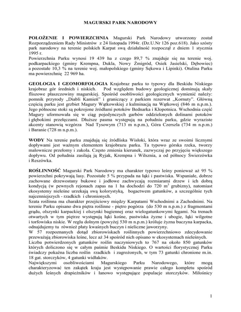 MAGURSKI PARK NARODOWY POŁOśENIE I POWIERZCHNIA Magurski Park Narodowy utworzony został Rozporządzeniem Rady Ministrów z 24 listopada 1994r. (Dz.U.Nr 126 poz.618). Jako szósty park narodowy na terenie polskich Karpat swą działalność rozpoczął z dniem 1 stycznia 1995 r. Powierzchnia Parku wynosi 19 439 ha z czego 89,7 % znajduje się na terenie woj. podkarpackiego (gminy Krempna, Dukla, Nowy śmigród, Osiek Jasielski, Dębowiec) a pozostałe 10,3 % na terenie woj. małopolskiego (gminy Sękowa i Lipinki). Otulina Parku ma powierzchnię 22 969 ha. GEOLOGIA I GEOMORFOLOGIA Krajobraz parku to typowy dla Beskidu Niskiego krajobraz gór średnich i niskich. Pod względem budowy geologicznej dominują skały fliszowe płaszczowiny magurskiej. Spośród osobliwości geologicznych wymienić naleŜy: pomnik przyrody „Diabli Kamień” i graniczący z parkiem rezerwat „Kornuty”. Główną częścią parku jest grzbiet Magury Wątkowskiej z kulminacją na Wątkowej (846 m n.p.m.). Jego północne stoki są pokrojone źródłami potoków Bednarka i Kłopotnica. Wschodnia część Magury uformowała się w ciąg pojedynczych garbów oddzielonych dolinami potoków i głębokimi przełęczami. DłuŜsze pasma występują na południu parku, gdzie wyraziste akcenty stanowią wzgórza Nad Tysowym (713 m n.p.m.), Góra Czerszla (734 m n.p.m.) i Baranie (728 m n.p.m.). WODY Na terenie parku znajdują się źródliska Wisłoki, która wraz ze swoimi licznymi dopływami jest waŜnym elementem krajobrazu parku. Ta typowo górska rzeka, tworzy malownicze przełomy i zakola. Często zmienia kierunek, zazwyczaj po przyjęciu większego dopływu. Od południa zasilają ją Ryjak, Krempna i Wilsznia, a od północy Świerzówka i Reszówka. ROŚLINNOŚĆ Magurski Park Narodowy ma charakter typowo leśny poniewaŜ aŜ 95 % powierzchni pokrywają lasy. Pozostałe 5 % przypada na łąki i pastwiska. Wspaniałe, dobrze zachowane drzewostany bukowe i jodłowe zachwycają rozmiarami drzew i ich dobrą kondycją (w pewnych rejonach zapas na 1 ha dochodzi do 720 m3 grubizny), natomiast ekosystemy nieleśne urzekają swą kolorystyką, bogactwem gatunków, a szczególnie tych najcenniejszych - rzadkich i chronionych. Szata roślinna ma charakter przejściowy między Karpatami Wschodnimi a Zachodnimi. Na terenie Parku opisano dwa piętra roślinne - piętro pogórza (do 530 m n.p.m.) z fragmentami grądu, olszynki karpackiej i olszynki bagiennej oraz wielogatunkowymi łęgami. Na trenach otwartych w tym piętrze występują łąki kośne, pastwiska Ŝyzne i ubogie, łąki wilgotne i torfowiska niskie. W reglu dolnym (powyŜej 530 m n.p.m.) króluje Ŝyzna buczyna karpacka, odnajdujemy tu równieŜ płaty kwaśnych buczyn i nieliczne jaworzyny. W 57 rozpoznanych dotąd zbiorowiskach roślinnych powierzchniowo zdecydowanie przewaŜają zbiorowiska leśne, lecz aŜ 34 spośród nich opisano w ekosystemach nieleśnych. Liczba potwierdzonych gatunków roślin naczyniowych to 767 na około 850 gatunków których doliczono się w całym paśmie Beskidu Niskiego. O wartości florystycznej Parku świadczy pokaźna liczba roślin rzadkich i zagroŜonych, w tym 73 gatunki chronione m.in. 18 gat. storczyków, 4 gatunki widłaków. Największymi osobliwościami Magurskiego Parku Narodowego, które mogą charakteryzować ten zakątek kraju jest występowanie prawie całego kompletu spośród duŜych leśnych drapieŜników i łanowo występujące populacje storczyków. Miłośnicy 1 krajobrazu mogą nacieszyć oko kilkuset hektarowymi otwartymi przestrzeniami zajętymi przez łąki i wrzosowiska gdzie brak jakichkolwiek zabudowań. FAUNA Na terenie Magurskiego Parku Narodowego swoją ostoję posiada szereg gatunków fauny dolnoreglowej i podgórskiej. Leśne ostępy magurskie wyróŜniają się w całym Beskidzie Niskim bogatymi populacjami duŜych kręgowców puszczańskich. śyje tu 57 gatunków ssaków, m.in. niedźwiedź, wilk, borsuk, ryś, Ŝbik. Najstarszą w polskich Karpatach ostoję posiada tutaj łoś. Introdukowane w latach osiemdziesiątych bobry, licznie rozprzestrzeniły się na terenie całego Parku. W „Polskiej czerwonej księdze zwierząt” znajduje się 10 gatunków ssaków odnotowanych na terenie Magurskiego Parku Narodowego. Badania awifauny potwierdziły występowanie 157 gatunków ptaków, z czego 117 to gatunki lęgowe. 7 gatunków ma swoje miejsce w „Polskiej czerwonej księdze zwierząt”. Są to: orzeł przedni, włochatka, sóweczka, puszczyk uralski (ok. 60 par/100 km2 – jedno z największych zagęszczeń w kraju i prawdopodobnie w Europie), dzięcioł białogrzbiety i trójpalczasty oraz orlik krzykliwy uznany za symbol Parku. Na terenie MPN gnieździ się trzydzieści kilka par orlika krzykliwego, co daje około 23 pary na 100 km2 i jest to jedno z największych zagęszczeń w Polsce. Na wzmiankę zasługuje fakt, iŜ w Parku liczebność myszołowa jest jedną z najwyŜszych na naszym kontynencie (ok. 60 par/100 km2) oraz 9 gatunków ptaków z rzędu dzięciołowych (najliczniejsze to dzięcioł duŜy i czarny). Ichtiofauna reprezentowana jest przez 12 gat. ryb. Wśród podanych gatunków 3 są prawnie chronione (głowacz pręgopłetwy, śliz, piekielnica), a głowacz pręgopłetwy i piekielnica umieszczone są dodatkowo w „Polskiej czerwonej księdze zwierząt”. Park i jego otulina są równieŜ miejscem bytowania płazów (10 gatunków) i gadów (6 gatunków). W „Polskiej czerwonej księdze zwierząt” swe miejsce znalazły z płazów – traszka karpacka i grzebieniasta, a z gadów gniewosz plamisty Wstępne badania niektórych grup bezkręgowców potwierdziły obecność ciekawych gatunków np. z motyli pazia królowej, mieniaka tęczowca, niepylaka mnemozyny, z kózkowatych – nadobnicy alpejskiej i kozioroga bukowca, z modliszkowatych modliszki zwyczajnej. ZABYTKI KULTURY MATERIALNEJ Najstarszym śladem Ŝycia ludzi w tej części Beskidu Niskiego są pozostałości 