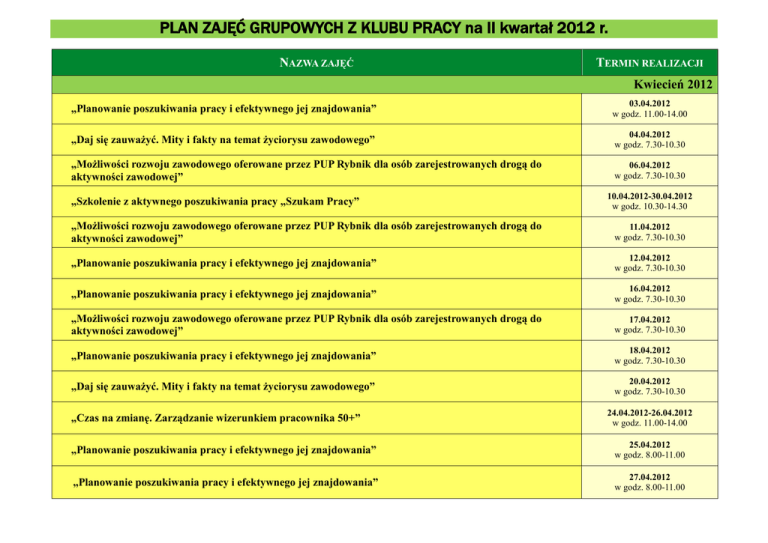 PLAN ZAJĘĆ KLUBU PRACY NA II KWARTAŁ 2012 r.