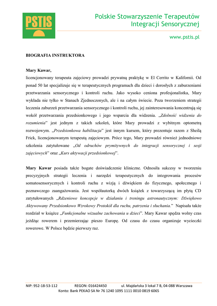 Polskie Stowarzyszenie Terapeutów Integracji Sensorycznej www.pstis.pl BIOGRAFIA INSTRUKTORA Mary Kawar, licencjonowany terapeuta zajęciowy prowadzi prywatną praktykę w El Cerrito w Kalifornii. Od ponad 50 lat specjalizuje się w terapeutycznych programach dla dzieci i dorosłych z zaburzeniami przetwarzania sensorycznego i kontroli ruchu. Jako wysoko ceniona profesjonalistka, Mary wykłada nie tylko w Stanach Zjednoczonych, ale i na całym świecie. Poza tworzeniem strategii leczenia zaburzeń przetwarzania sensorycznego i kontroli ruchu, jej zainteresowania koncentrują się wokół przetwarzania przedsionkowego i jego wsparcia dla widzenia. „Zdolność widzenia do rozumienia” jest jednym z takich szkoleń, które Mary prowadzi z wybitnym optometrą rozwojowym. „Przedsionkowa habilitacja” jest innym kursem, który prezentuje razem z Sheilą Frick, licencjonowanym terapeutą zajęciowym. Prócz tego, Mary prowadzi również jednodniowe szkolenia zatytułowane „Od odruchów prymitywnych do integracji sensorycznej i sesji zajęciowych” oraz „Kurs aktywacji przedsionkowej”. Mary Kawar posiada także bogate doświadczenie kliniczne. Odnosiła sukcesy w tworzeniu precyzyjnych strategii leczenia i narzędzi terapeutycznych do integrowania procesów somatosensorycznych i kontroli ruchu z wizją i dźwiękiem do fizycznego, społecznego i poznawczego zaangażowania. Jest współautorką dwóch książek z towarzyszącą im płytą CD zatytułowanych „Rdzeniowe koncepcje w działaniu i treningu astronautycznym: Dźwiękowo Aktywowany Przedsionkowo Wzrokowy Protokół dla ruchu, patrzenia i słuchania.” Napisała także rozdział w książce „Funkcjonalne wizualne zachowania u dzieci”. Mary Kawar spędza wolny czas jeżdżąc rowerem i przemierzając pieszo Europę. Od czasu do czasu organizuje wycieczki rowerowe. W Polsce będzie pierwszy raz. NIP: 952-18-53-112 REGON: 016424450 ul. Majdańska 3 lokal 7 B, 04-088 Warszawa Konto: Bank PEKAO SA Nr 76 1240 1095 1111 0010 0819 6065