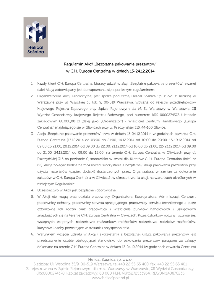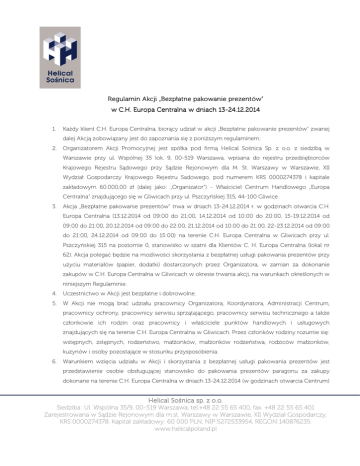 Regulamin Akcji „Bezpłatne pakowanie prezentów” w C.H. Europa Centralna w dniach 1313 -24.12.2014 1. Każdy klient C.H. Europa Centralna, biorący udział w akcji „Bezpłatne pakowanie prezentów” zwanej dalej Akcją zobowiązany jest do zapoznania się z poniższym regulaminem: 2. Organizatorem Akcji Promocyjnej jest spółka pod firmą Helical Sośnica Sp. z o.o. z siedzibą w Warszawie przy ul. Wspólnej 35 lok. 9, 00-519 Warszawa, wpisana do rejestru przedsiębiorców Krajowego Rejestru Sądowego przy Sądzie Rejonowym dla M. St. Warszawy w Warszawie, XII Wydział Gospodarczy Krajowego Rejestru Sadowego, pod numerem KRS 0000274378 i kapitale zakładowym 60.000,00 zł (dalej jako: „Organizator”) - Właściciel Centrum Handlowego „Europa Centralna” znajdującego się w Gliwicach przy ul. Pszczyńskiej 315, 44-100 Gliwice. 3. Akcja „Bezpłatne pakowanie prezentów” trwa w dniach 13-24.12.2014 r. w godzinach otwarcia C.H. Europa Centralna (13.12.2014 od 09:00 do 21:00, 14.12.2014 od 10:00 do 20:00, 15-19.12.2014 od 09:00 do 21:00, 20.12.2014 od 09:00 do 22:00, 21.12.2014 od 10:00 do 21:00, 22-23.12.2014 od 09:00 do 21:00, 24.12.2014 od 09:00 do 15:00) na terenie C.H. Europa Centralna w Gliwicach przy ul. Pszczyńskiej 315 na poziomie 0, stanowisko w szatni dla Klientów C. H. Europa Centralna (lokal nr 62). Akcja polegać będzie na możliwości skorzystania z bezpłatnej usługi pakowania prezentów przy użyciu materiałów (papier, dodatki) dostarczonych przez Organizatora, w zamian za dokonanie zakupów w C.H. Europa Centralna w Gliwicach w okresie trwania akcji, na warunkach określonych w niniejszym Regulaminie. 4. Uczestnictwo w Akcji jest bezpłatne i dobrowolne. 5. W Akcji nie mogą brać udziału pracownicy Organizatora, Koordynatora, Administracji Centrum, pracownicy ochrony, pracownicy serwisu sprzątającego, pracownicy serwisu technicznego a także członkowie ich rodzin oraz pracownicy i właściciele punktów handlowych i usługowych znajdujących się na terenie C.H. Europa Centralna w Gliwicach. Przez członków rodziny rozumie się: wstępnych, zstępnych, rodzeństwo, małżonków, małżonków rodzeństwa, rodziców małżonków, kuzynów i osoby pozostające w stosunku przysposobienia. 6. Warunkiem wzięcia udziału w Akcji i skorzystania z bezpłatnej usługi pakowania prezentów jest przedstawienie osobie obsługującej stanowisko do pakowania prezentów paragonu za zakupy dokonane na terenie C.H. Europa Centralna w dniach 13-24.12.2014 (w godzinach otwarcia Centrum) Helical Sośnica sp. z o.o. Siedziba: Ul. Wspólna 35/9, 00-519 Warszawa, tel.+48 22 55 65 400, fax. +48 22 55 65 401 Zarejestrowana w Sądzie Rejonowym dla m.st. Warszawy w Warszawie, XII Wydział Gospodarczy, KRS:0000274378. Kapitał zakładowy: 60 000 PLN, NIP:5272533954, REGON:140876235. www.helicalpoland.pl o wartości minimum 100 zł i podpisanie protokołu realizacji usługi w ramach akcji „Bezpłatne pakowanie prezentów”. Wartości Paragonów nie łączy się – decyduje wartość jednostkowa jednego paragonu. 7. Przez dokonanie zakupu rozumie się zakup towarów lub usług dokonanych w formie płatności gotówką lub kartą płatniczą wydaną przez bank. W akcji mogą brać udział tylko paragony dokumentujące zakup dokonany gotówką lub kartą płatniczą wydaną przez bank. Z zastrzeżeniem ust. 8 poniżej, w akcji nie mogą brać udziału paragony dokumentujące zakup dokonany kartą podarunkową lub bonem podarunkowym, ani faktury VAT, a także paragony, na których widnieją: napoje alkoholowe, produkty tytoniowe lub produkty lecznicze. Z akcji wyłączone są również transakcje dokonane w punkcie lotto, zakładach bukmacherskich, kantorach oraz wpłaty i wypłaty bankomatowe. 8. W przypadku dowodów zakupów, na których widnieją zakupy produktów wyłączonych z akcji, o których mowa w ust. 6, podstawą do wydania nagrody będzie kwota dowodu zakupu, pomniejszona o wartość zakupu produktów wyłączonych. 9. Uczestnictwo w akcji może nastąpić jedynie na podstawie przedstawionych oryginałów paragonów, z prawem do ich jednokrotnego wykorzystania. Oryginalne paragony zostaną opieczętowane i podpisane przez pracownika Organizatora, a następnie oddane ich posiadaczom wraz z zapakowanym prezentem. prezentem Okazanie oryginałów paragonów biorących udział w Akcji jest niezbędne do otrzymania przyznanej nagrody. 10. Paragony obejmować mogą jedynie zakupy dokonane w dniach 13-24.12.2013r. w godzinach otwarcia C.H. Europa Centralna w sklepach lub punktach usługowych znajdujących się na terenie C.H. Europa Centralna w Gliwicach. 11. Jeśli Klient posiada kilka oddzielnych dokumentów sprzedaży o wartości powyżej 100 zł brutto każdy, niezależnie od kwot na nich widniejących, jednorazowo może zapakować maksymalnie 3 prezenty, które zostaną przez niego wskazane. 12. Jednorazowo Klient (na jednym dokumencie sprzedaży) może zapakować maksymalnie trzy prezenty i tak dokumenty za: min. 100 – 200 zł brutto – pakowanie jednego prezentu; dokumenty za 201- 300 zł brutto – bezpłatne pakowanie dwóch prezentów; dokumenty powyżej 301 zł brutto – bezpłatne pakowanie trzech prezentów. Helical Sośnica sp. z o.o. Siedziba: Ul. Wspólna 35/9, 00-519 Warszawa, tel.+48 22 55 65 400, fax. +48 22 55 65 401 Zarejestrowana w Sądzie Rejonowym dla m.st. Warszawy w Warszawie, XII Wydział Gospodarczy, KRS:0000274378. Kapitał zakładowy: 60 000 PLN, NIP:5272533954, REGON:140876235. www.helicalpoland.pl 13. Prezenty wielkogabarytowe, za które uważa się prezenty, których jeden z wymiarów przekracza wymiar: szerokość 1m i/lub wysokość 1m i/lub średnica 1m nie będą pakowane w całości - zostaną one zaakcentowane elementami ozdób świątecznych. 14. W przypadku prezentów złożonych z kilkunastu oddzielnych elementów (np. wieloelementowe zastawy stołowe), prezent zostanie starannie zapakowany w jedno opakowanie zbiorcze. 15