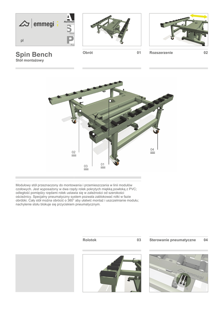 pl Obrót Spin Bench 01 Rozszerzenie 02 Stół montażowy 04 02 03 01 Modułowy stół przeznaczony do montowania i przemieszczania w linii modułów czołowych. Jest wyposażony w dwa rzędy rolek pokrytych miękką powłoką z PVC; odległość pomiędzy rzędami rolek ustawia się w zależności od szerokości ościeżnicy. Specjalny pneumatyczny system pozwala zablokować rolki w fazie obróbki. Cały stół można obrócić o 360° aby ułatwić montaż i uszczelnianie modułu; nachylenie stołu blokuje się przyciskiem pneumatycznym. Rolotok 03 Sterowanie pneumatyczne 04 Spin Bench Stół montażowy 01 02 03 04 Obrót Rozszerzenie Rolotok Sterowanie pneumatyczne Cały stół może obracać się o 360° wokół centralnej konstrukcji, ułatwiając przez to montaż i uszczelnianie modułu. Nachylenie stołu blokuje się przyciskiem pneumatycznym, za pomocą ręcznego zaworu. SPIN BENCH może być rozszerzony z 1000 mm do 2500 mm. Po ustaleniu pozycji bieżni, dźwignie blokujące umożliwiają zablokowanie rolotoku w miejscu, zapewniając przez to dużą elastyczność. Moduły czołowe są wsparte na rolotokach z rolkami o szerokości 160 mm, pokrytych miękkim PVC, co ogranicza do minimum nakład pracy operatora. Pneumatyczny system z ręcznym zaworem umożliwia operatorowi zatrzymanie obrotu wybranych rolek w obydwóch rolotokach; w ten sposób można wykonać prace montażowe przy module. STÓŁ ROBOCZY Długość stołu rolkowego (mm) 2500 Minimalna szerokość stołu rolkowego (mm) 1000 Maksymalna szerokość stołu rolkowego z centralnym ruchomym podparciem (mm) 2500 DANE TECHNICZNE • System pneumatycznego blokowania rolek Wysokość (mm) Zużycie powietrza (Nl/min) 940 ÷ 1000 5 Waga (kg) 460 Nośność (kg) 450 2009/10/06 www.emmegi.com