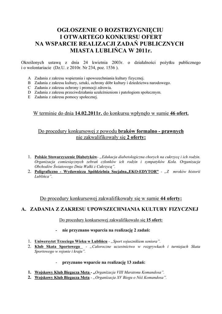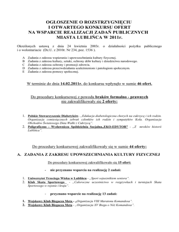 OGŁOSZENIE O ROZSTRZYGNIĘCIU I OTWARTEGO KONKURSU OFERT NA WSPARCIE REALIZACJI ZADAŃ PUBLICZNYCH MIASTA LUBLIŃCA W 2011r. Określonych ustawą z dnia 24 kwietnia 2003r. o działalności pożytku publicznego i o wolontariacie (Dz.U. z 2010r. Nr 234, poz. 1536 ). A B C D E Zadania z zakresu wspierania i upowszechniania kultury fizycznej. Zadania z zakresu kultury, sztuki, ochrony dóbr kultury i dziedzictwa narodowego. Zadania z zakresu ochrony i promocji zdrowia. Zadania z zakresu przeciwdziałania uzależnieniom i patologiom społecznym. Zadania z zakresu pomocy społecznej. W terminie do dnia 14.02.2011r. do konkursu wpłynęło w sumie 46 ofert. Do procedury konkursowej z powodu braków formalno - prawnych nie zakwalifikowały się 2 oferty: 1. Polskie Stowarzyszenie Diabetyków- „Edukacja diabetologiczna chorych na cukrzycę i ich rodzin. Organizacja comiesięcznych zebrań członków ich rodzin i sympatyków Koła. Organizacja Obchodów Światowego Dnia Walki z Cukrzycą”. 2. Poligraficzno - Wydawnicza Spółdzielnia Socjalna„EKO-EDYTOR” - „Z mroków historii Lublińca”. Do procedury konkursowej zakwalifikowały się w sumie 44 oferty: A. ZADANIA Z ZAKRESU UPOWSZECHNIANIA KULTURY FIZYCZNEJ Do procedury konkursowej zakwalifikowało się 15 ofert: - nie przyznano wsparcia na realizację 2 zadań: 1. Uniwersytet Trzeciego Wieku w Lublińcu - „Sport sojusznikiem seniora”. 2. Klub Skata Sportowego - „Całoroczne uczestnictwo w rozgrywkach i turniejach Skata Sportowego w rejonie i kraju”. - przyznano wsparcie na realizację 13 zadań: 1. Wojskowy Klub Biegacza Meta - „Organizacja VIII Maratonu Komandosa”. 2. Wojskowy Klub Biegacza Meta - „Organizacja XV Biegu o Nóż Komandosa”. 3. Wojskowy Klub Biegacza Meta - „Organizacja VII Biegu Katorżnika”. 4. Społeczne Towarzystwo Siatkarskie Victoria - „Organizacja szkolenia dzieci młodzieży uzdolnionej sportowo w zakresie piłki siatkowej”. 5. Lublinieckie Towarzystwo Tenisowe - „Przygotowanie do sezonu i utrzymanie kortów tenisowych oraz organizacja na nich imprez i zawodów sportowych”. 6. Lubliniecki Klub Sportowy Sparta - „Cykl szkoleń drużyn piłki nożnej mężczyzn, juniorów, trampkarzy i dzieci ze Szkółki Piłkarskiej oraz sekcji szachowej i brydża mających na celu doskonalenie sprawności fizycznej i uzdolnień fizycznych uczestników, stanowiących przygotowanie do udziału w rozgrywkach sportowych promujących miasto Lubliniec w regionie i kraju oraz utrzymanie infrastruktury sportowej niezbędnej do realizacji zadania”. 7. Społeczne Towarzystwo Badmintona Energia - „Cykl otwartych zajęć badmintona dla dzieci, młodzieży i dorosłych”. 8. Lubliniecki Klub Oyama Karate - „Cykl szkoleń sportowo- rekreacyjnych dzieci, młodzieży i dorosłych, w tym organizacja obozu szkoleniowego, mających na celu doskonalenie umiejętności ruchowych i sprawności fizycznej oraz przygotowanie zawodników Lublinieckiego Klubu Oyama Karate, reprezentantów miasta Lublińca, do udziału w zawodach sportowych w kraju i zagranicą”. 9. Lubliniecki Klub Oyama Karate - „Organizacja dwóch turniejów sportowych na terenie Miasta Lublińca oraz udział zawodników Lublinieckiego Klubu Oyama Karate, reprezentantów Lublińca, w cyklu imprez ogólnopolskich”. 10. Stowarzyszenie Akademia Sportowa Lubliniec - „Szkolenie koszykarzy drużyny HEF BASKET oraz popularyzowanie koszykówki wśród dzieci i młodzieży przez Stowarzyszenie Akademia Sportowa Lubliniec na terenie miasta Lublińca”. 11. Stowarzyszenie Akademia Sportowa Lubliniec - „Szkolenie piłkarzy klubu Akademia Sportowa Lubliniec oraz popularyzowanie piłki nożnej wśród dzieci i młodzieży przez Stowarzyszenie Akademia Sportowa Lubliniec na terenie miasta Lublińca”. 12. Związek Harcerstwa Polskiego Chorągiew Śląska Hufiec Lubliniec - „Leśne neptunalia”. 13. Wojewódzkie Wodne Ochotnicze Pogotowie Ratunkowe w Katowicach - „Prowadzenie działań w zakresie doskonalenia umiejętności pływackich mieszkańców Miasta Lublińca”. B. ZADANIA Z ZAKRESU KULTURY, SZTUKI, OCHRONY DÓBR KULTURY I DZIEDZICTWA NARODOWEGO Do procedury konkursowej zakwalifikowało się 9 ofert: - nie przyznano wsparcia na realizację 4 zadań: 1. Stowarzyszenie Rozwoju Ziemi Lublinieckiej - „Wydanie katalogu z międzynarodowego pleneru rzeźbiarskiego w 2010 r.”. 2. Stowarzyszenie Rozwoju Ziemi Lublinieckiej - „Wydanie tomiku poezji pn. Jak smak razowego chleba lublinieckiej poetki Stefanii Szczepanik”. 3. Uniwersytet III wieku - „Seniorzy blisko kultury”. 4. Fundacja b. Żołnierzy Funkcjonariuszy Sił Specjalnych”Szturman” - „Działania mające na celu upowszechnienie i zachowanie dziedzictwa kulturowego Lublińca oraz jego lepsze wykorzystanie do celów turystycznych”. - przyznano wsparcie na realizację 5 zadań: 1. Stowarzyszenie „Amicus” - „Rękodzielnik- warsztaty artystyczne- edycja II”. 2. Stowarzyszenie Rozwoju Ziemi Lublinieckiej - „Organizacja wystaw plastycznych artystów polskich i zagranicznych”. 3. Polski Związek Emerytów, Rencistów i Inwalidów - „Seniorzy z kulturą za pan brat”. 4. Polski Związek Niewidomych - „Dotyk historii”Wyjazd integracyjno-szkoleniowo-poznawczy””. 5. Katolickie Stowarzyszenie Wychowawców - oddział Lubliniec - „Lubliniec - miasto dziecięcych wspomnień Edyty Stein”. C. ZADANIA Z ZAKRESU PRZECIWDZIAŁANIA UZALEŻNIENIOM I PATOLOGIOM SPOŁECZNYM Do procedury konkursowej zakwalifikowało się 12 ofert: - nie przyznano wsparcia na realizację 4 zadań: 1. Związek Harcerstwa Polskiego Chorągiew Śląska Hufiec Lubliniec - „Na traperskiej ścieżce”. 2. Związek Harcerstwa Polskiego Chorągiew Śląska Hufiec Lubliniec - „Leśny obóz”. 3. Związek Harcerstwa Polskiego Chorągiew Śląska Hufiec Lubliniec - „Zuchowe harce czterech pór roku”. 4. STS „Victoria” - „Organizacja wypoczynku wakacyjnego. Półkolonie dla dzieci i m
