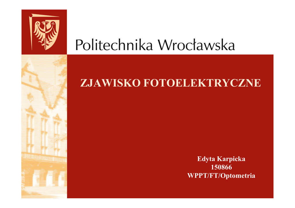 ZJAWISKO FOTOELEKTRYCZNE Edyta Karpicka 150866 WPPT/FT/Optometria Plan prezentacji 1. 2. 3. 4. 5. 6. 7. Historia odkrycia zjawiska fotoelektrycznego Badanie zjawiska fotoelektrycznego Maksymalna energia kinetyczna elektronów Charakterystyka prądowo-napięciowa fotokomórki. Częstotliwość graniczna. Wyznaczanie stałej Plancka Podsumowanie doświadczenia Historia odkrycia zjawiska fotoelektrycznego H. Hertz (1887)- w trakcie badań nad wyładowaniami iskrowymi między dwiema powierzchniami metalowymi zauwaŜył, Ŝe pierwotna iskra z jednej powierzchni wytwarza wtórną iskrę na drugiej. W. Hallwachs (1888)-pokazał , Ŝe oczyszczona, izolowana, płytka cynkowa wystawiona na promieniowanie ultrafioletowe ładuje się dodatnio, a płytka naładowana ujemnie traci ładunek, nawet jeśli jest umieszczona w próŜni. [Ŝródło: Dr M. Klisowaka, Instytut Fizyki Uniwersytetu Rzeszowskiego] J.J.Thomas stwierdził, Ŝe fotoefekt polega na emisji elektronów : zmierzył stosunek (ładunek/masa) dla emitowanych cząsteczek (1897), a w 1899 wyznaczył ich ładunek. Historia odkrycia zjawiska fotoelektrycznego J.Elster i H.F.Geitel (na fot.)stwierdzili w 1900 r., Ŝe prąd fotoelektryczny jest proporcjonalny do natęŜenia światła i powstaje natychmiast po oświetleniu metalu. P.Lenard (1902)- stwierdził , iŜ energia wybitych elektronów w ogóle nie zaleŜy od natęŜenia światła ,rośnie natomiast wraz z jego częstotliwością. A.Einstein (1905)- zaproponował wytłomaczenie fotoefektu: „jeden kwant światła, zupełnie niezaleŜnie od pozostałych, przekazuje swoją energie elektronowi. Elektron wyrzucony z metalu traci pewną jej część, zanim dotrze do powierzchni. E=hv Nobel prize 1922 Badanie efektu fotoelektrycznego -Obwód elektryczny pozwala na przyłoŜenie między elektrody napięcia U regulowanego za pomocą potencjometru P, oraz na mierzenie galwanometrem natęŜenia prądu I przepływającego między nimi. -Po przyłoŜeniu do anody potencjału dodatniego względem fotokatody i przy braku oświetlenia fotokatody nie obserwuje się przepływu prądu. -Pojawia się natychmiast gdy oświetlimy fotokatodę światłem o dostatecznie duŜej częstotliwości. Schemat układu pomiarowego do badania efektu fotoelektrycznego. [źródło: http://www.fuw.edu.pl/~krolikow/FIVBC/i3_efekt_fotoelektryczny.pdf] Maksymalna energia kinetyczna elektronów V h- potencjał hamujący dla napięć mniejszych od pewnego –V h prąd przez ogniwo przestaje płynąć: -V < - V h Emax-maksymalna energia kinetyczna jest równa pracy pola elektrycznego (między anodą i katodą) potrzebnej do całkowitego zahamowania elektronu w fotokomórce: Emax=e Vh gdzie e - ładunek elektronu Vh a więc Emax nie zaleŜy od natęŜenia światła [źródło: http://www.fuw.edu.pl/~krolikow/FIVBC/i3_efekt_fotoelektryczny.pdf Charakterystyka prądowo-napięciowa JeŜeli Ф1 < Ф2 to : -szybszy wzrost natęŜenia prądu w miarę wzrostu napięcia między anodą i katodą -brak zmiany potencjału hamującego Charakterystykia prądowo-napięciowa dla dwóch róŜnych natęŜeń światła Ф1 i Ф2 (Vh - potencjał hamujący) [Ŝródło:Jerzy Filipowicz, Badanie efektu fotoelektrycznego zewnętrznego] Częstotliwość graniczna -poniŜej częstości granicznej nie obserwujemy EF -wartość częstości granicznej zaleŜy od materiału katody -zgodnie ze wzorem Einsteina, częstość graniczna mierzy pracę wyjścia W: W = hvg ZaleŜność natęŜenia prądu od częstotliwości v dla dwóch róŜnych materiałów fotokatody A i B Vo – charakterystyczna częstotliwość graniczna dla danego materiału [źródło: http://www.fuw.edu.pl/~krolikow/FIVBC/i3_efekt_fotoelektryczny.pdf] Wyznaczanie stałej Plancka hv=W+Emax (1) Emax=e V h (2) Vh= (h/e)v-W/e Tak więc teoria Einstaina przewiduje liniowy związek między potencjałem hamowania Vh, a częstotliwością padającego światła v. prosta: y=ax+b gdzie y=Vh , x=v , a= h/e , b=W/e tan α = (W/e) / ν= (h ν/e) / ν = h/e ZaleŜność potencjału hamowania Vh od częstotliwości v padającego światła Vg - częstotliwość graniczna W-praca wyjścia e-ładunek elektronu [źródło: http://www.fuw.edu.pl/~krolikow/FIVBC/i3_efekt_fotoelektryczny.pdf] h= 6,626755*10-34J s Podsumowanie doświadczenia 1. Potencjał hamujący, a co za tym idzie maksymalna energia kinetyczna fotoelektronów E max nie zaleŜy od natęŜenia światła 2. Dla kaŜdej fotokatody istnieje charakterystyczna częstotliwość graniczna v (zaleŜna od materiału fotokatody) . Dla częstotliwości mniejszych od vg efekt fotoelektryczny nie występuje ,niezaleŜnie od tego jak silne jest natęŜenie światła 3. Nie występuje opóźnienie w czasie pomiędzy padaniem światła na fotokatodę a pojawienie się fotoprądu nawet dla małych natęŜeń światła. Bibliografia -R. Eisberg, R. Resnick, Fizyka kwantowa, PWN, Warszawa 1983 -D. Halliday, R. Resnick, J.Walker, Podstawy fizyki, PWN, Warszawa 2003 -J.Orear, Fizyka tom 2, Wydawnictwo Naukowo-Techniczne, Warszawa 1993 -Jerzy Filipowicz, Badanie efektu fotoelektrycznego zewnętrznego, Politechnika Warszawska - Janusz Skalski, Kwanty światła, efekt fotoelektryczny i realność fotonów, Instytut Problemów Jądrowych im. A. Sołtana. - dr M. Niemiec, Rok 1905 narodziny współczesnej fizyki, Instytut Fizyki Uniwersytet Opolski - dr M. Klisowska, Fotony Alberta Einstaina czyli o efekcie fotoelektrycznym, Instytut Fizyki Uniwesytet Rzeszowski, -http://www.fuw.edu.pl/~krolikow/FIVBC/i3_efekt_fotoelektryczny.pdf
