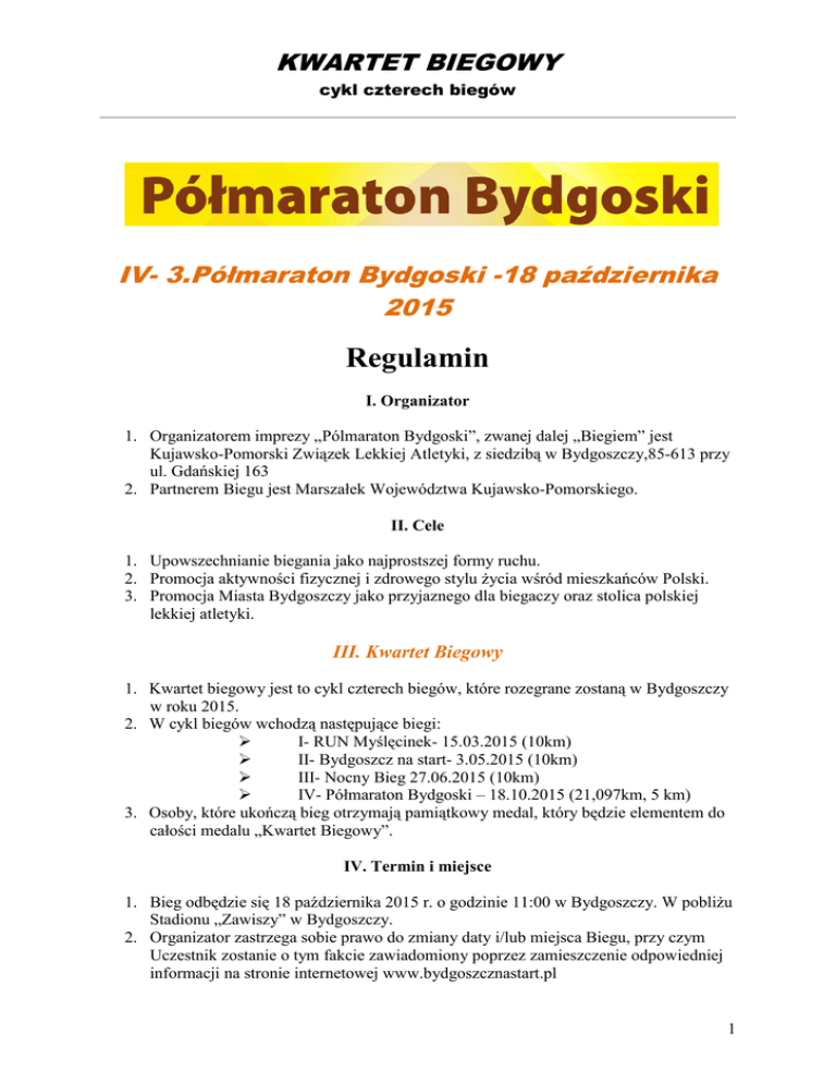 KWARTET BIEGOWY cykl czterech biegów IV- 3.Półmaraton Bydgoski -18 października 2015 Regulamin I. Organizator 1. Organizatorem imprezy „Pólmaraton Bydgoski”, zwanej dalej „Biegiem” jest Kujawsko-Pomorski Związek Lekkiej Atletyki, z siedzibą w Bydgoszczy,85-613 przy ul. Gdańskiej 163 2. Partnerem Biegu jest Marszałek Województwa Kujawsko-Pomorskiego. II. Cele 1. Upowszechnianie biegania jako najprostszej formy ruchu. 2. Promocja aktywności fizycznej i zdrowego stylu życia wśród mieszkańców Polski. 3. Promocja Miasta Bydgoszczy jako przyjaznego dla biegaczy oraz stolica polskiej lekkiej atletyki. III. Kwartet Biegowy 1. Kwartet biegowy jest to cykl czterech biegów, które rozegrane zostaną w Bydgoszczy w roku 2015. 2. W cykl biegów wchodzą następujące biegi: I- RUN Myślęcinek- 15.03.2015 (10km) II- Bydgoszcz na start- 3.05.2015 (10km) III- Nocny Bieg 27.06.2015 (10km) IV- Półmaraton Bydgoski – 18.10.2015 (21,097km, 5 km) 3. Osoby, które ukończą bieg otrzymają pamiątkowy medal, który będzie elementem do całości medalu „Kwartet Biegowy”. IV. Termin i miejsce 1. Bieg odbędzie się 18 października 2015 r. o godzinie 11:00 w Bydgoszczy. W pobliżu Stadionu „Zawiszy” w Bydgoszczy. 2. Organizator zastrzega sobie prawo do zmiany daty i/lub miejsca Biegu, przy czym Uczestnik zostanie o tym fakcie zawiadomiony poprzez zamieszczenie odpowiedniej informacji na stronie internetowej www.bydgoszcznastart.pl 1 KWARTET BIEGOWY cykl czterech biegów 3. Miejsce, godzina startu oraz szczegółowa trasa Biegu będzie dostępna na stronie internetowej Organizatora. Długość trasy: 21,097 km. Trasa będzie miała oznaczony każdy kilometr. Limit czasu na pokonanie trasy wynosi 3 godziny. Organizator zastrzega sobie prawo do zmiany godziny Biegu o czym zobowiązuje powiadomić Uczestników za pośrednictwem strony internetowej Biegu. 4. Numery startowe przydzielane są zgodnie z kolejnością zgłoszeń 5. Punkty odświeżenia zaopatrzony w wodę będzie na 7 kilometrze oraz 15 kilometrze. V. Warunki Zgłoszenia i Uczestnictwa („Warunki”) 1. Warunkiem uczestnictwa w Biegu jest prawidłowa rejestracja na stronie www.bydgoszcznastart.pl oraz podpisanie oświadczenia przy odbiorze numeru startowego. Przekazanie Formularza Rejestracyjnego odbywa się w formie elektronicznej na stronie www.bydgoszcznastart.pl i dokonanie Opłaty Rejestracyjnej, jest jednoznaczne z akceptacją niniejszego Regulaminu. Organizator zastrzega sobie prawo do odrzucenia każdego Formularza Rejestracyjnego, co do którego istnieje podejrzenie, że został wypełniony niezgodnie z prawdą, oraz do zdyskwalifikowania każdego Uczestnika, wobec którego istnieje uzasadnione przekonanie, że naruszył warunki niniejszego Regulaminu. W biegu mogą startować osoby pełnoletnie. 2. Uczestnik musi wyrazić zgodę na poddanie się wymaganiom zawartym w niniejszym Regulaminie, w tym wyrazić zgodę na przetwarzanie danych osobowych zgodnie z ustawą z dnia 29 sierpnia 1997r. o ochronie danych osobowych (tekst jednolity: Dz. U. 2002 r. Nr 101 poz. 926, ze zm.). 3. Opłata Rejestracyjna za udział w Biegu wynosi: - 50 PLN (słownie: pięćdziesiąt złotych) za jednego Uczestnika do 25 września 2015 - 70 PLN (słownie: siedemdziesiąt złotych) za jednego Uczestnika od 26 września do 15 października 2015 -. Opłatę rejestracyjną należy dokonać na konto : 54 1320 1117 2032 7000 2000 0001. Opłata raz wniesiona nie podlega zwrotowi oraz nie ma możliwości przeniesienia wniesionej opłaty na rzecz innego Uczestnika. Uczestnik może dokonać wpłaty w imieniu innych Uczestników Biegu. Wszelkie reklamacje i skargi dotyczące płatności będą rozpatrywane w sposób indywidualny. W tym celu należy skontaktować się z Organizatorem. Odpowiednie dane kontaktowe udostępnione są w dziale kontakt na stronie internetowej www.bydgoszcznastart.pl. Organizator ma prawo wprowadzić limit uczestników. 4. Odbiór Pakietu Startowego. Po złożeniu Formularza Rejestracyjnego oraz uiszczeniu Opłaty Rejestracyjnej Uczestnik otrzyma Pakiet Startowy, w skład którego wchodzą: koszulka Biegaj z Nami, numer startowy z chipem oraz broszurka informacyjna z 2 KWARTET BIEGOWY cykl czterech biegów 5. 6. 7. 8. programem. Termin wydawania pakietów zostanie podany na stronie biegu. Szczegóły godzin odbioru oraz miejsca zostanę podaną w na stronie biegu. Osoby, które dokonały wpłaty zostaną dopuszczone do biegu oraz umieszczone na stronie internetowej www.bydgoszcznastart.pl .Organizator nie ponosi wobec Uczestnika jakiejkolwiek odpowiedzialności związanej z nieodebraniem przez Uczestnika Pakietu Startowego lub jakiegokolwiek z jego elementów, w tym koszulki okolicznościowej Biegaj z Nami. Ubezpieczenie. Bieg ubezpiecza Organizator. Organizator nie zapewnia jednak jakiegokolwiek ubezpieczenia na życie, zdrowotnego lub od odpowiedzialności cywilnej z tytułu choroby, wypadku, odniesienia obrażeń, poniesienia śmierci lub poniesienia jakichkolwiek strat bądź szkód, jakie mogą wystąpić w związku z obecnością i/lub uczestnictwem w Biegu. Uczestnikom doradza się, jeżeli uznają to za konieczne, by zakupili stosowne ubezpieczenie. Inne ograniczenia dotyczące udziału w Biegu. Ze względów bezpieczeństwa w Biegu zabroniony jest udział osób poruszających się na rowerach, wrotkach, rolkach, deskorolkach oraz biegnących ze zwierzętami. Zabrania się wnoszenia na trasę biegu przedmiotów, które mogą być niebezpieczne dla innych Uczestników. Ze względu na charakter Biegu zabrania się startu z kijami (trekingowymi i Nordic Walking). Na miejsce Biegu zabrania się wnoszenia środków odurzających, nielegalnych substancji oraz napojów alkoholowych jakiegokolwiek rodzaju. Uczestnikom zabrania się zażywania i posiadania wspomnianych wyżej środków i substancji zarówno przed, jak i w trakcie Biegu. Organizator zastrzega sobie prawo do odmowy dopuszczenia do udziału w Biegu os