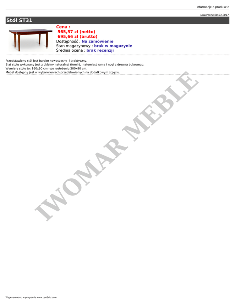 Informacje o produkcie Utworzono 08-03-2017 Stół ST31 Cena : 565,57 zł (netto) 695,66 zł (brutto) Dostępność : Na zamówienie Stan magazynowy : brak w magazynie Średnia ocena : brak recenzji IW O M AR M EB LE Przedstawiony stół jest bardzo nowoczesny i praktyczny. Blat stołu wykonany jest z okleiny naturalnej (fornir), natomiast rama i nogi z drewna bukowego. Wymiary stołu to: 160x90 cm - po rozłożeniu 200x90 cm. Mebel dostępny jest w wybarwieniach przedstawionych na dodatkowym zdjęciu. Wygenerowano w programie www.oscGold.com
