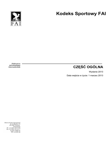 Kodeks Sportowy FAI CZĘŚĆ OGÓLNA Wydanie 2013 Data wejścia w życie: 1 marzec 2013 FEDERATION AERONAUTIQUE INTERNATIONALE MSI - Avenue de Rhodanie 54, 1007 LAUSANNE, Switzerland Copyright 2013 Polskie tłumaczenie na zlecenie Aeroklubu Polskiego - Jakub Sadowski Redakcja i korekta - Jędrzej Jaxa-Rożen Wszelkie prawa zastrzeżone. Prawa do tego dokumentu posiada Fédération Aéronautique Internationale (FAI). Każda osoba działająca w imieniu FAI lub jej Członków jest upoważniona do kopiowania, drukowania i dystrybucji tego dokumentu, pod warunkiem spełnienia poniższych zasad: Niniejszy dokument może być użyty tylko do celów informacyjnych i nie 1. może służyć do celów komercyjnych. Wszelkie kopie tego dokumentu lub jego części muszą zawierać niniejszą 2. informację prawną Należy pamiętać, że dowolny produkt, proces lub technologia opisana w dokumencie mogą być przedmiotem innych praw autorskich zastrzeżonych przez Fédération Aéronautique Internationale lub inne podmioty i powyższa licencja ich nie obejmuje. Kodeks Sportowy FAI Część Ogólna 2013 PRAWA DO MIĘDZYNARODOWYCH ZAWODÓW SPORTOWYCH Wszystkie międzynarodowe zawody sportowe organizowane w całości lub w części zgodnie z regułami Kodeksu Sportowego1 Fédération Aéronautique Internationale (FAI) są nazywane Międzynarodowymi Zawodami Sportowymi FAI2. Zgodnie ze Statutem FAI3, posiada ona i kontroluje wszystkie prawa związane z międzynarodowymi zawodami sportowymi FAI. Członkowie FAI4 winni na obszarach swoich krajów5 egzekwować prawa własności FAI do międzynarodowych zawodów sportowych FAI i wymagać, aby były rejestrowane w Kalendarzu Sportowym FAI6. Zezwolenia i uprawnienia do wykorzystania wszelkich praw do wszelkiej działalności komercyjnej na takich zawodach, włączając, lecz nie ograniczając do reklamowania zawodów lub reklamowania na zawodach, użycia nazwy lub logotypu zawodów dla celów handlowych oraz użycia jakichkolwiek nagrań lub zdjęć, zarejestrowanych cyfrowo lub inną metodą, czy też transmitowanych na żywo, muszą zostać przekazane na drodze umowy z FAI. Obejmuje to w szczególności wszelkie prawa do używania jakiegokolwiek materiału, zarówno elektronicznego jak i innego, który tworzy część którejkolwiek metody lub systemu sędziowania, oceniania, mierzenia osiągów lub informowania użytkowanych w jakichkolwiek międzynarodowych zawodach lotniczych FAI.7. Każda Komisja Sportu Lotniczego8 jest uprawniona do wcześniejszego negocjowania umów w imieniu FAI z członkami FAI lub innymi właściwymi jednostkami, gdzie będzie mowa o przeniesieniu całości lub części praw do którychkolwiek międzynarodowych zawodów lotniczych FAI (wyłączając zawody Igrzysk Sportów Lotniczych9), które są organizowane w całości lub częściowo zgodnie z częścią Kodeksu Sportowego10 za którą Komisja jest odpowiedzialna11. Każde takie przekazanie praw winno być zawarte w formie “Umowy Organizatora”12, jak określono w aktualnym Rozdziale Rozporządzeń FAI, punkt 1.2 “Zasady przekazywania praw do międzynarodowych zawodów sportowych”. Każda osoba fizyczna lub prawna, która przyjmuje odpowiedzialność za organizowanie zawodów sportowych FAI, czy to na podstawie pisemnej umowy, czy też bez niej, akceptuje jednocześnie w prawa własności FAI opisane powyżej. Tam, gdzie nie przeniesiono praw na mocy pisemnej umowy, FAI zachowuje wszelkie prawa związane z zawodami. Bez względu na jakąkolwiek umowę o przeniesieniu praw, FAI winno mieć darmowy, pełny dostęp do jakichkolwiek dźwięków i/lub obrazów graficznych wszelkich zawodów sportowych na swój użytek w celach archiwalnych i/lub promocyjnych. Statut FAI, Rozdział 1, punkt 1.6 Kodeks Sportowy FAI, Część Ogólna, Rozdział 3, punkt 3.1.3. 3 Statut FAI, Rozdział 1, punkt 1.8.1 4 Statut FAI, Rozdział 2, punkt 2.1.1; 2.4.2; 2.5.2 i 2.7.2 5 Rozporządzenia FAI, Rozdział 1, punkt 1.2.1 6 Statut FAI, Rozdział 2, punkt 2.4.2.2.5, 7 Rozporządzenia FAI, Rozdział 1, punkt 1.2.3 8 Statut FAI, Rozdział 5, punkt 5.1.1; 5.5 i 5.6 9 Kodeks Sportowy FAI, Część Ogólna, Rozdział 3, punkt 3.1.7 10 Kodeks Sportowy FAI, Część Ogólna, Rozdział 1, punkty 1.2. i 1.4 11 Statut FAI, Rozdział 5, punkt 5.6.3 12 Rozporządzenia FAI, Rozdział 1, punkt 1.2.2 1 2 Kodeks Sportowy FAI Część Ogólna 2013 CZĘŚĆ OGÓLNA KODEKSU SPORTOWEGO FAI WYDANIE 2012 REJESTR ZMIAN Poprawki i pełne aktualne wersje Części Ogólnej Kodeksu Sportowego są publikowane przez Sekretariat FAI, działający w imieniu Komisji Ogólnej Sportów Lotniczych (po francusku: Commission Aéronautique Sportive Internationale (CASI). Po uzgodnieniu poprawki, na odpowiedniej stronie internetowej zostanie opublikowany kompletny nowy Statut, gdy tylko będzie gotowy. Będzie on obowiązywał od pierwszego dnia miesiąca wprowadzenia w życie. Będzie to zazwyczaj drugi lub trzeci miesiąc po tym, gdy odbyło się odpowiednie zebranie CASI. Odnośnik do strony FAI zawierającej najnowszą wersję Części Ogólnej jest następujący: http://www.fai.org/documents/sportingcode/GeneralSection_download (AL11) Za zapewnienie w poszczególnych krajach, że ich przedstawiciele i inni posiadacze Części Ogólnej Kodeksu Sportowego są świadomi powyższego oraz stosują właściwą wersję na dany rok odpowiedzialny jest Krajowy Nadzór Sportu Lotniczego (NAC - National Airsport Control). Do takich osób funkcyjnych należą przedstawiciele, włączając członków odpowiednich komisji, dyrektorzy mistrzostw, sędziowie, oficjalni obserwatorzy i inne osoby potrzebujące korzystać z kopii Kodeksu Sportowego.(AL7) Numer zmiany względem wydania z 1996 DATA ZMIAN 1 1 stycznia 1997 2 1 stycznia 1998 3 1 stycznia 1999 4 1 stycznia 2000 5 1 stycznia 2001 6 1 stycznia 2002 7 1 stycznia 2003 8 1 kwietnia 2004 9 1 lipca 2005 10 31 stycznia 2006 11 7 maja 2008 12 21 stycznia 2009 13 1 stycznia 2010 14 1 stycznia 2011