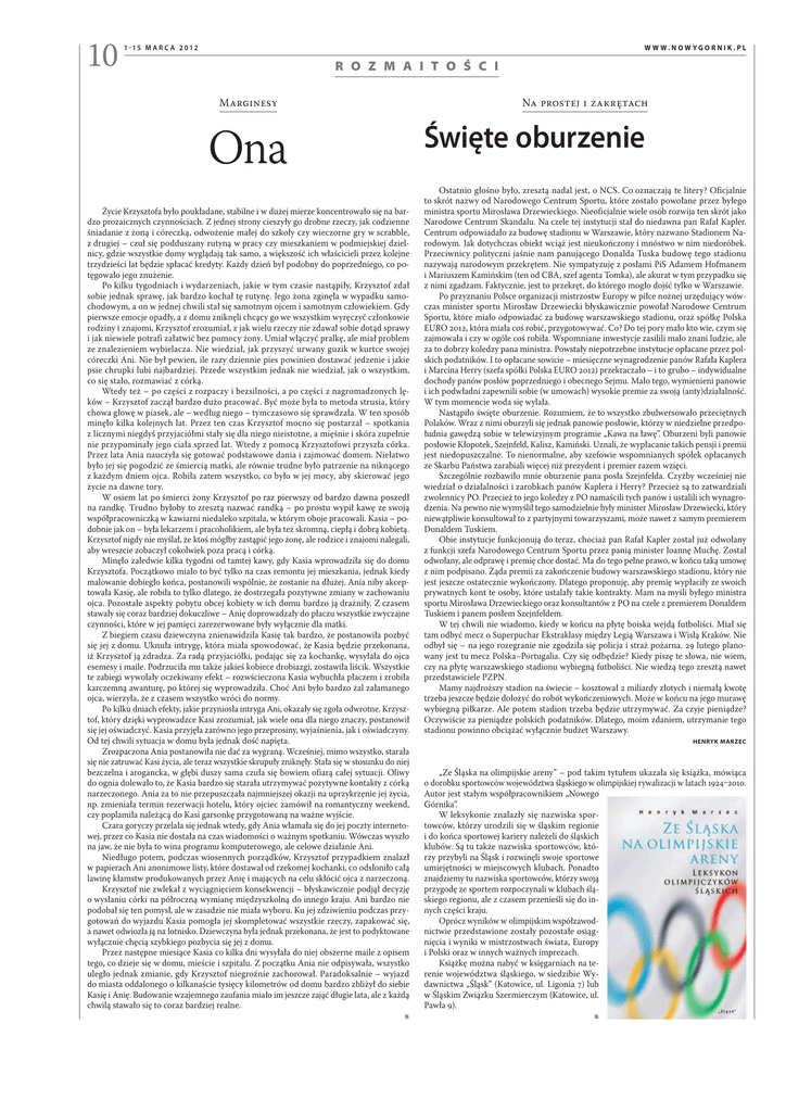 10 W W W.NOW YGORNIK.PL 1-15 M A R C A 2 012 R O Z M A I T O Ś C I M Ona Życie Krzysztofa było poukładane, stabilne i w dużej mierze koncentrowało się na bardzo prozaicznych czynnościach. Z jednej strony cieszyły go drobne rzeczy, jak codzienne śniadanie z żoną i córeczką, odwożenie małej do szkoły czy wieczorne gry w scrabble, z drugiej – czuł się podduszany rutyną w pracy czy mieszkaniem w podmiejskiej dzielnicy, gdzie wszystkie domy wyglądają tak samo, a większość ich właścicieli przez kolejne trzydzieści lat będzie spłacać kredyty. Każdy dzień był podobny do poprzedniego, co potęgowało jego znużenie. Po kilku tygodniach i wydarzeniach, jakie w tym czasie nastąpiły, Krzysztof zdał sobie jednak sprawę, jak bardzo kochał tę rutynę. Jego żona zginęła w wypadku samochodowym, a on w jednej chwili stał się samotnym ojcem i samotnym człowiekiem. Gdy pierwsze emocje opadły, a z domu zniknęli chcący go we wszystkim wyręczyć członkowie rodziny i znajomi, Krzysztof zrozumiał, z jak wielu rzeczy nie zdawał sobie dotąd sprawy i jak niewiele potrafi załatwić bez pomocy żony. Umiał włączyć pralkę, ale miał problem ze znalezieniem wybielacza. Nie wiedział, jak przyszyć urwany guzik w kurtce swojej córeczki Ani. Nie był pewien, ile razy dziennie pies powinien dostawać jedzenie i jakie psie chrupki lubi najbardziej. Przede wszystkim jednak nie wiedział, jak o wszystkim, co się stało, rozmawiać z córką. Wtedy też – po części z rozpaczy i bezsilności, a po części z nagromadzonych lęków – Krzysztof zaczął bardzo dużo pracować. Być może była to metoda strusia, który chowa głowę w piasek, ale – według niego – tymczasowo się sprawdzała. W ten sposób minęło kilka kolejnych lat. Przez ten czas Krzysztof mocno się postarzał – spotkania z licznymi niegdyś przyjaciółmi stały się dla niego nieistotne, a mięśnie i skóra zupełnie nie przypominały jego ciała sprzed lat. Wtedy z pomocą Krzysztofowi przyszła córka. Przez lata Ania nauczyła się gotować podstawowe dania i zajmować domem. Niełatwo było jej się pogodzić ze śmiercią matki, ale równie trudne było patrzenie na niknącego z każdym dniem ojca. Robiła zatem wszystko, co było w jej mocy, aby skierować jego życie na dawne tory. W osiem lat po śmierci żony Krzysztof po raz pierwszy od bardzo dawna poszedł na randkę. Trudno byłoby to zresztą nazwać randką – po prostu wypił kawę ze swoją współpracowniczką w kawiarni niedaleko szpitala, w którym oboje pracowali. Kasia – podobnie jak on – była lekarzem i pracoholikiem, ale była też skromną, ciepłą i dobrą kobietą. Krzysztof nigdy nie myślał, że ktoś mógłby zastąpić jego żonę, ale rodzice i znajomi nalegali, aby wreszcie zobaczył cokolwiek poza pracą i córką. Minęło zaledwie kilka tygodni od tamtej kawy, gdy Kasia wprowadziła się do domu Krzysztofa. Początkowo miało to być tylko na czas remontu jej mieszkania, jednak kiedy malowanie dobiegło końca, postanowili wspólnie, że zostanie na dłużej. Ania niby akceptowała Kasię, ale robiła to tylko dlatego, że dostrzegała pozytywne zmiany w zachowaniu ojca. Pozostałe aspekty pobytu obcej kobiety w ich domu bardzo ją drażniły. Z czasem stawały się coraz bardziej dokuczliwe – Anię doprowadzały do płaczu wszystkie zwyczajne czynności, które w jej pamięci zarezerwowane były wyłącznie dla matki. Z biegiem czasu dziewczyna znienawidziła Kasię tak bardzo, że postanowiła pozbyć się jej z domu. Uknuła intrygę, która miała spowodować, że Kasia będzie przekonana, iż Krzysztof ją zdradza. Za radą przyjaciółki, podając się za kochankę, wysyłała do ojca esemesy i maile. Podrzuciła mu także jakieś kobiece drobiazgi, zostawiła liścik. Wszystkie te zabiegi wywołały oczekiwany efekt – rozwścieczona Kasia wybuchła płaczem i zrobiła karczemną awanturę, po której się wyprowadziła. Choć Ani było bardzo żal załamanego ojca, wierzyła, że z czasem wszystko wróci do normy. Po kilku dniach efekty, jakie przyniosła intryga Ani, okazały się zgoła odwrotne. Krzysztof, który dzięki wyprowadzce Kasi zrozumiał, jak wiele ona dla niego znaczy, postanowił się jej oświadczyć. Kasia przyjęła zarówno jego przeprosiny, wyjaśnienia, jak i oświadczyny. Od tej chwili sytuacja w domu była jednak dość napięta. Zrozpaczona Ania postanowiła nie dać za wygraną. Wcześniej, mimo wszystko, starała się nie zatruwać Kasi życia, ale teraz wszystkie skrupuły zniknęły. Stała się w stosunku do niej bezczelna i arogancka, w głębi duszy sama czuła się bowiem ofiarą całej sytuacji. Oliwy do ognia dolewało to, że Kasia bardzo się starała utrzymywać pozytywne kontakty z córką narzeczonego. Ania za to nie przepuszczała najmniejszej okazji na uprzykrzenie jej życia, np. zmieniała termin rezerwacji hotelu, który ojciec zamówił na romantyczny weekend, czy poplamiła należącą do Kasi garsonkę przygotowaną na ważne wyjście. Czara goryczy przelała się jednak wtedy, gdy Ania włamała się do jej poczty internetowej, przez co Kasia nie dostała na czas wiadomości o ważnym spotkaniu. Wówczas wyszło na jaw, że nie była to wina programu komputerowego, ale celowe działanie Ani. Niedługo potem, podczas wiosennych porządków, Krzysztof przypadkiem znalazł w papierach Ani anonimowe listy, które dostawał od rzekomej kochanki, co odsłoniło całą lawinę kłamstw produkowanych przez Anię i mających na celu skłócić ojca z narzeczoną. Krzysztof nie zwlekał z wyciągnięciem konsekwencji – błyskawicznie podjął decyzję o wysłaniu córki na półroczną wymianę międzyszkolną do innego kraju. Ani bardzo nie podobał się ten pomysł, ale w zasadzie nie miała wyboru. Ku jej zdziwieniu podczas przygotowań do wyjazdu Kasia pomogła jej skompletować wszystkie rzeczy, zapakować się, a nawet odwiozła 