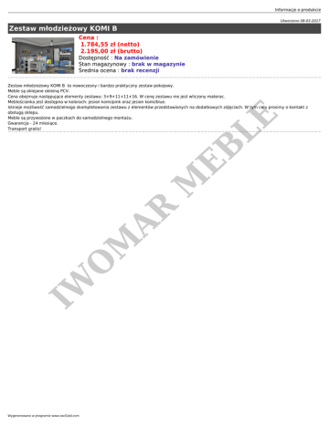 Informacje o produkcie Utworzono 08-03-2017 Zestaw młodzieżowy KOMI B Cena : 1.784,55 zł (netto) 2.195,00 zł (brutto) Dostępność : Na zamówienie Stan magazynowy : brak w magazynie Średnia ocena : brak recenzji IW O M AR M EB LE Zestaw młodzieżowy KOMI B to nowoczesny i bardzo praktyczny zestaw pokojowy. Meble są oklejane okleiną PCV. Cena obejmuje następujące elementy zestawu: 3+9+11+11+16. W cenę zestawu nie jest wliczony materac. Meblościanka jest dostępna w kolorach: jesion komi/pink oraz jesion komi/blue. Istnieje możliwość samodzielnego skompletowania zestawu z elementów przedstawionych na dodatkowych zdjęciach. W tym celu prosimy o kontakt z obsługą sklepu. Meble są przywożone w paczkach do samodzielnego montażu. Gwarancja - 24 miesiące. Transport gratis! Wygenerowano w programie www.oscGold.com