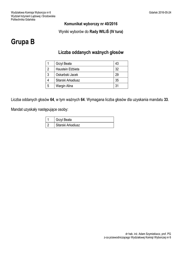 Wydziałowa Komisja Wyborcza nr 6 Wydział Inżynierii Lądowej i Środowiska Politechnika Gdańska Gdańsk 2016-05-24 Komunikat wyborczy nr 40/2016 Wyniki wyborów do Rady WILiŚ (IV tura) Grupa B Liczba oddanych ważnych głosów 1 Grzyl Beata 43 2 Haustein Elżbieta 32 3 Oskarbski Jacek 29 4 Sitarski Arkadiusz 35 5 Wargin Alina 31 Liczba oddanych głosów 64, w tym ważnych 64. Wymagana liczba głosów dla uzyskania mandatu 33. Mandat uzyskały następujące osoby: 1 Grzyl Beata 2 Sitarski Arkadiusz dr hab. inż. Adam Szymiekiwcz, prof. PG z-ca przewodniczącego Wydziałowej Komisji Wyborczej nr 6
