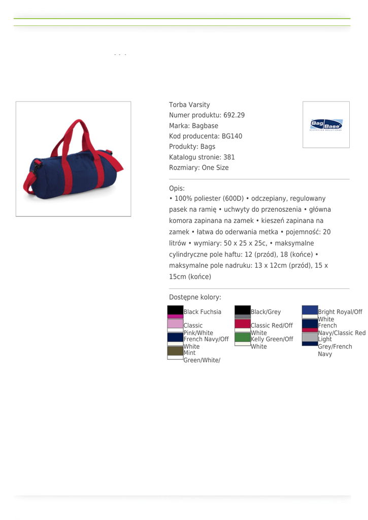 - - - Torba Varsity Numer produktu: 692.29 Marka: Bagbase Kod producenta: BG140 Produkty: Bags Katalogu stronie: 381 Rozmiary: One Size Opis: • 100% poliester (600D) • odczepiany, regulowany pasek na ramię • uchwyty do przenoszenia • główna komora zapinana na zamek • kieszeń zapinana na zamek • łatwa do oderwania metka • pojemność: 20 litrów • wymiary: 50 x 25 x 25c, • maksymalne cylindryczne pole haftu: 12 (przód), 18 (końce) • maksymalne pole nadruku: 13 x 12cm (przód), 15 x 15cm (końce) Dostępne kolory: Black Fuchsia Black/Grey Classic Pink/White French Navy/Off White Mint Green/White/ Classic Red/Off White Kelly Green/Off White Bright Royal/Off White French Navy/Classic Red Light Grey/French Navy
