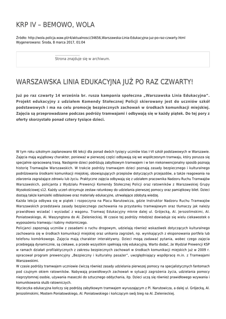 KRP IV – BEMOWO, WOLA Źródło: http://wola.policja.waw.pl/r4/aktualnosci/34656,Warszawska-Linia-Edukacyjna-juz-po-raz-czwarty.html Wygenerowano: Środa, 8 marca 2017, 01:04 Strona znajduje się w archiwum. WARSZAWSKA LINIA EDUKACYJNA JUŻ PO RAZ CZWARTY! Już po raz czwarty 14 września br. rusza kampania społeczna „Warszawska Linia Edukacyjna”. Projekt edukacyjny z udziałem Komendy Stołecznej Policji skierowany jest do uczniów szkół podstawowych i ma na celu promocję bezpiecznych zachowań w środkach komunikacji miejskiej. Zajęcia są przeprowadzane podczas podróży tramwajami i odbywają się w każdy piątek. Do tej pory z oferty skorzystało ponad cztery tysiące dzieci. W tym roku szkolnym zaplanowano 66 lekcji dla ponad dwóch tysięcy uczniów klas I-VI szkół podstawowych w Warszawie. Zajęcia mają wyjątkowy charakter, ponieważ w pierwszej części odbywają się we współczesnym tramwaju, który porusza się specjalnie opracowaną trasą. Następnie dzieci podróżują zabytkowym tramwajem i w ten niekonwencjonalny sposób poznają historię Tramwajów Warszawskich. W trakcie podróży tramwajem dzieci poznają zasady bezpiecznego i kulturalnego podróżowania środkami komunikacji miejskiej, obowiązujących przepisów dotyczących przejazdów, a także reagowania na zdarzenia zagrażające zdrowiu lub życiu. Praktyczne zajęcia odbywają się z udziałem pracownika Nadzoru Ruchu Tramwajów Warszawskich, policjanta z Wydziału Prewencji Komendy Stołecznej Policji oraz ratowników z Warszawskiej Grupy Wysokościowej s12. Każdy uczeń otrzymuje zestaw ratunkowy do udzielania pierwszej pomocy oraz pamiątkowy bilet. Dzieci dostają także kamizelki odblaskowe oraz materiały edukacyjne, utrwalające zdobytą wiedzę. Każda lekcja odbywa się w piątek i rozpoczyna na Placu Narutowicza, gdzie Instruktor Nadzoru Ruchu Tramwajów Warszawskich przedstawia zasady bezpiecznego zachowania na przystanku tramwajowym oraz tłumaczy jak należy prawidłowo wsiadać i wysiadać z wagonu. Tramwaj Edukacyjny mknie dalej ul. Grójecką, Al. Jerozolimskimi, Al. Poniatowskiego, Al. Waszyngtona do Al. Zielenieckiej. W czasie tej podróży młodzież dowiaduje się wielu ciekawostek o wyposażeniu tramwaju i kabiny motorniczego. Policjanci zapoznają uczniów z zasadami o ruchu drogowym, udzielają również wskazówek dotyczących kulturalnego zachowania się w środkach komunikacji miejskiej oraz unikania zagrożeń, np. wynikających z eksponowania portfela lub telefonu komórkowego. Zajęcia mają charakter interaktywny. Dzieci mogą zadawać pytania, wobec czego zajęcia przebiegają dynamicznie, są ciekawe, a przede wszystkim spełniają rolę edukacyjną. Warto dodać, że Wydział Prewencji KSP w ramach działań profilaktycznych z zakresu bezpiecznych zachowań w środkach komunikacji miejskich już w 2009 r. opracował program prewencyjny „Bezpieczny i kulturalny pasażer”, uwzględniający współpracę m.in. z Tramwajami Warszawskimi. W czasie podróży tramwajem uczniowie ćwiczą również zasady udzielania pierwszej pomocy na specjalistycznych fantomach pod czujnym okiem ratowników. Nabywają prawidłowych zachowań w sytuacji zagrożenia życia, udzielania pomocy nieprzytomnej osobie, używania maseczki do sztucznego oddychania, itp. Dzieci uczą się również prawidłowego wzywania i komunikowania służb ratowniczych. Wycieczka edukacyjna kończy się podróżą zabytkowym tramwajem wyruszającym z Pl. Narutowicza, a dalej ul. Grójecką, Al. Jerozolimskimi, Mostem Poniatowskiego, Al. Poniatowskiego i kończącym swój bieg na Al. Zielenieckiej. Organizatorzy Warszawskiej Linii Edukacyjnej zapraszają do udziału w projekcie wyłącznie klasy I-VI ze szkół podstawowych w Warszawie. Zgłoszenia klasy należy kierować na adres: [email protected]. Ilość miejsc ograniczona. Decyduje kolejność zgłoszeń! W celu dokonania zgłoszenia należy podać: 1. w tytule e-maila: „Zapisy na WLE”, 2. w treści e-maila następujące dane: a) Nazwa i numer szkoły b) Numer klasy c) Liczba uczniów d) Liczba opiekunów e) Imię, nazwisko, tel. kom., adres e-mail do wychowawcy klasy. Lekcja jest bezpłatna. W jednej lekcji może wziąć udział max. jedna klasa. Bezpośrednio przed rozpoczęciem lekcji należy dostarczyć: 1. Dokument potwierdzający ubezpieczenie (NWW) dzieci. 2. Zgodę rodziców dzieci na bezterminowe wykorzystanie wizerunku uczestników przez Tramwaje Warszawskie w celach promocyjnych kampanii społecznej Warszawska Linia Edukacyjna. SERDECZNIE ZAPRASZAMY! Więcej informacji na stronie http://www.warszawskaliniaedukacyjna.pl/ Ocena: 0/5 (0) Tweetnij