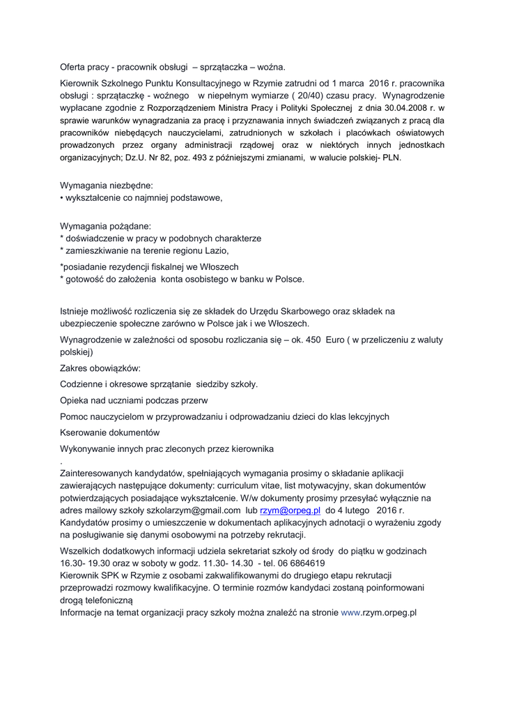 Oferta pracy - pracownik obsługi – sprzątaczka – woźna. Kierownik Szkolnego Punktu Konsultacyjnego w Rzymie zatrudni od 1 marca 2016 r. pracownika obsługi : sprzątaczkę - woźnego w niepełnym wymiarze ( 20/40) czasu pracy. Wynagrodzenie wypłacane zgodnie z Rozporządzeniem Ministra Pracy i Polityki Społecznej z dnia 30.04.2008 r. w sprawie warunków wynagradzania za pracę i przyznawania innych świadczeń związanych z pracą dla pracowników niebędących nauczycielami, zatrudnionych w szkołach i placówkach oświatowych prowadzonych przez organy administracji rządowej oraz w niektórych innych jednostkach organizacyjnych; Dz.U. Nr 82, poz. 493 z późniejszymi zmianami, w walucie polskiej- PLN. Wymagania niezbędne: • wykształcenie co najmniej podstawowe, Wymagania pożądane: * doświadczenie w pracy w podobnych charakterze * zamieszkiwanie na terenie regionu Lazio, *posiadanie rezydencji fiskalnej we Włoszech * gotowość do założenia konta osobistego w banku w Polsce. Istnieje możliwość rozliczenia się ze składek do Urzędu Skarbowego oraz składek na ubezpieczenie społeczne zarówno w Polsce jak i we Włoszech. Wynagrodzenie w zależności od sposobu rozliczania się – ok. 450 Euro ( w przeliczeniu z waluty polskiej) Zakres obowiązków: Codzienne i okresowe sprzątanie siedziby szkoły. Opieka nad uczniami podczas przerw Pomoc nauczycielom w przyprowadzaniu i odprowadzaniu dzieci do klas lekcyjnych Kserowanie dokumentów Wykonywanie innych prac zleconych przez kierownika . Zainteresowanych kandydatów, spełniających wymagania prosimy o składanie aplikacji zawierających następujące dokumenty: curriculum vitae, list motywacyjny, skan dokumentów potwierdzających posiadające wykształcenie. W/w dokumenty prosimy przesyłać wyłącznie na adres mailowy szkoły [email protected] lub [email protected] do 4 lutego 2016 r. Kandydatów prosimy o umieszczenie w dokumentach aplikacyjnych adnotacji o wyrażeniu zgody na posługiwanie się danymi osobowymi na potrzeby rekrutacji. Wszelkich dodatkowych informacji udziela sekretariat szkoły od środy do piątku w godzinach 16.30- 19.30 oraz w soboty w godz. 11.30- 14.30 - tel. 06 6864619 Kierownik SPK w Rzymie z osobami zakwalifikowanymi do drugiego etapu rekrutacji przeprowadzi rozmowy kwalifikacyjne. O terminie rozmów kandydaci zostaną poinformowani drogą telefoniczną Informacje na temat organizacji pracy szkoły można znaleźć na stronie www.rzym.orpeg.pl